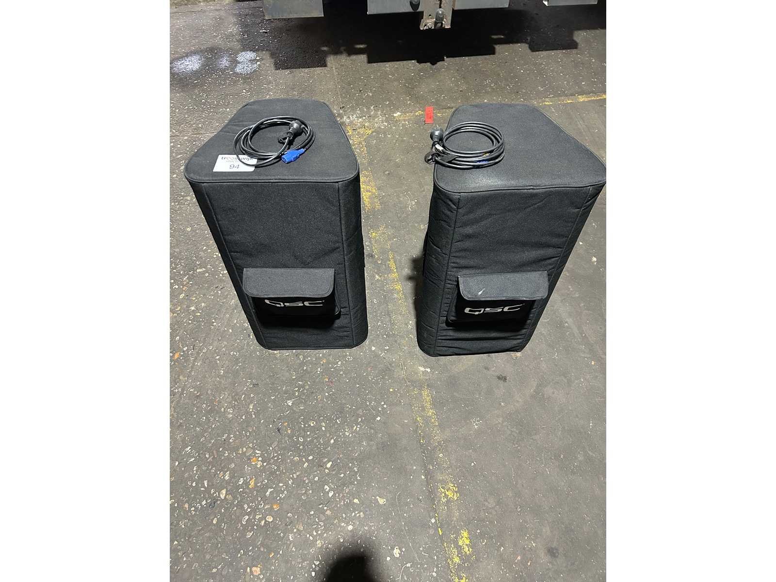 Goede staat Set van 2 speakers met hoes en stroomkabel Merk: QSC Type: kW152
