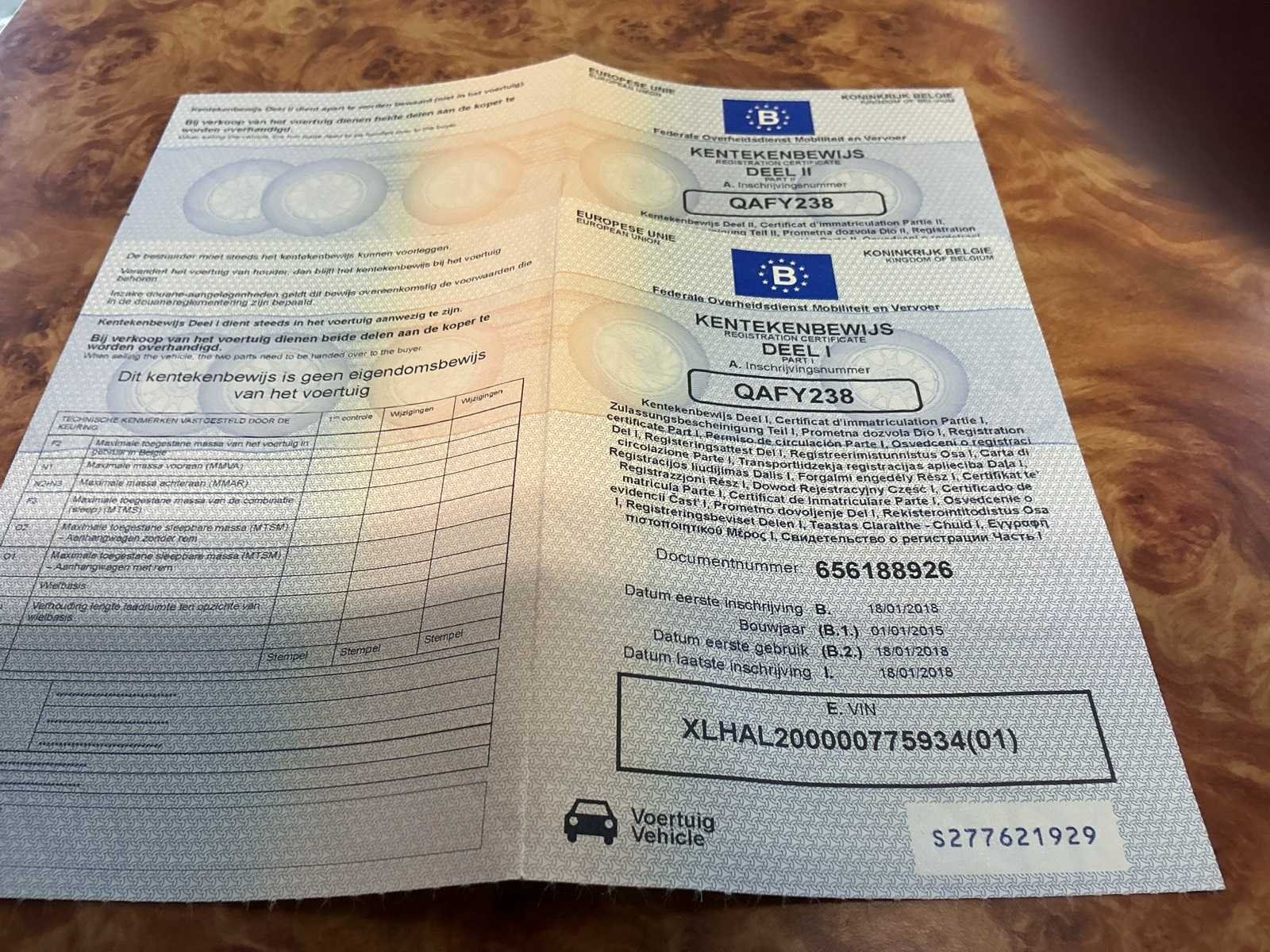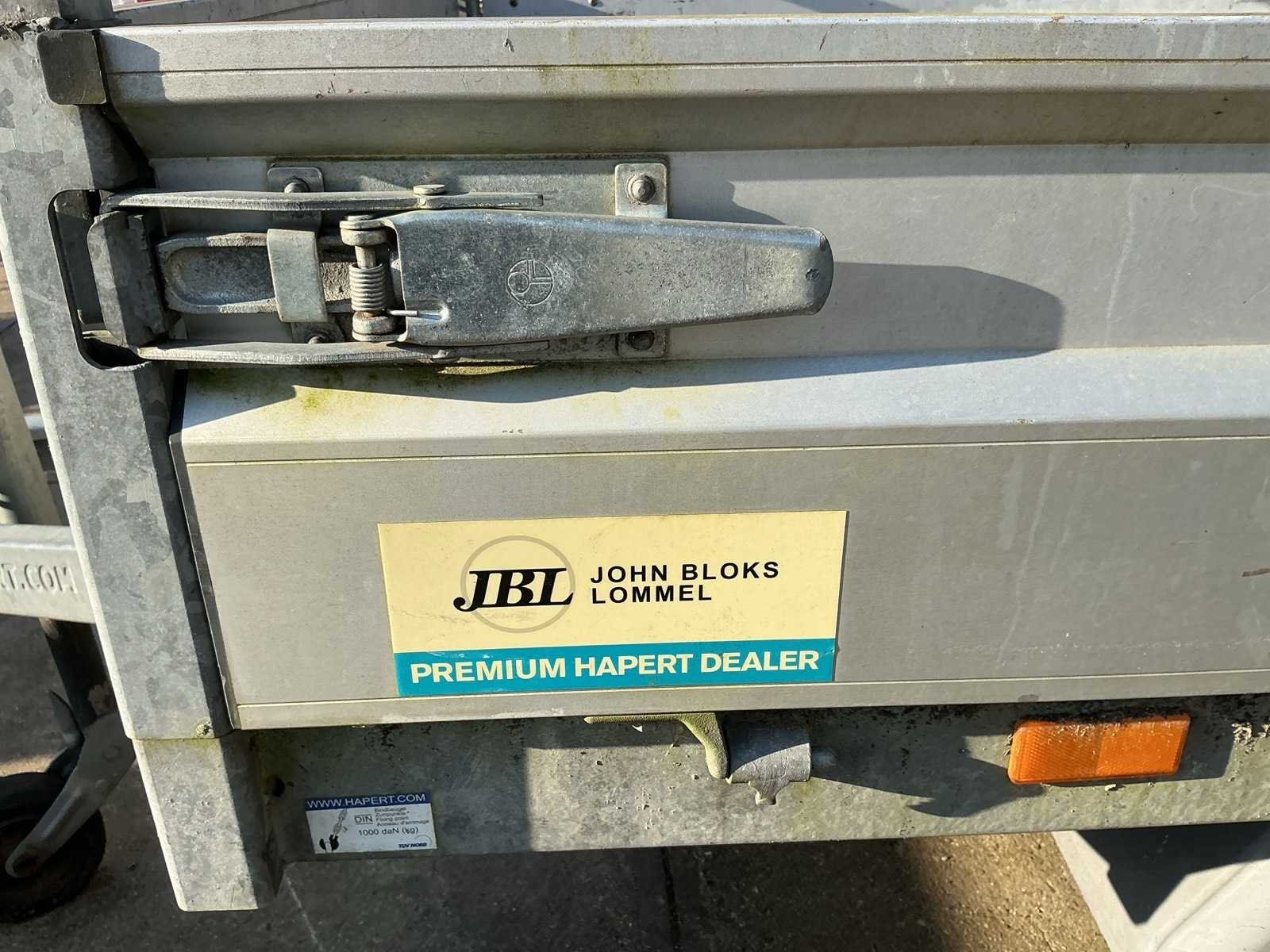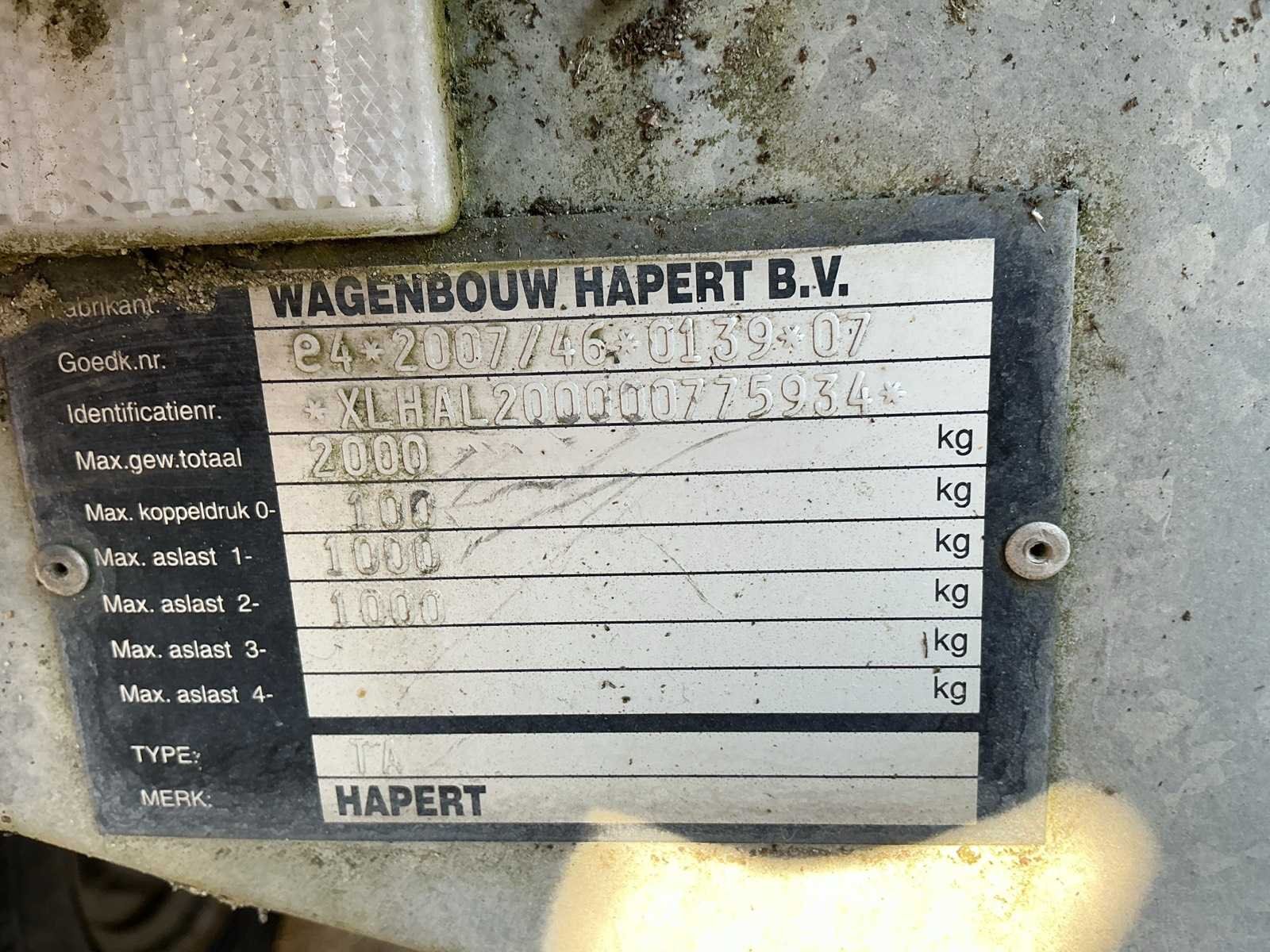 Kentekenbewijs deel 1 en deel 2 aanwezig Merk: Hapert Type: TA Model: C29A Bouwjaar: 2015 Chassisnummer: XLHAL200000775934(01) Aantal assen: 2 Laadbak afmeting l: 265cm Laadbak afmeting b: 155cm Ledig gewicht: 390kg Laadvermogen: 2000kg Datum eerste toelating: 18/012018 Kentekenpapieren compleet?: true Hoogte: 103cm Nationaliteit documenten: België