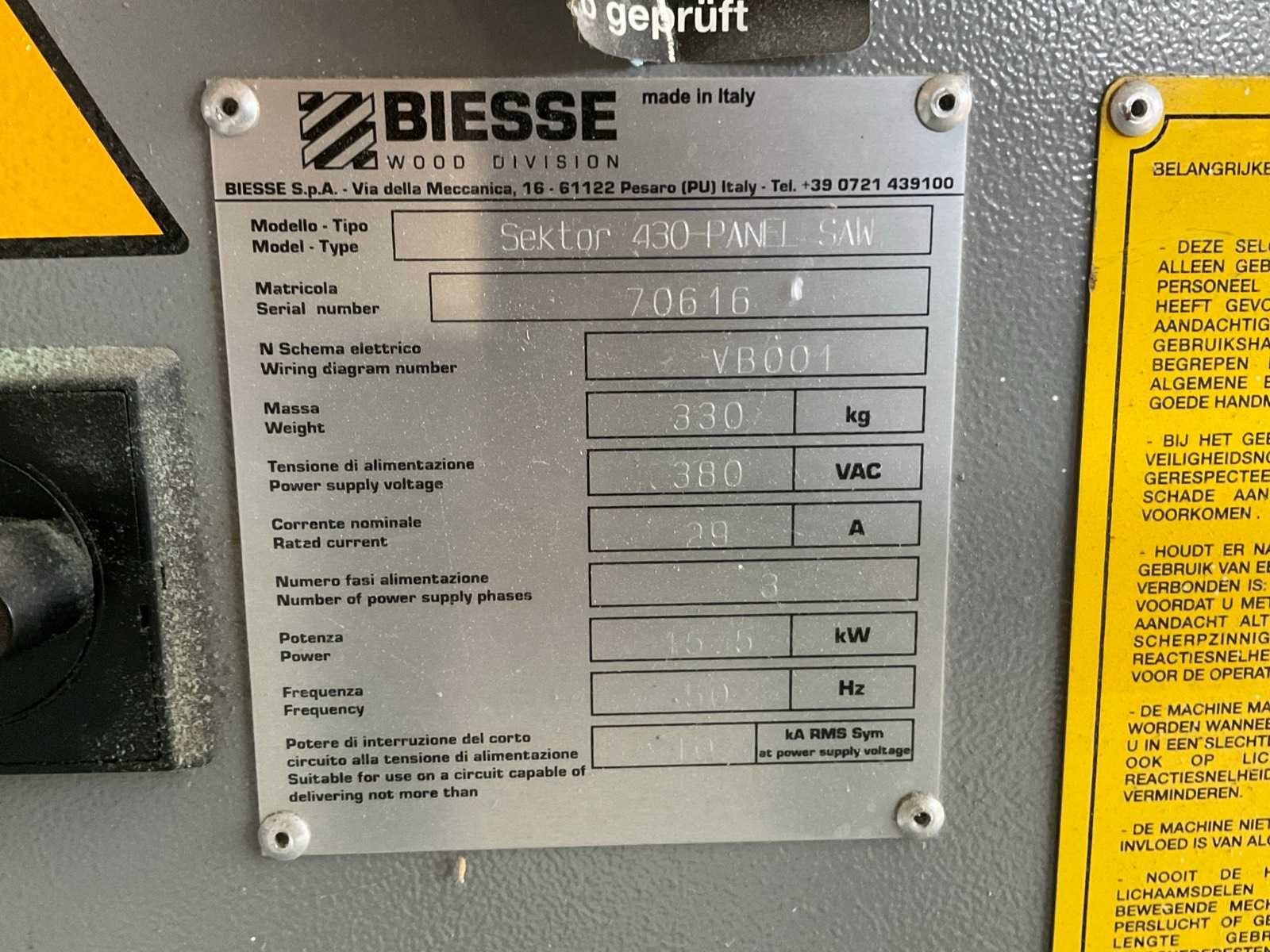 Met afzuiging Merk: Biesse Type: Sektor 430 Aansluiting: 380V Machinegewicht: 4450kg Motorvermogen (kW): 15.5kW Totale afmeting L: 5700mm Totale afmeting Breedte: 5850mm