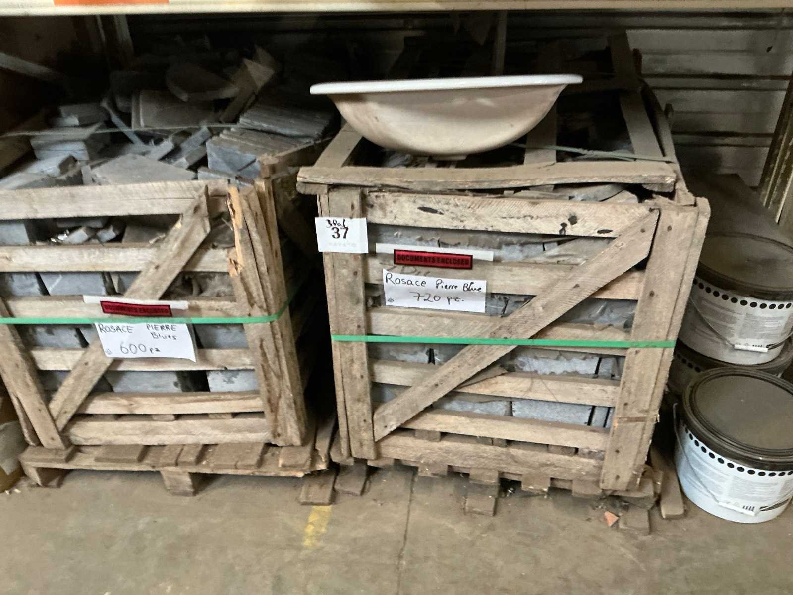 Waaronder met afmetingen ca. 20 x 20cm, 17 x 20cm en 13 x 17cm. Liggende in/op 3x pallet. Merk: Rosace Kleur: Pierre Blues