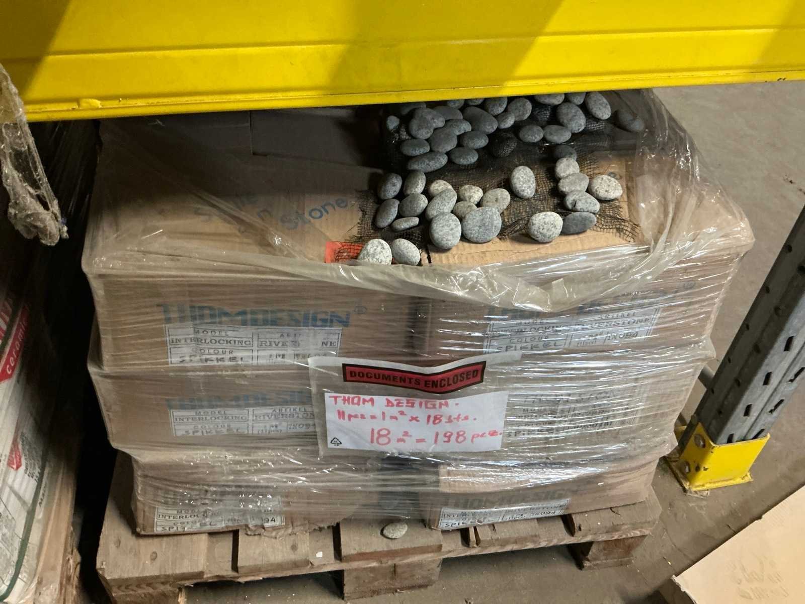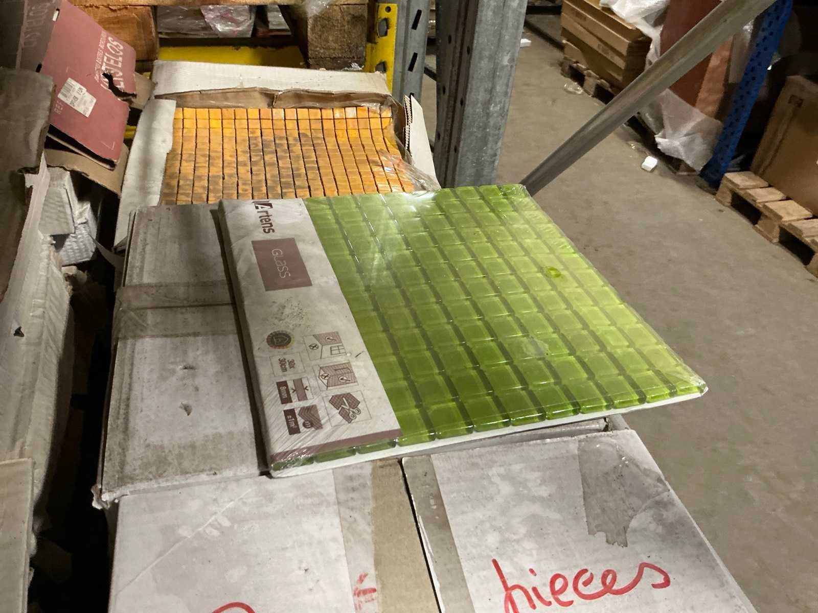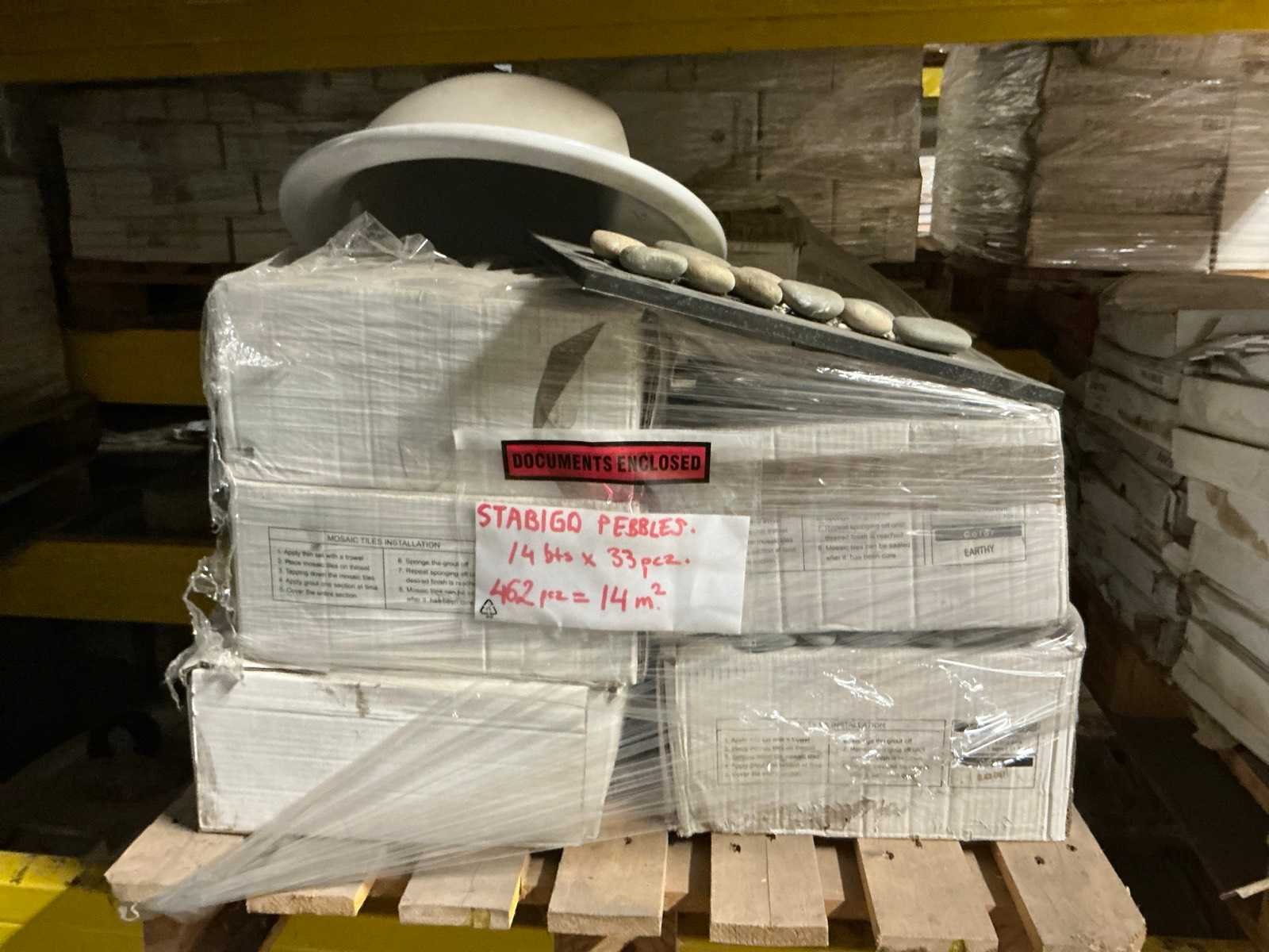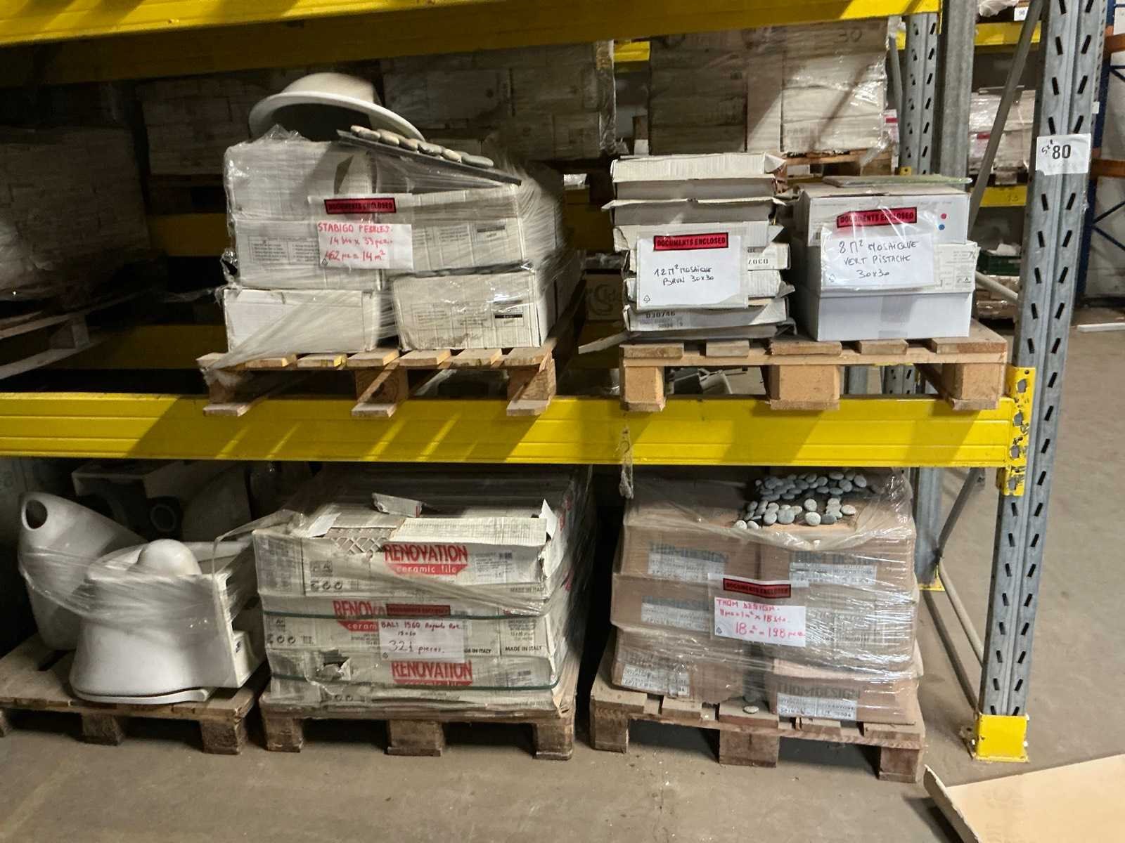 Waaronder Mosaique 8m2 groen en 12m2 bruin 30x30cm, 14m2 Stabigo Pebbles , Marazzi 10x10cm Peanut, 18m2 Pebbles Thomdesign Riverstone 30x30cm, Renovation Bali Argento 15x60, compleet met 5 diverse toiletten