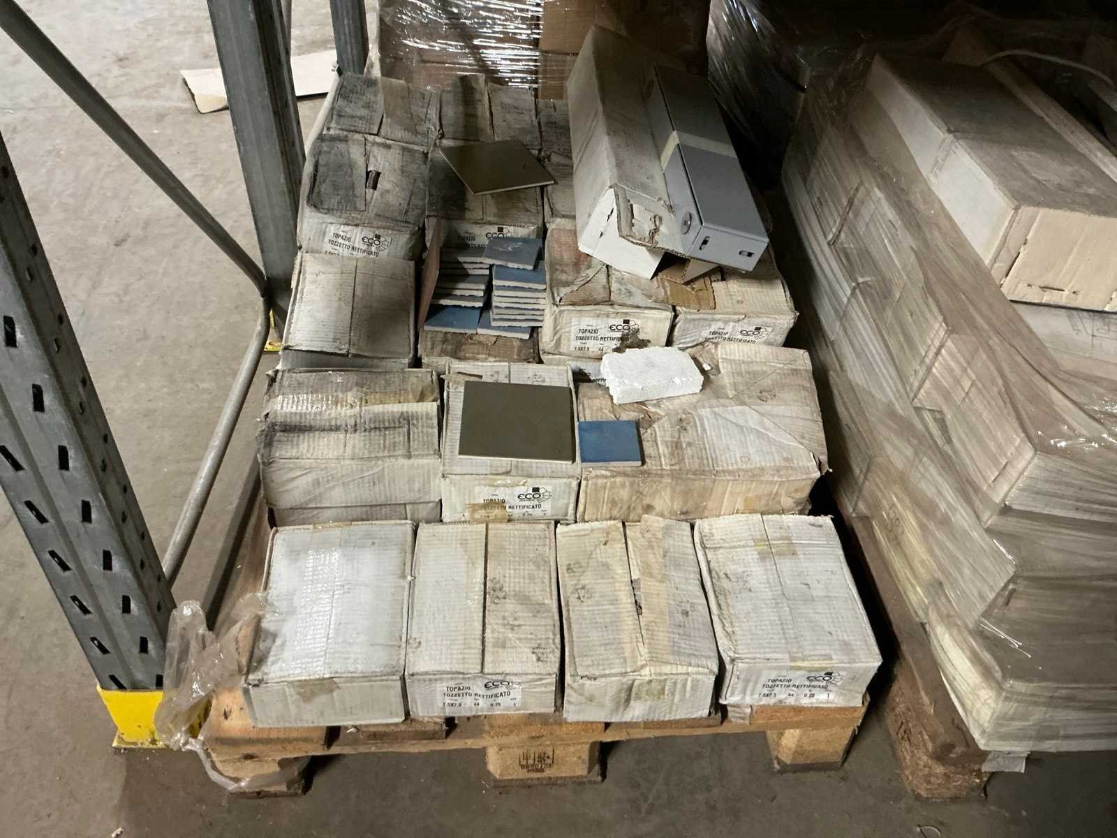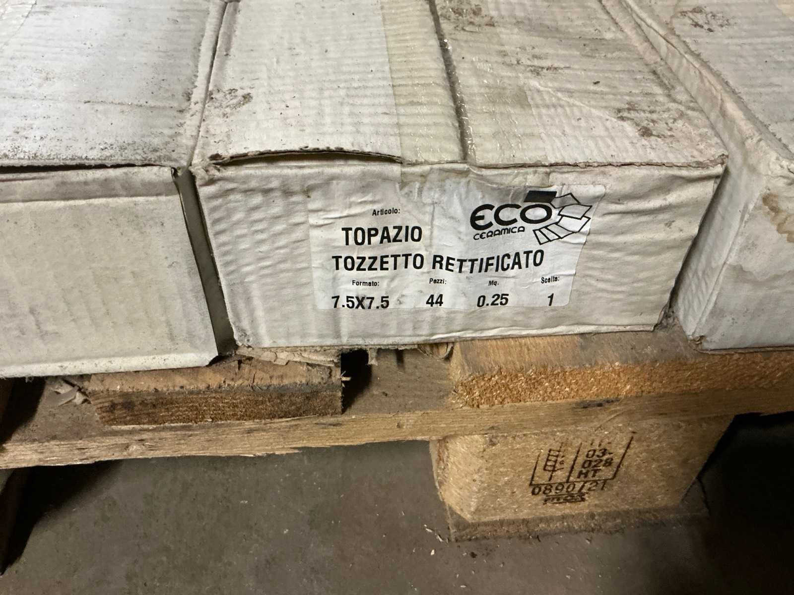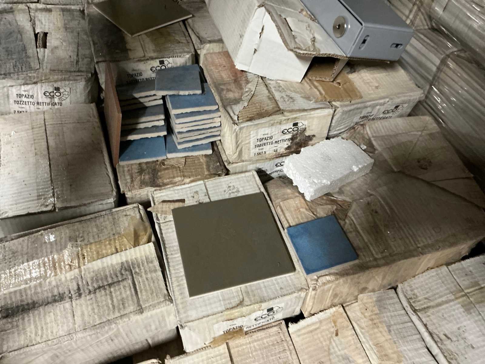Waaronder Eco Ceramica Topazio Tozzetto 7,5x7,5, 40m2 keramische tegels Linerr zwart 72x25cm, Gres porcelanico Olympe 730 7x30, 370m plinten gres cerame 8x30cm, 5 palletten, compleet ge fixaties voor badkamermeubels