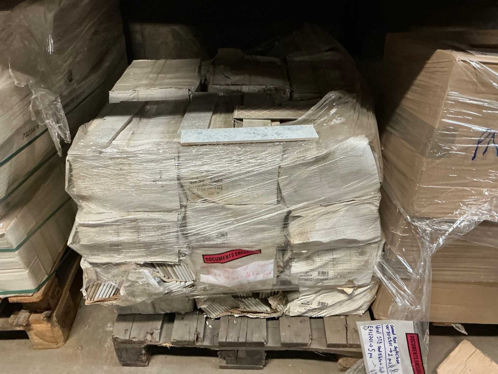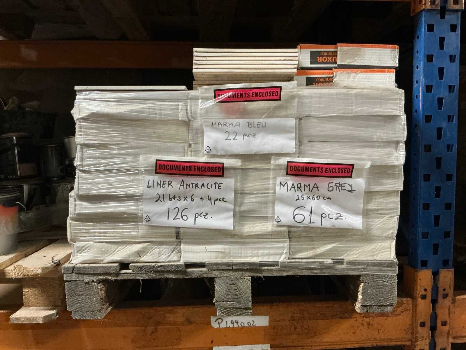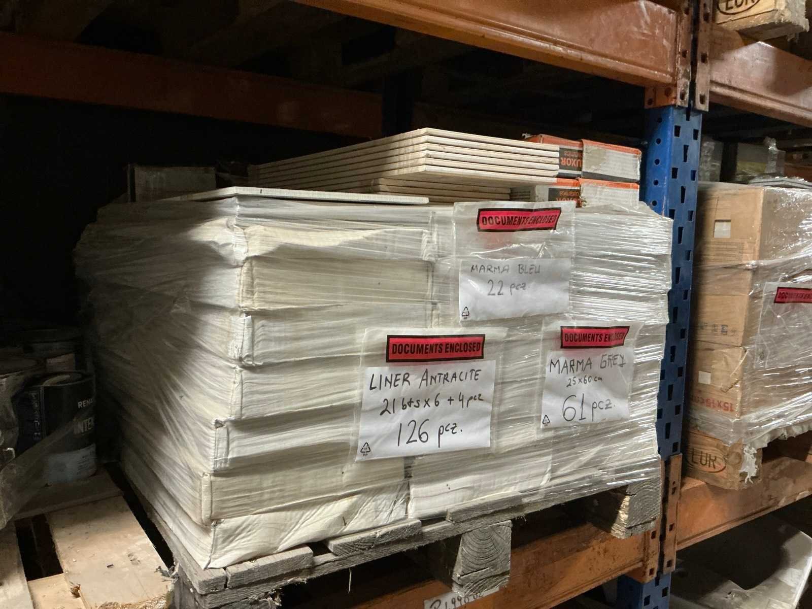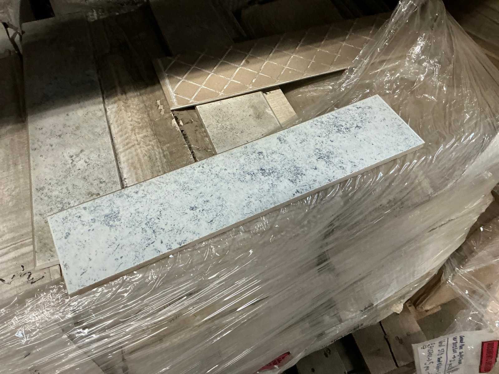 Waaronder plinten SMOV Battiscopa Ghiaccio 8x33,3 (ca. 1600st), ca. 900 plinten 10x32cm, ca. 40 decoratieve boorden 30x60cm Marrazzi, partij pebbles waaronder ca. 23m2 Starigo Earthy 10x30cm, WC inbouwframe IdealStandard Prosys 120M, wastafel Porcher 55cm, partij badkamermeubels.., tussenwande piscijn, liggende in rek (zonder rek)