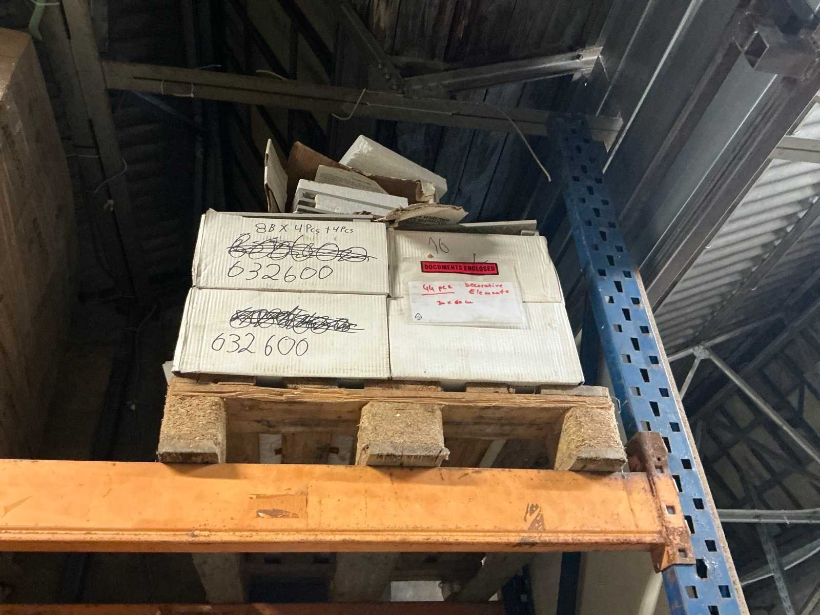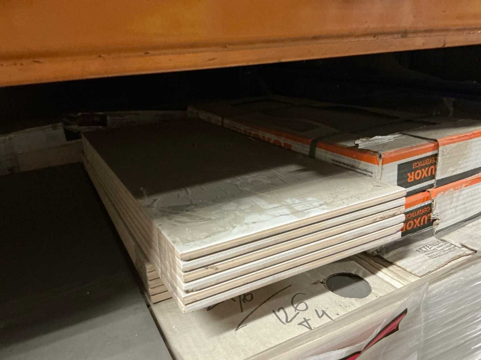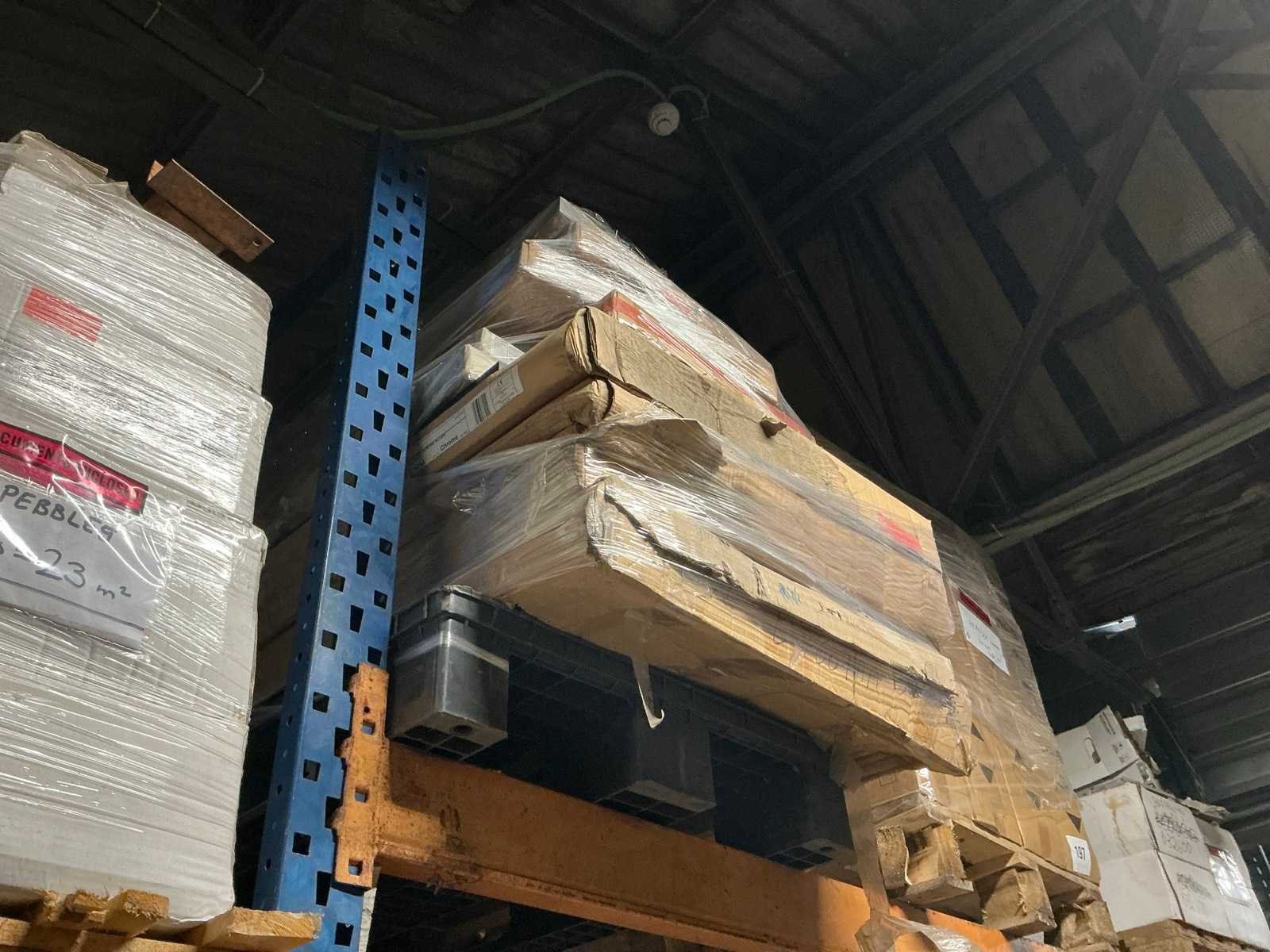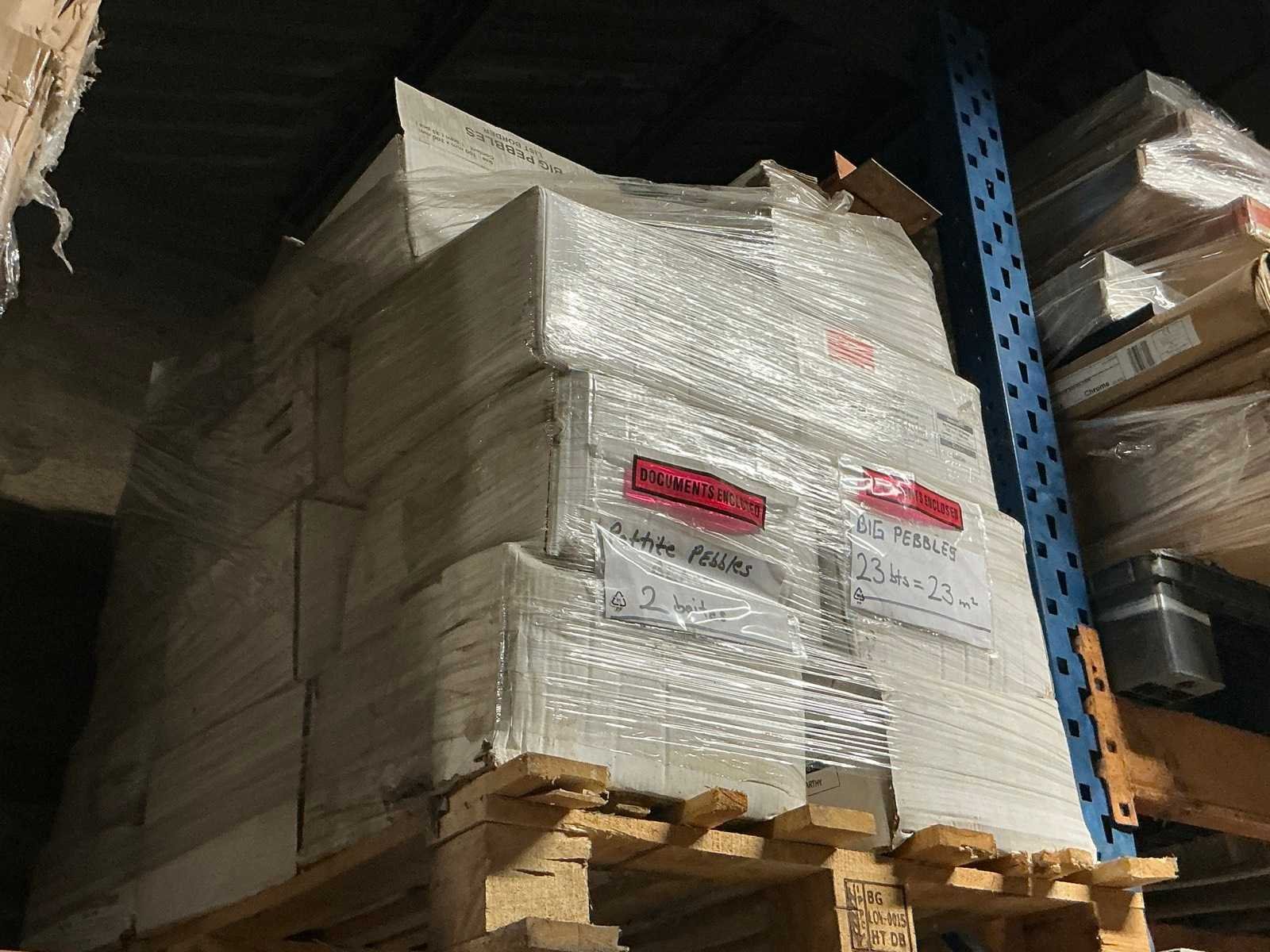 Waaronder plinten SMOV Battiscopa Ghiaccio 8x33,3 (ca. 1600st), ca. 900 plinten 10x32cm, ca. 40 decoratieve boorden 30x60cm Marrazzi, partij pebbles waaronder ca. 23m2 Starigo Earthy 10x30cm, WC inbouwframe IdealStandard Prosys 120M, wastafel Porcher 55cm, partij badkamermeubels.., tussenwande piscijn, liggende in rek (zonder rek)