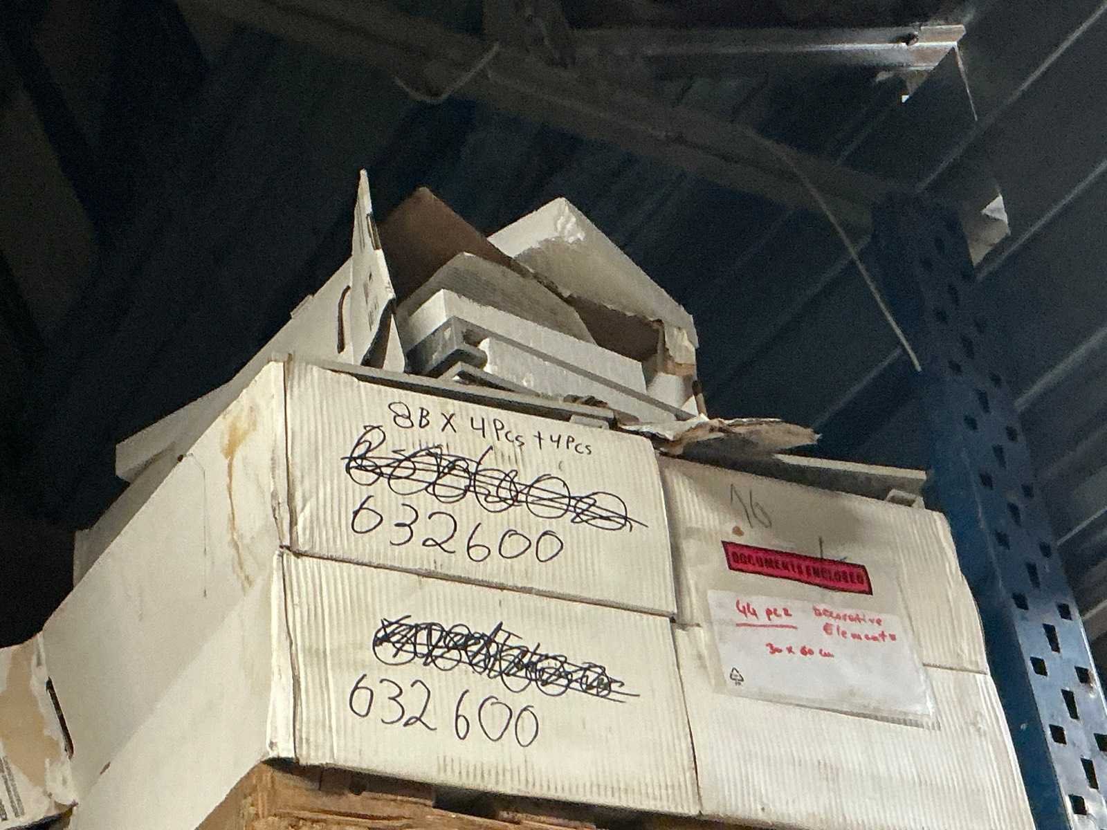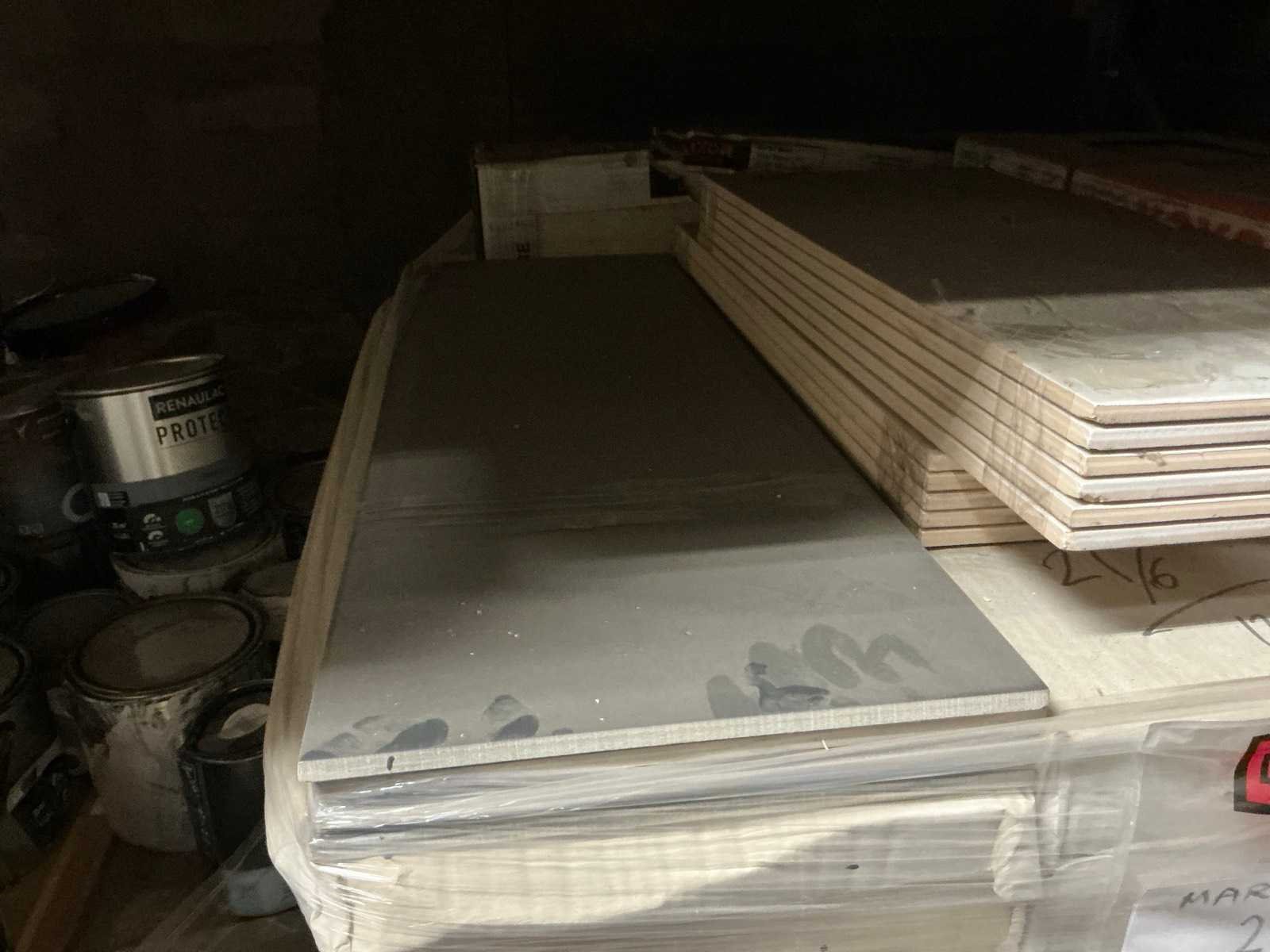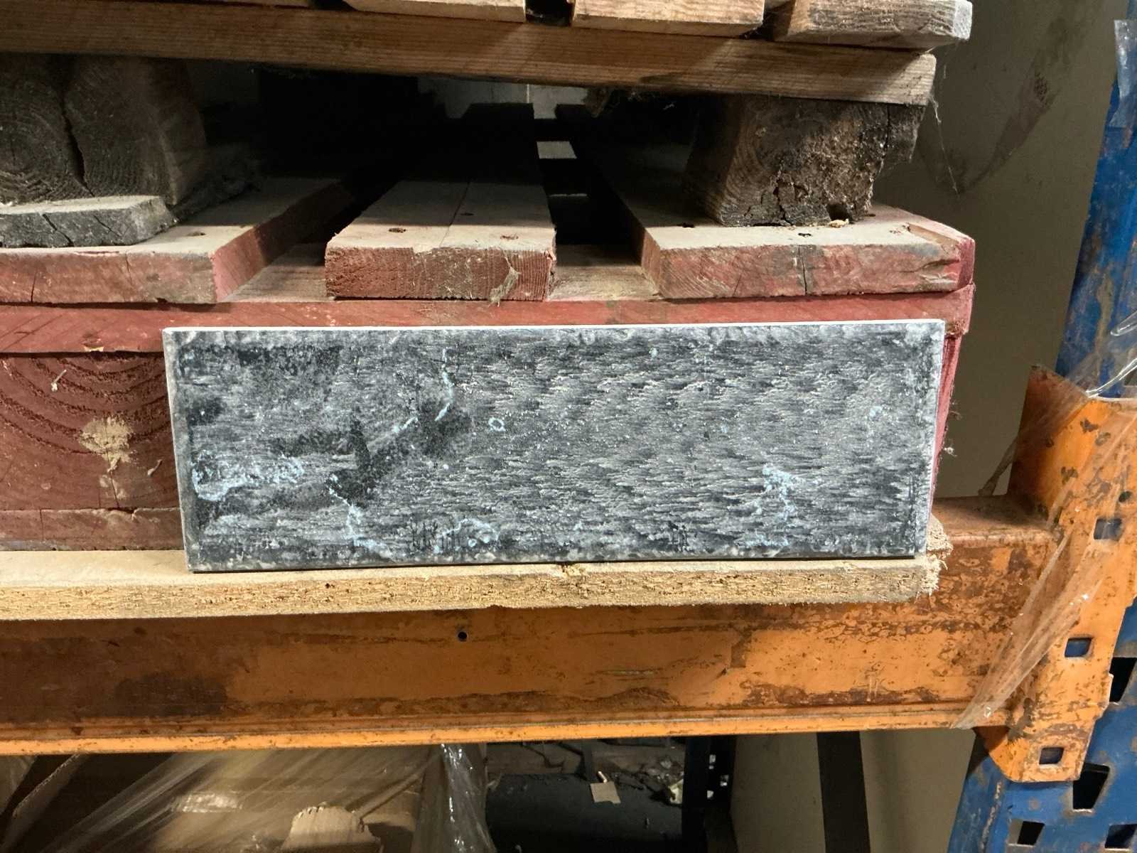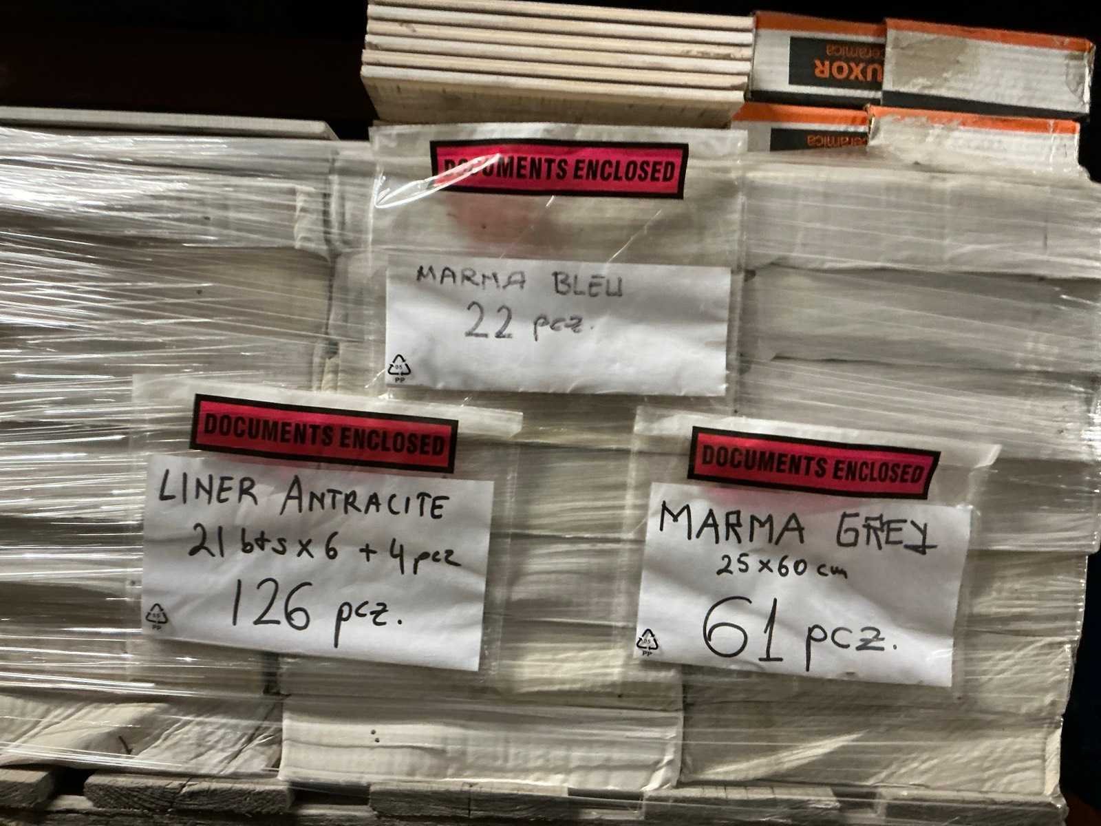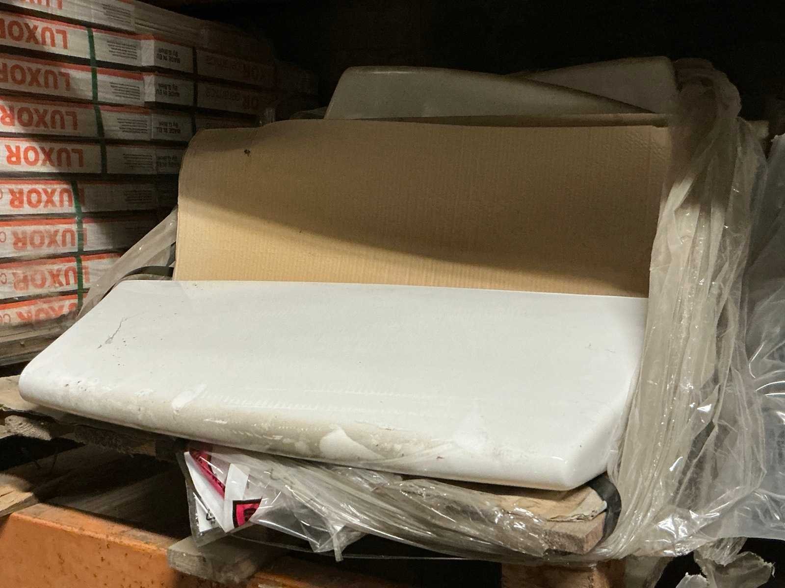 Waaronder plinten SMOV Battiscopa Ghiaccio 8x33,3 (ca. 1600st), ca. 900 plinten 10x32cm, ca. 40 decoratieve boorden 30x60cm Marrazzi, partij pebbles waaronder ca. 23m2 Starigo Earthy 10x30cm, WC inbouwframe IdealStandard Prosys 120M, wastafel Porcher 55cm, partij badkamermeubels.., tussenwande piscijn, liggende in rek (zonder rek)