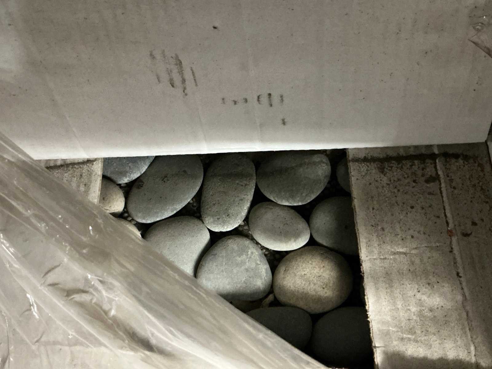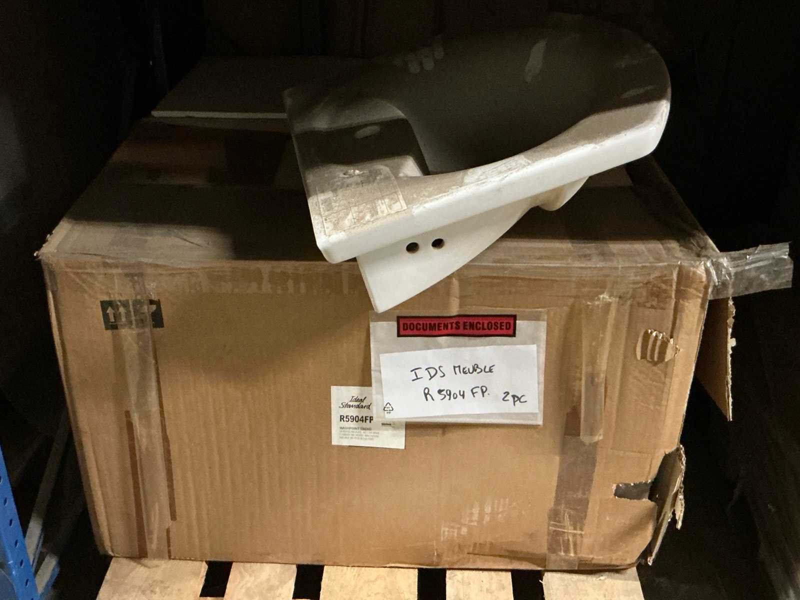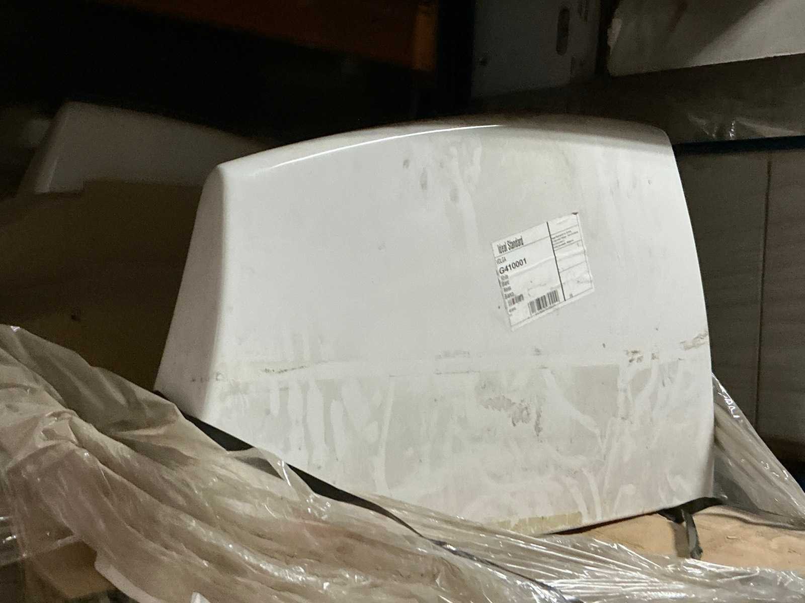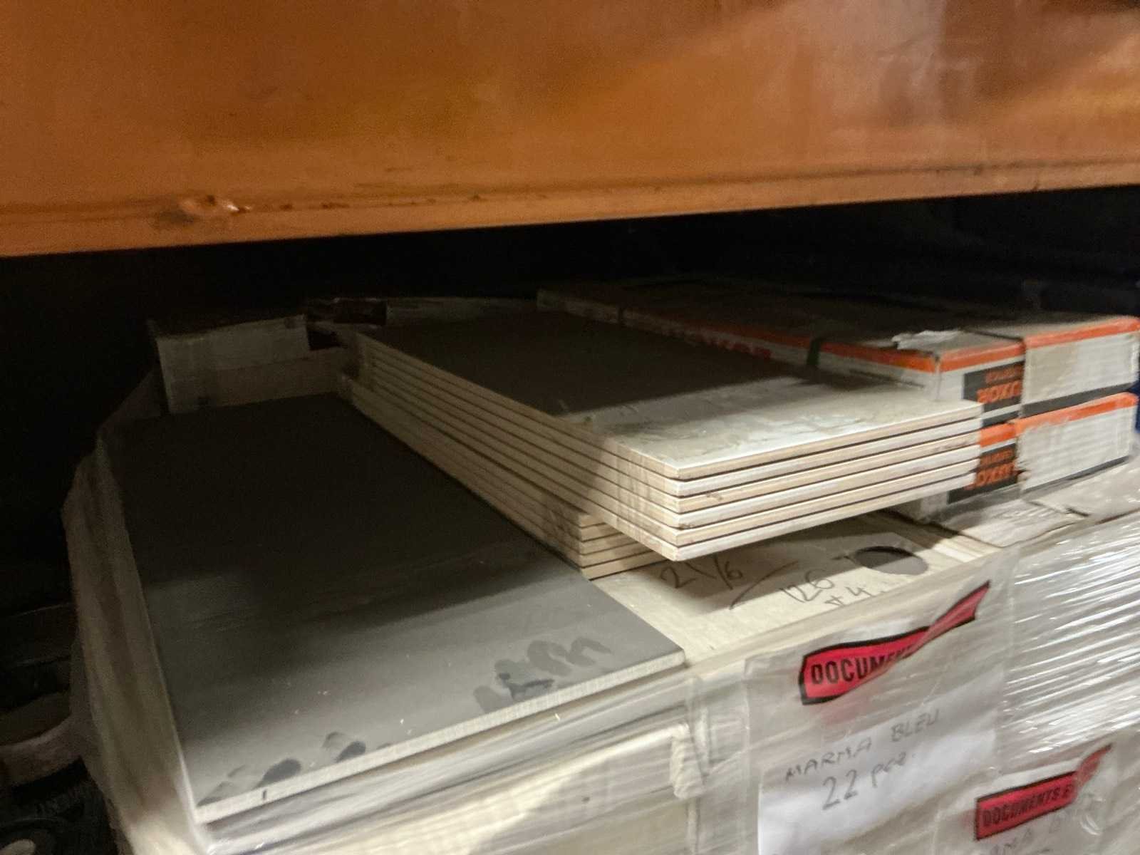 Waaronder plinten SMOV Battiscopa Ghiaccio 8x33,3 (ca. 1600st), ca. 900 plinten 10x32cm, ca. 40 decoratieve boorden 30x60cm Marrazzi, partij pebbles waaronder ca. 23m2 Starigo Earthy 10x30cm, WC inbouwframe IdealStandard Prosys 120M, wastafel Porcher 55cm, partij badkamermeubels.., tussenwande piscijn, liggende in rek (zonder rek)