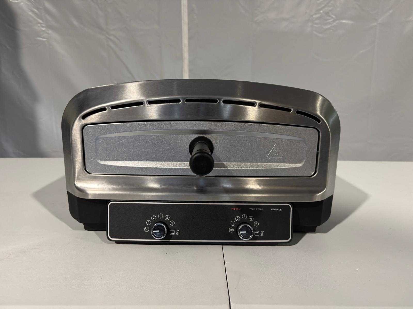 Nieuw in doos, met pizzasteen en schep Merk: MaxxHome Aansluiting: 220V Rvs: true Eigen gewicht: 13kg Vermogen: 2.2kW Elektrisch: true Lengte: 50cm Breedte: 45cm Hoogte: 26cm