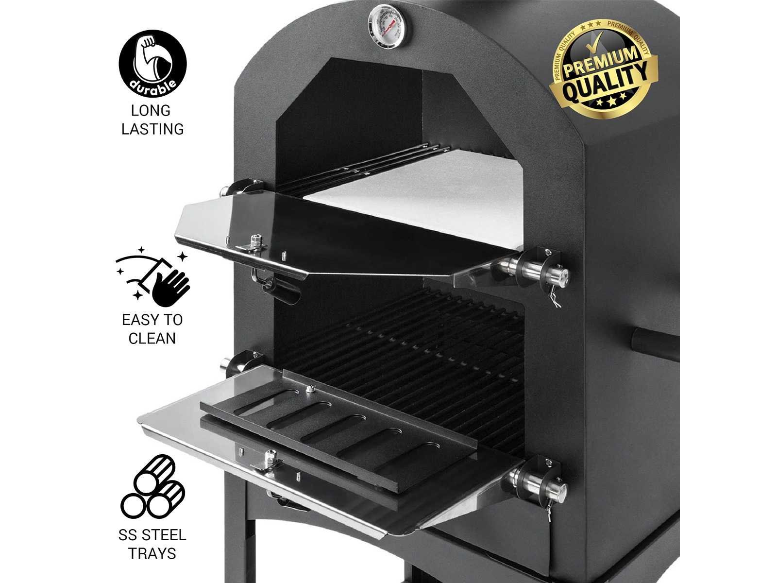 Kenmerken: Gemaakt van hoogwaardig ijzer met een zwarte coating. Eenvoudig om te zetten naar een barbecue met het barbecuerooster. Handgreep en transportwielen voor gemakkelijke verplaatsing. Schoorsteen voor efficiënte rookafvoer. Geschikt voor hout, briketten of houtskool als brandstof. Inclusief thermometer om de temperatuur nauwlettend in de gaten te houden. Gebruik en Onderhoud: Ideaal voor pizza's en barbecuen, niet ontworpen voor roken. Bij langdurige blootstelling aan weer kan roestvorming optreden, zonder afbreuk te doen aan de kwaliteit. Specificaties: Materiaal: Metaal met zwarte coating. Handvat en wieltjes voor eenvoudige verplaatsing. Afmeting rooster: ca. 49 x 35 cm. Afmetingen: ca. 45 x 65 x 158 cm (hoogte). Vierkante pizzasteen inbegrepen (35x35 cm). Merk: MaxxGarden Type: 21682 Materiaal: metaal Product type: pizza oven