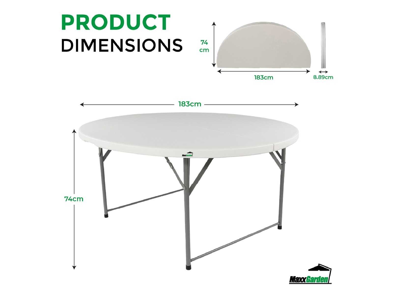 Nieuw in doos, verpakking licht beschadigd Merk: MaxxGarden Model: 88544 Product type: vouwtafel Verstelbaar: true Vorm: rond Stoelen: 0 Kleur: wit Gewicht: 20kg Lengte: 180cm Breedte: 183cm Hoogte: 74cm Materiaal: kunststof