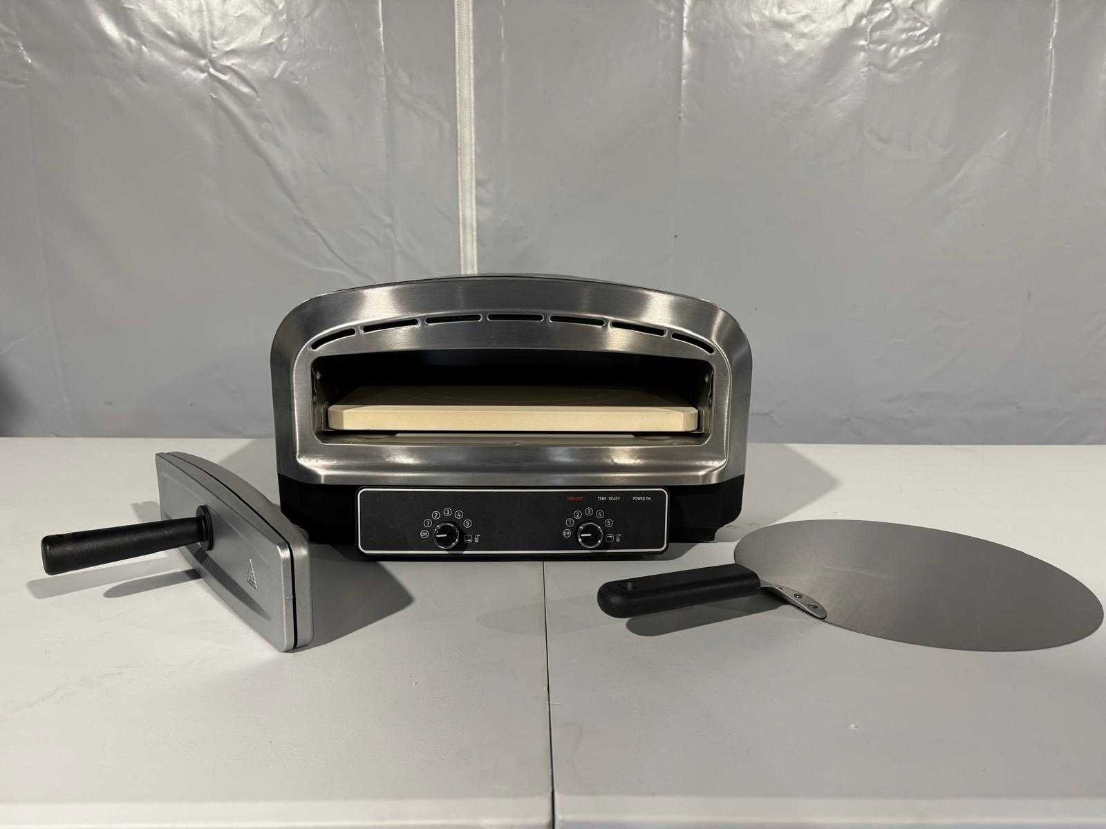 Nieuw in doos, met pizzasteen en schep Aansluiting: 220V Rvs: true Eigen gewicht: 13kg Vermogen: 2.2kW Elektrisch: true Lengte: 50cm Breedte: 45cm Hoogte: 26cm