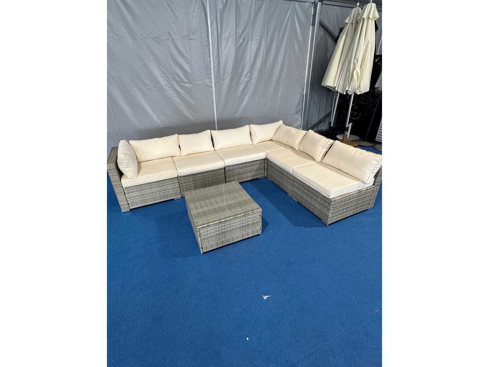 Nieuwe loungeset - Loungeset 7 persoons wicker Corner sofa: W79*D79*H69cm Middle sofa: W69*D79*H69cm Table: W69*D69*H36cm Seat height: 36cm Merk: MaxxGarden Product type: loungeset Kussens: true Stapelbaar: true Verstelbaar: true Stoelen: 5 Tafel: 1 Kleur: grijs Materiaal: wicker
