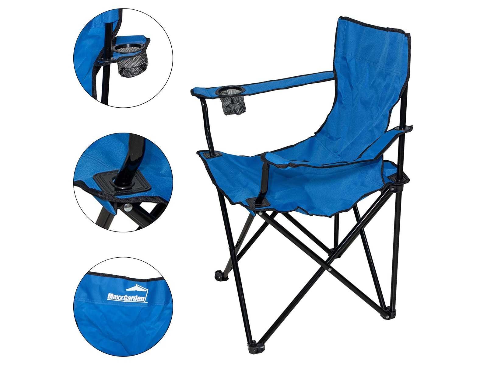 Merk: MaxxGarden Product type: Kampeerstoel campingstoel opvouwbaar Kleur: blauw Gewicht: 2kg Lengte: 52cm Breedte: 52cm Hoogte: 87cm Materiaal: nylon