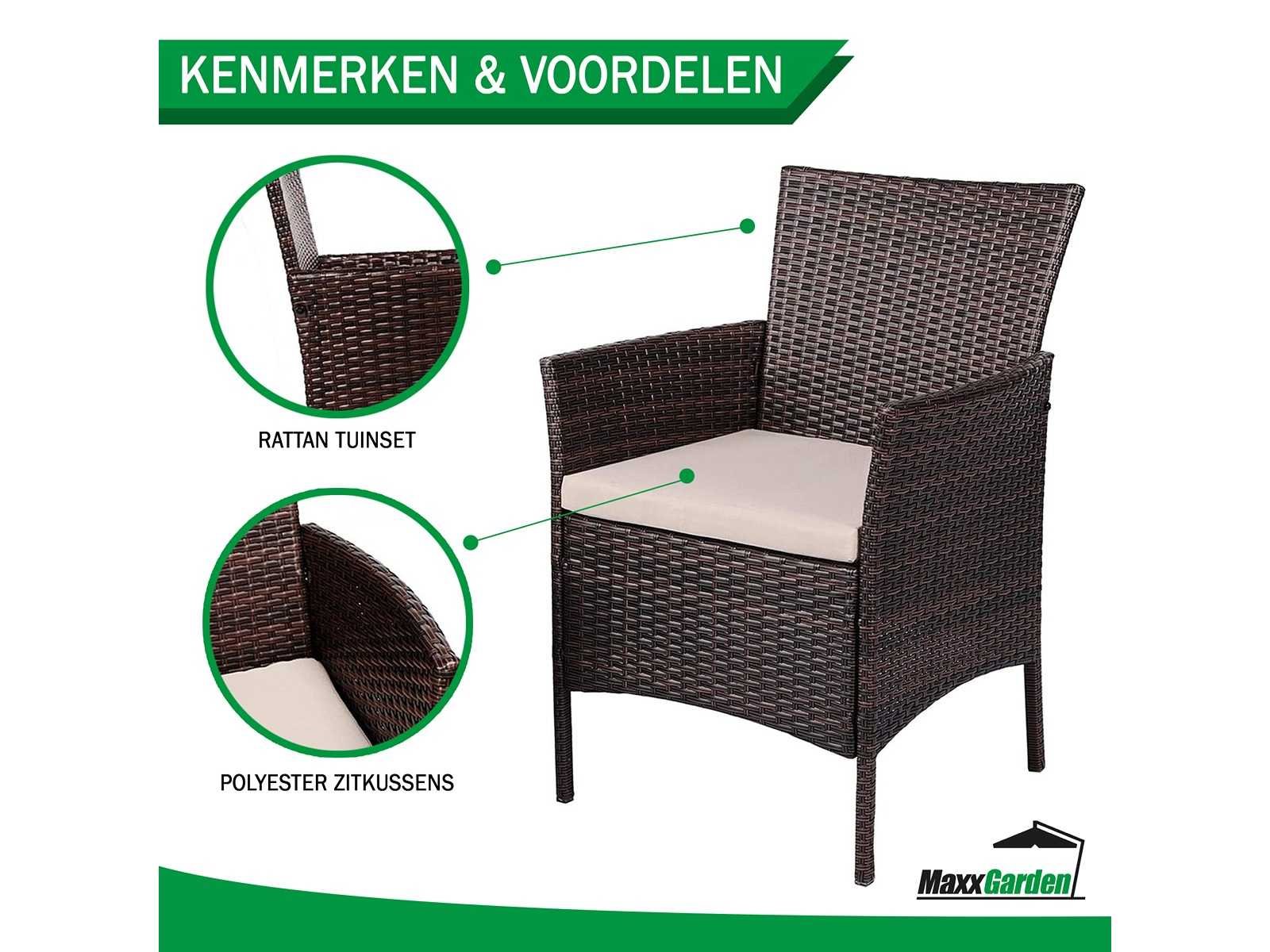 Nieuwe MaxxGarden - 22401 - tuinset - bistroset Totale afmetingen stoelen (BxHxD): 58 x 87 x 58 cm Zithoogte stoelen: 43,5 cm Afmetingen zitkussen (BxHxD): 43 x 5 x 43 cm Totale afmetingen tafel (BxHxD): 40 x 40 x 39 cm Afmetingen glazen blad (BxHxD): 40 x 40 x 0,5 cm Gewicht stoel: 6,4 kg Draagvermogen stoel: 120 kg Gewicht tafel (incl. glazen blad): 6,6 kg Draagvermogen tafel: 45 kg Materiaal stoel, tafel: staal, polyethyleen Materiaal zitkussens: 100 % polyester inhoud niet gecontroleerd Merk: MaxxGarden Model: 22401 Product type: tuinset Kussens: true Stoelen: 2 Kleur: bruin Lengte: 58cm Breedte: 58cm Hoogte: 87cm Materiaal: wicker Zithoogte: 43