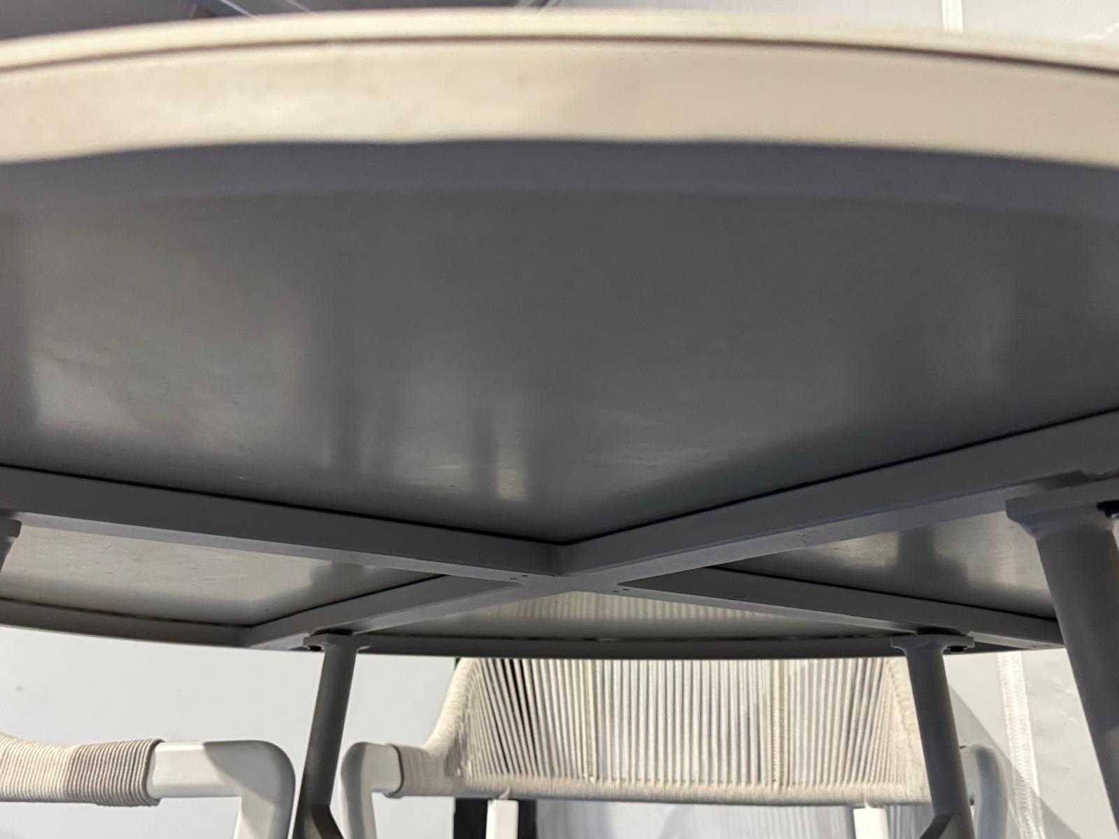 Nieuwe alu Tuinset met ronde tafel 4 stoelen met glazen blad Diameter tafel 110cm Stoel 62x58cm, zithoogte 46cm Merk: MaxxGarden Kussens: true Vorm: rond Stoelen: 4 Kleur: grijs Lengte: 110cm Breedte: 110cm Hoogte: 74cm Materiaal: aluminium glas Zithoogte: 46