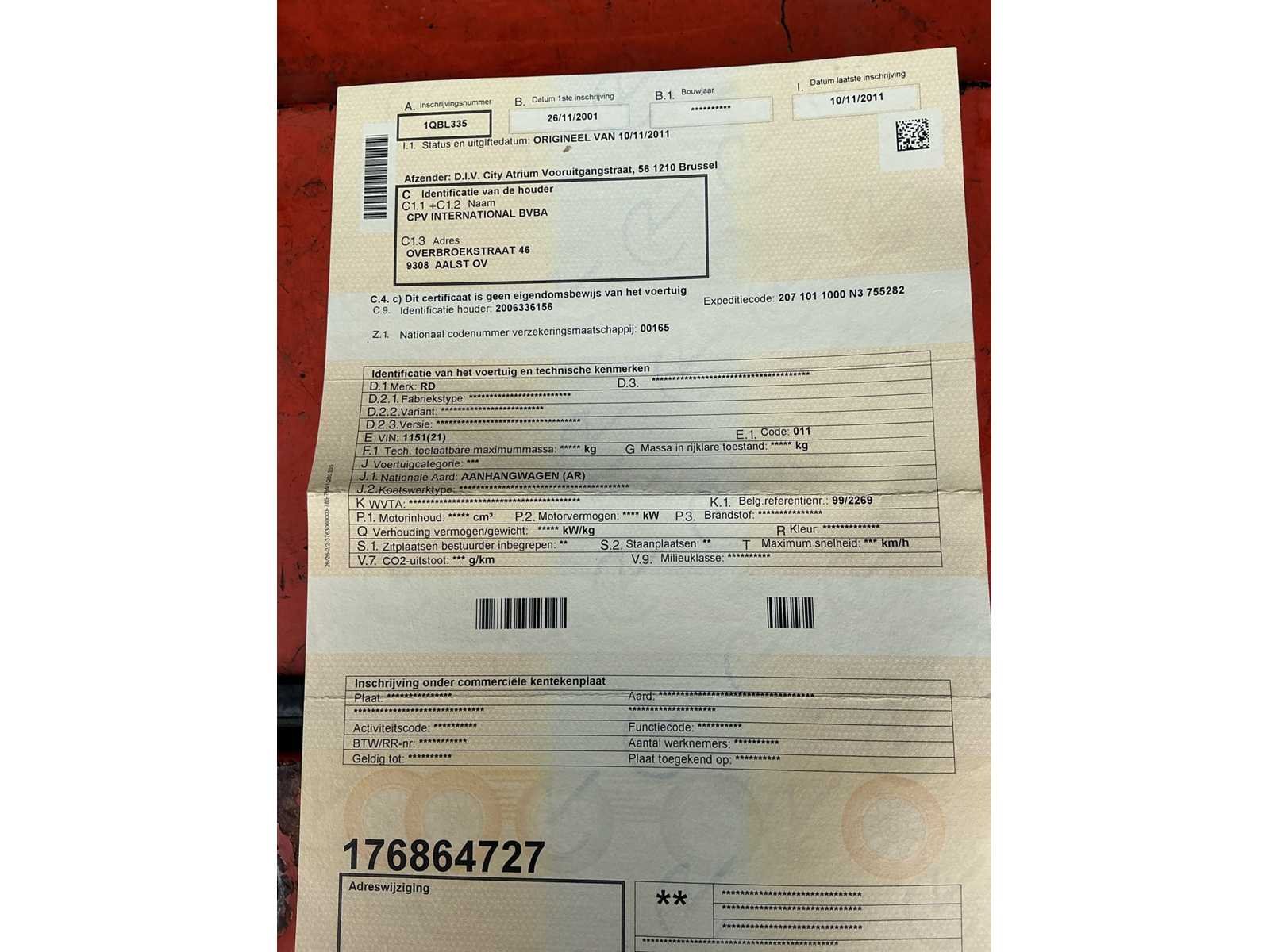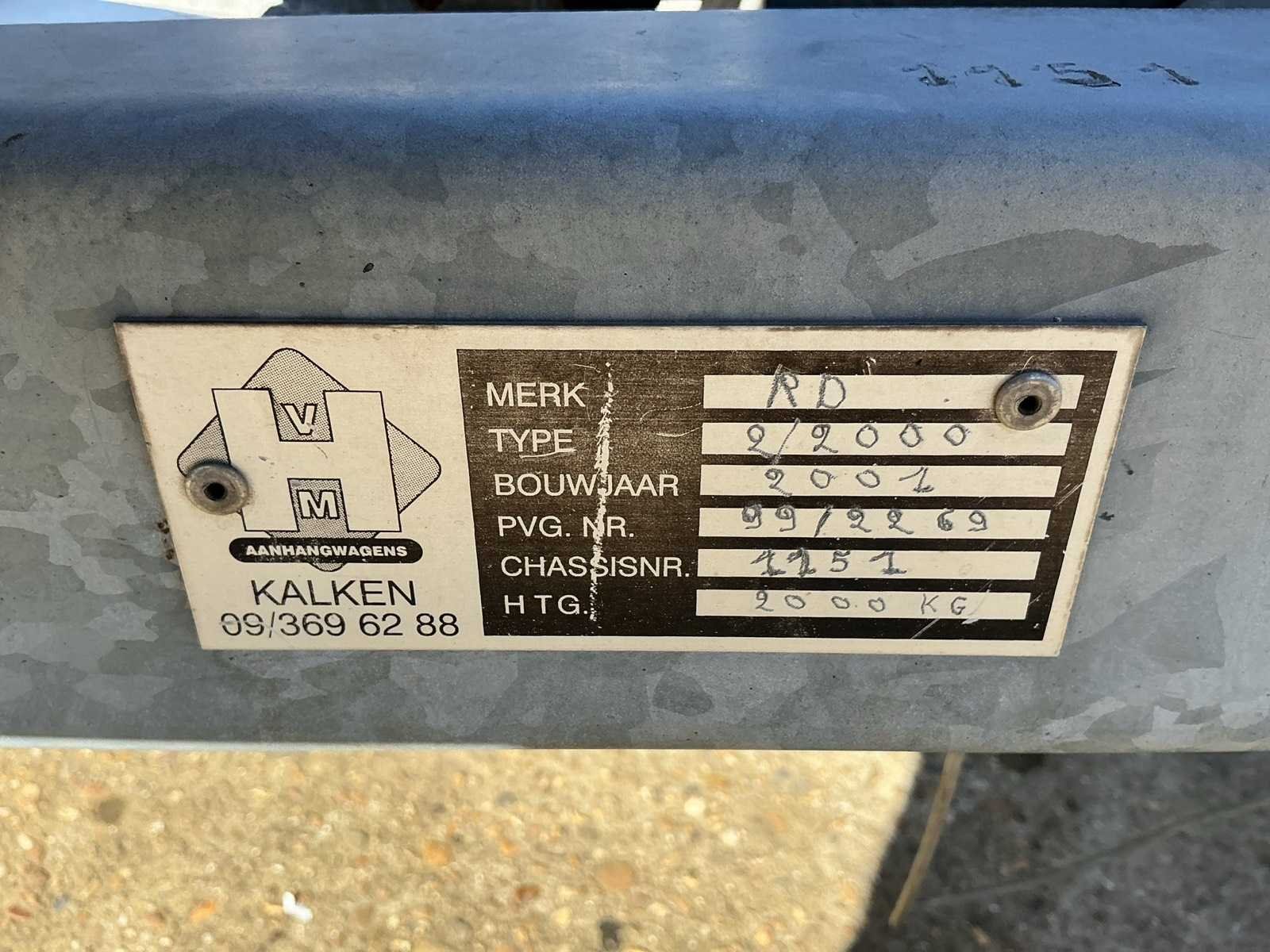 Identificatiebewijs aanwezig,Laatste keuringsbewijs aanwezig Merk: RD Type: 2/2000 Bouwjaar: 2001 Chassisnummer: 1151 Aantal assen: 2 Laadbak afmeting l: 355cm Laadbak afmeting b: 160cm Ledig gewicht: 660kg Laadvermogen: 2000kg Zeiltrailer: true Datum eerste toelating: 26/11/2001 Hoogte: 190cm Nationaliteit documenten: België