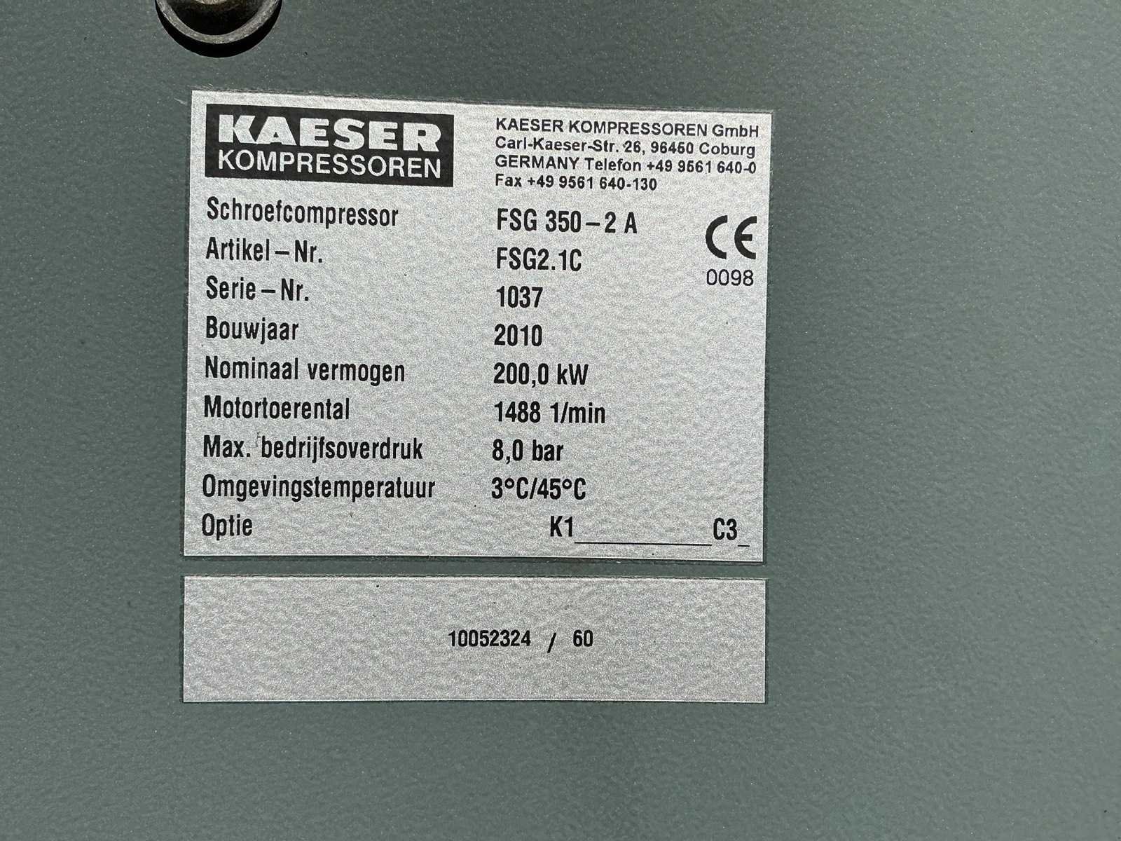 Merk: Kaeser Type: FSG 350-2A Bouwjaar: 2010 Serienummer: 1037 Capaciteit.: 8bar Vermogen: 200kW Aansluiting: 400V Totale afmeting L: 2080mm Totale afmeting Breedte: 3680mm Totale afmeting Hoogte: 2750mm
