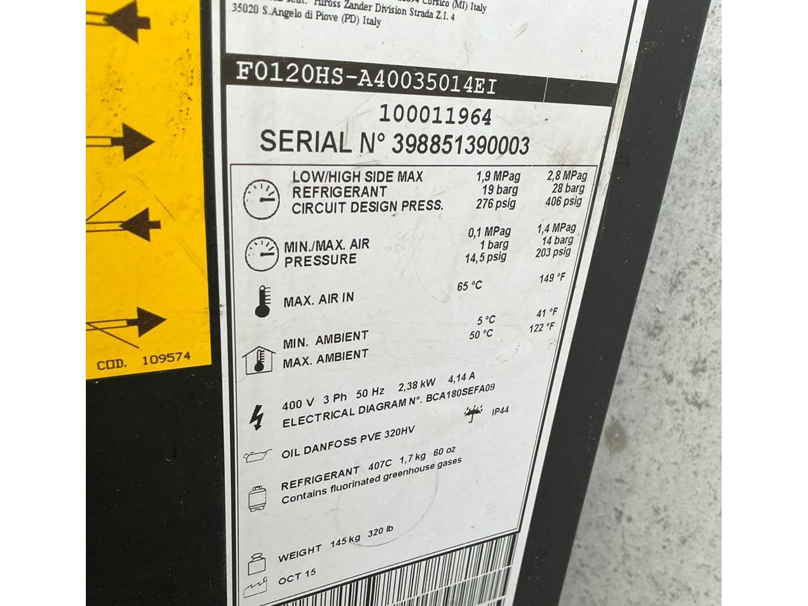 Merk: CompAir Type: F120HS Aansluiting: 400V Totale afmeting L: 1050mm Totale afmeting Breedte: 710mm Totale afmeting Hoogte: 1070mm