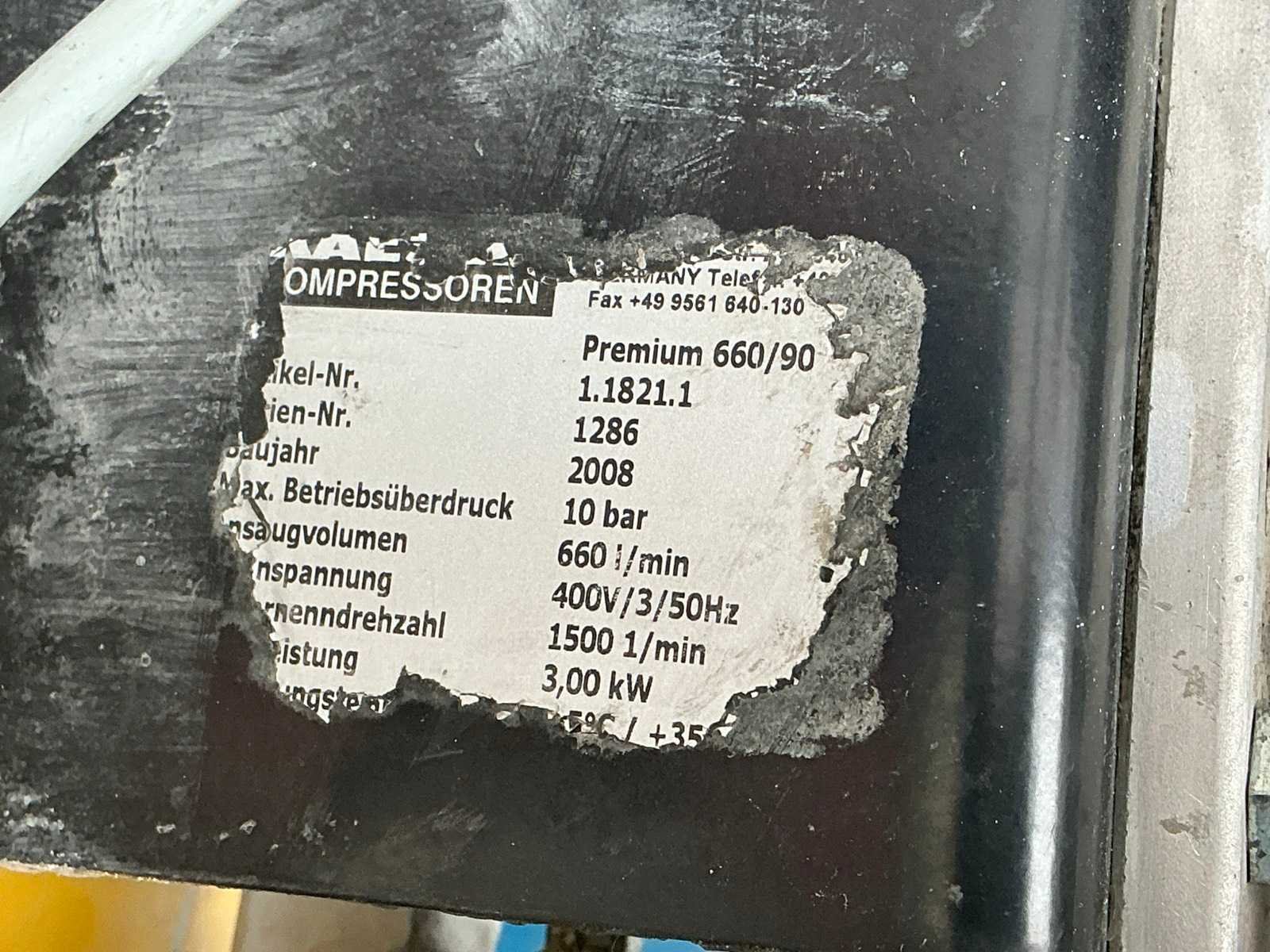 Merk: Kaeser Type: Premium 660/90D Bouwjaar: 2008 Serienummer: 1286 Capaciteit.: 10bar Vermogen: 3kW Buffertank inhoud: 90l Aansluiting: 380V