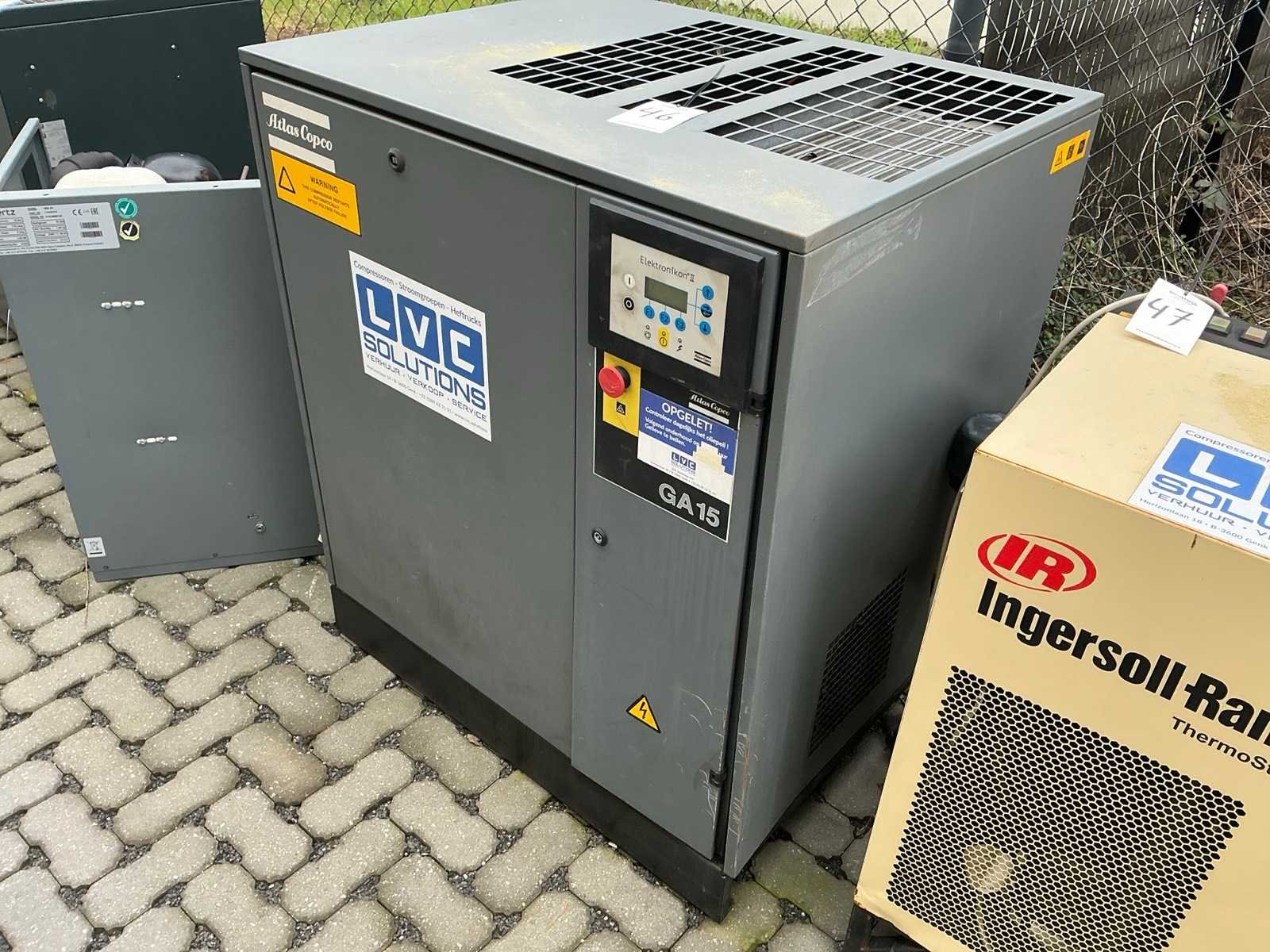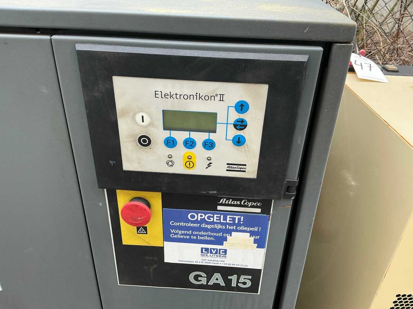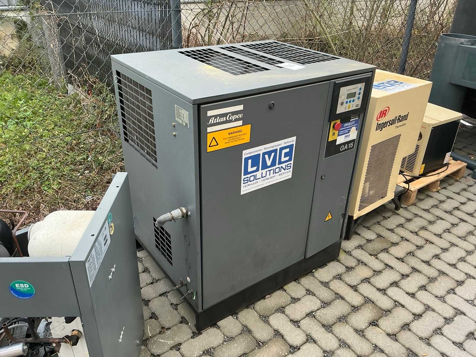 Merk: Atlas Copco Type: GA15 FF Capaciteit.: 13bar Vermogen: 15kW Totale afmeting L: 780mm Totale afmeting Breedte: 1000mm Totale afmeting Hoogte: 1150mm