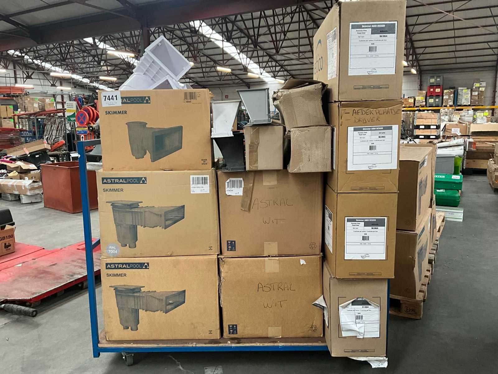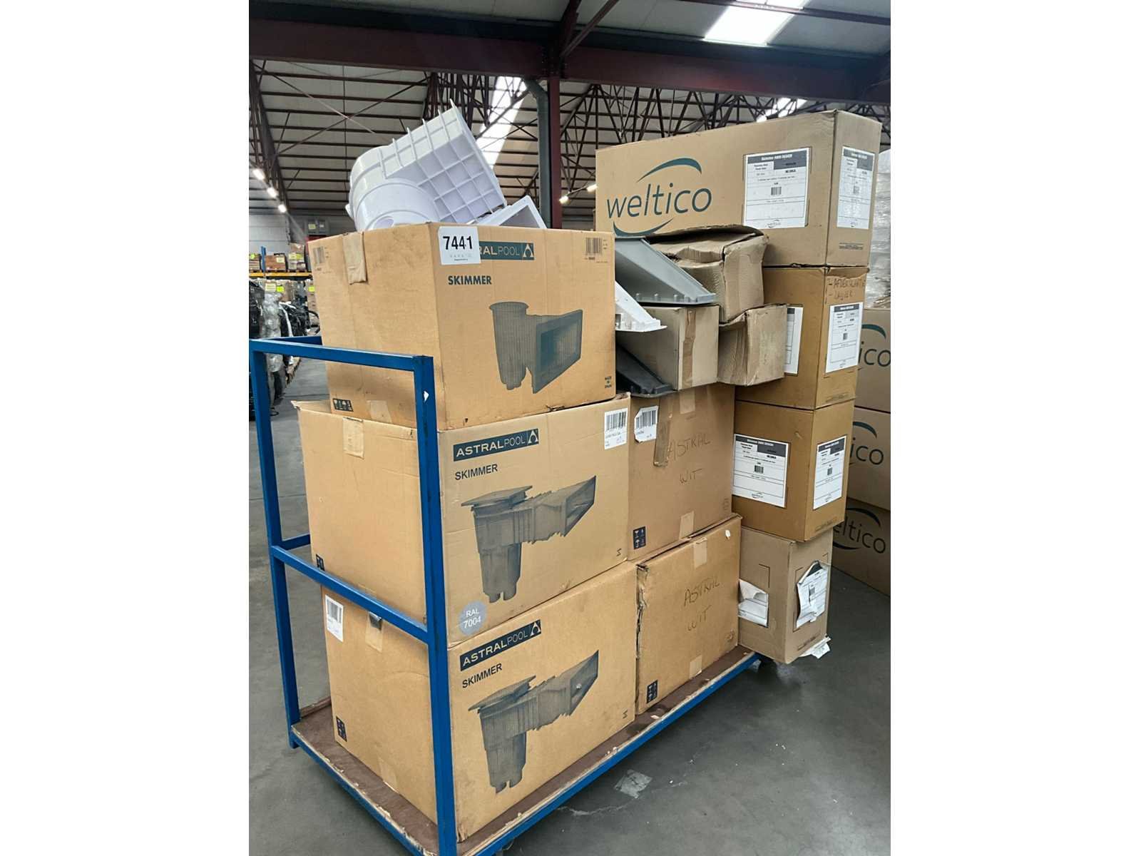 Waaronder Weltico, AstralPool. Waaronder skimmer basis units, skimmer monden. Mogelijk incompleet. Liggende in o.a. 13 dozen.