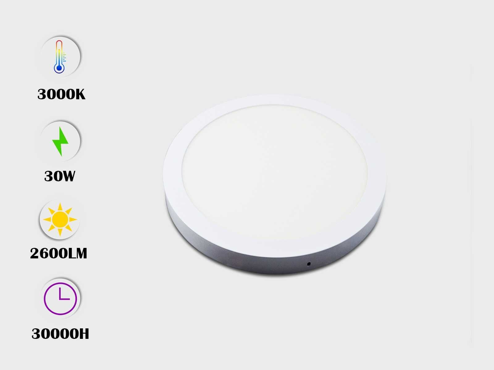 10 x LED-oppervlaktepanelen – Ronde vorm – Vermogen 30W – LED-type: SMD – Kleurtemperatuur 3000K (warm wit) – Lichtstroom: ≈ 2400 lumen – Afmetingen: 280 x 28 mm – Spanning: 220-240V (50/60 Hz) – Inclusief stuurprogramma's – Bescherming: IP20 – Levensduur: 30.000 uur – Beamhoek: 120° – Inclusief montagekit – Ideaal voor kantoren, winkels en binnenruimtes.