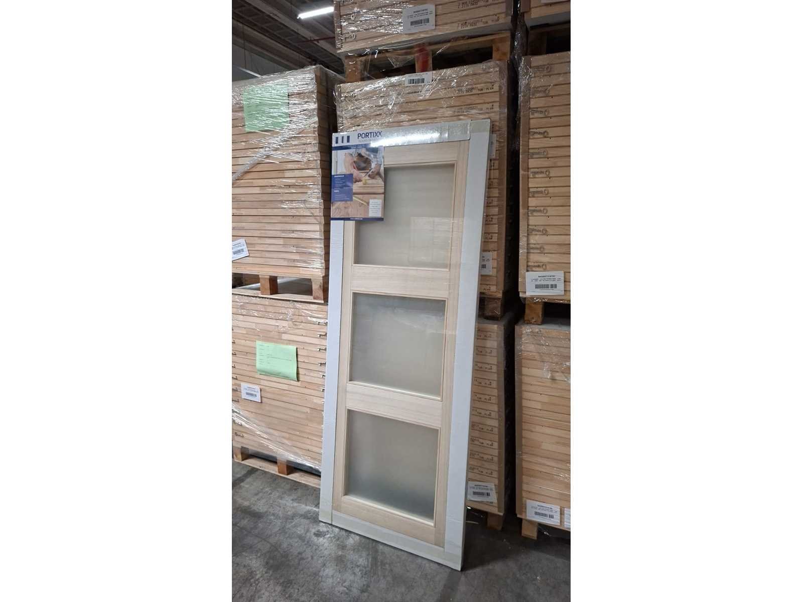 1 binnendeur, zonder kozijnset, in massief hout, beglaasd in mat glas. Te combineren met een bestaand kozijn of nieuw kozijn. Deur reeds voorzien van frezingen voor slot en scharnieren. Afmetingen deurblad: 40mm(D) x 730mm(B) x 2015mm(H)