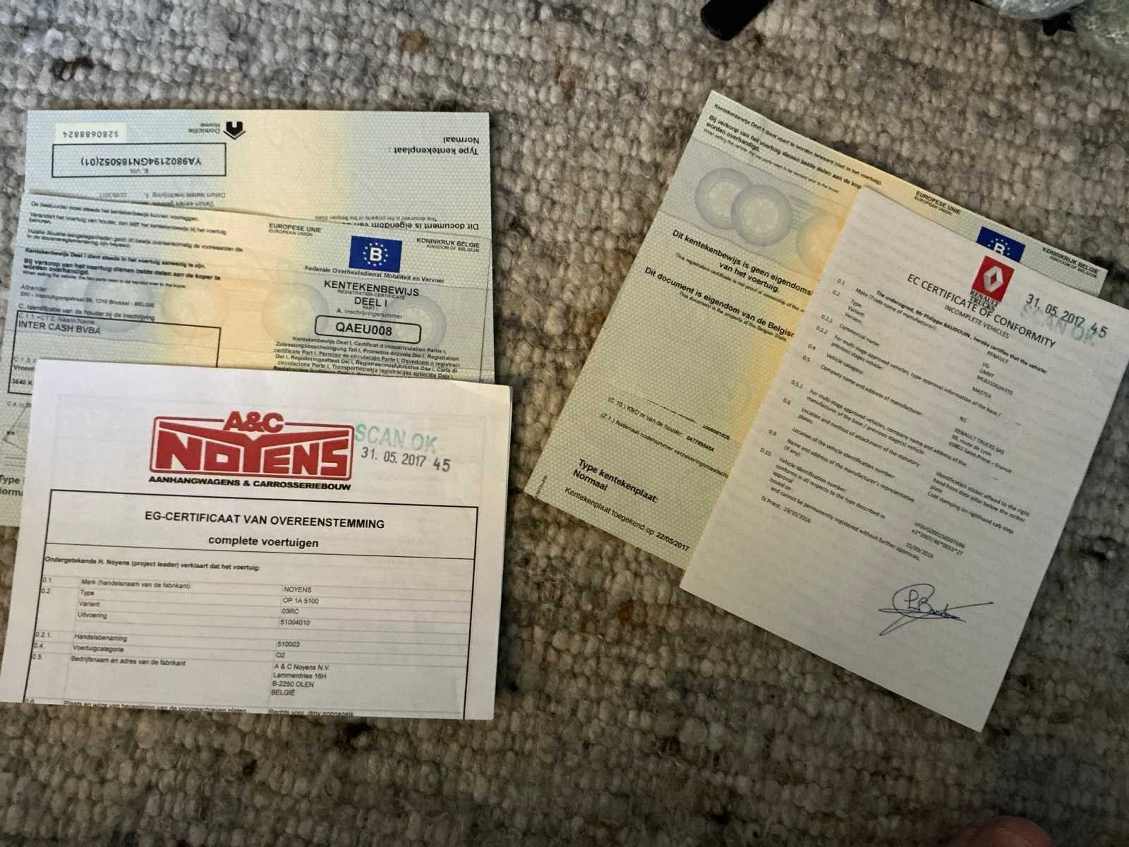 Bestaande uit: 1) Noyens Mastrek-N1 trekker * 1e maal ingebruikname 22/05/2017 * Chassisnummer VF6VG000156507696 * Inschrijvingsbewijs & gelijkvormigheidsattest aanwezig * Tarra 2050kg, Maximale Toegelaten Massa 3500kg * klopboormachine-stand onbekend * Gebruikssporen, deuk 8n motorkap 2) Noyens OP 1A 5100 oplegger (afzetbak) * 1e maal ingebruikname 22/05/2017 * Chassisnummer YA9802194GN185052 * Inschrijvingsbewijs & gelijkvormigheidsattest aanwezig * Tarra 1950kg, Maximale Toegelaten Massa 5100kg * Gebruikssporen Merk: Noyens Cilinderinhoud: 2299cc Aantal assen: 3 Aantal sleutels: 2 Emissieklasse: Euro 6b Gesloten opbouw: true Nationaliteit documenten: B Aantal zitplaatsen: 3 Handgeschakelde versnellingsbak: true Diesel: true