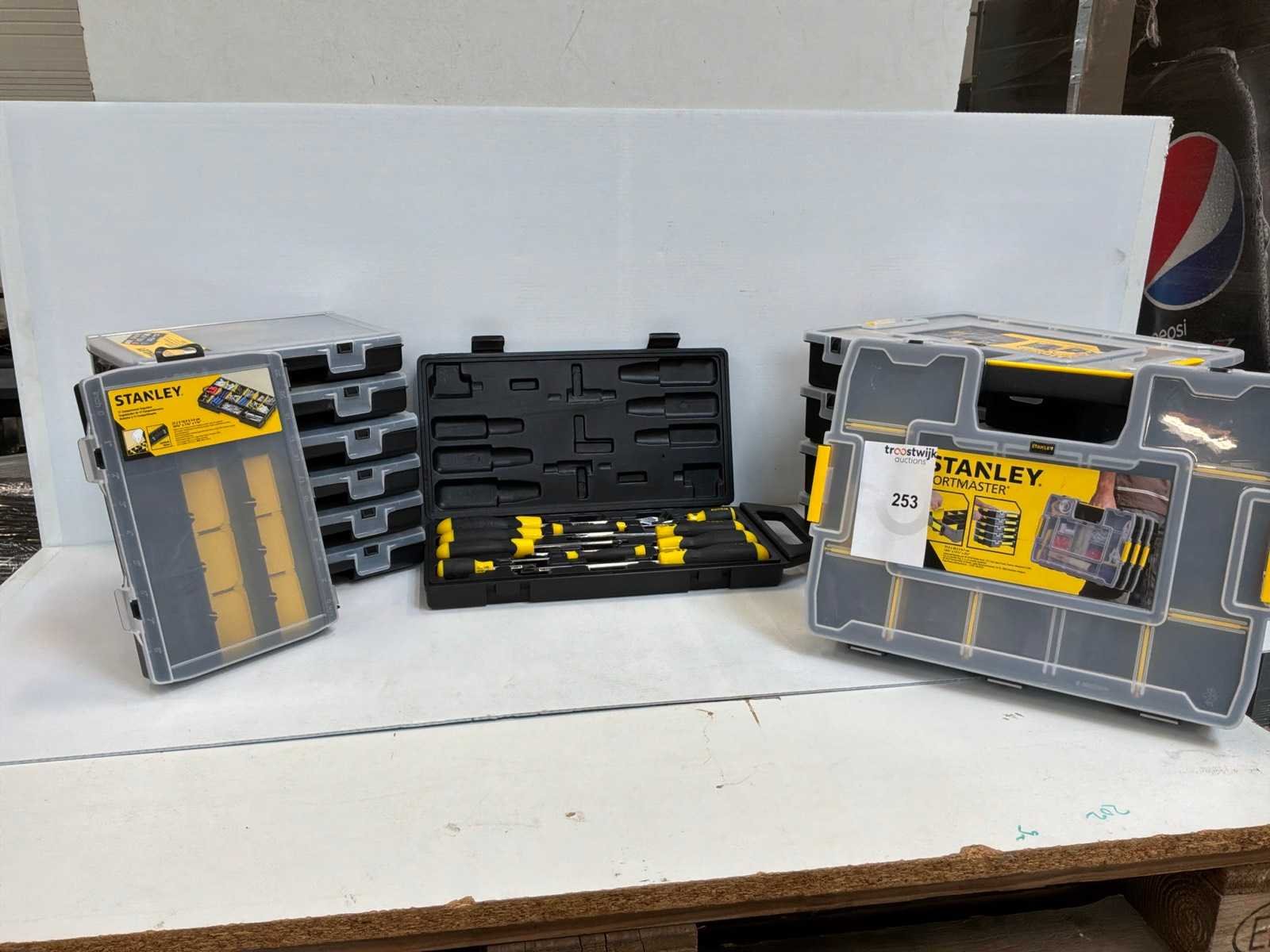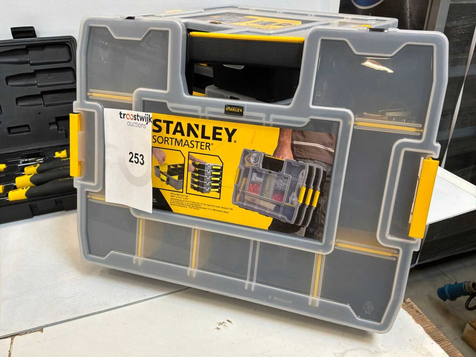 5x Stanley Sortmaster (37,5 x 29,2 x 6,7cm), 7x Stanley 17 Compartment Organizer (27,2 x 18,9 x 4,6cm) Merk: Stanley