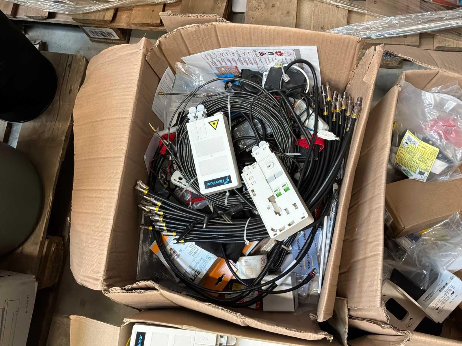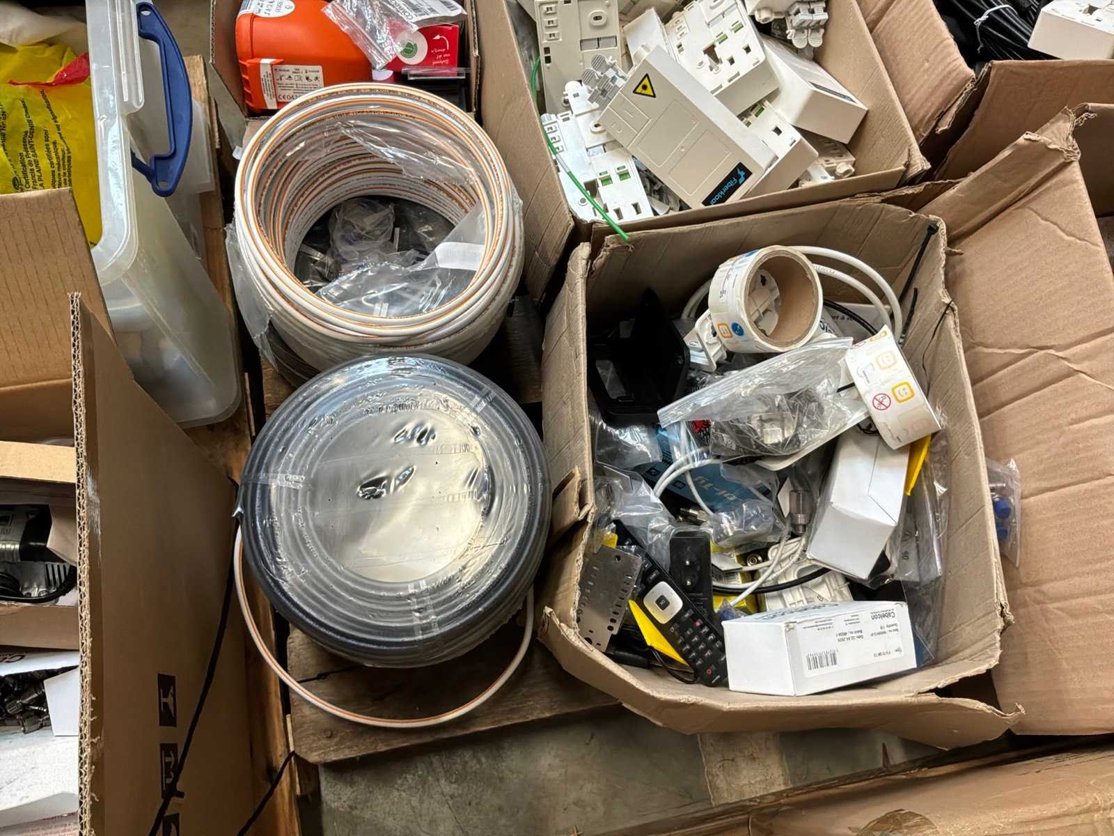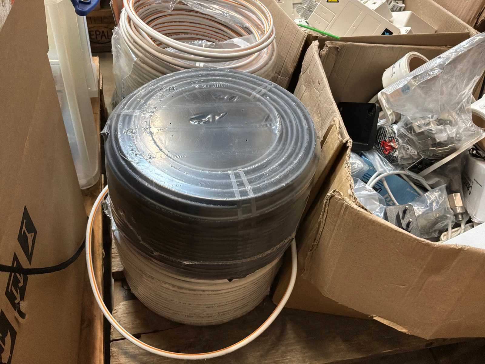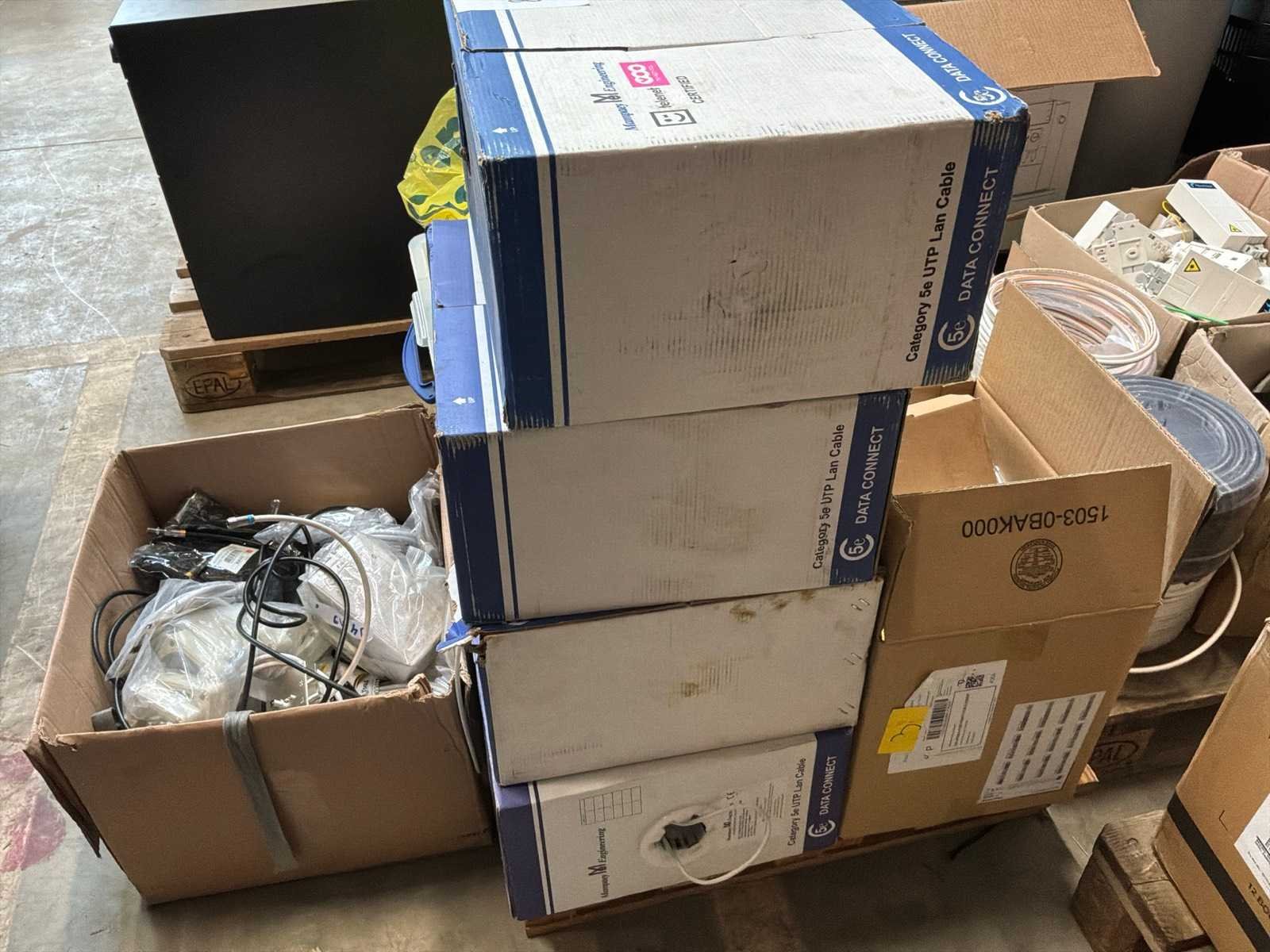 Diverse kabels en bekabelingsmaterialen verdeeld over 2 palletten, waaronder onder andere 4x reeds geopende doos CAT 5 UTP-Lan kabel, alsook mock-up bord (circa 123 x 150cm)