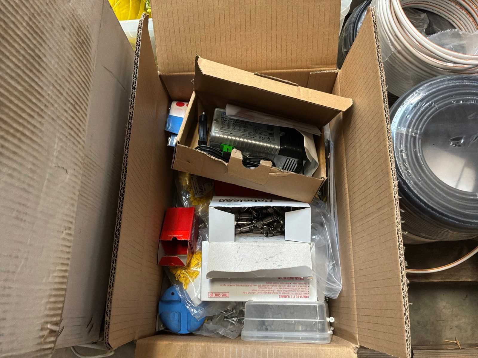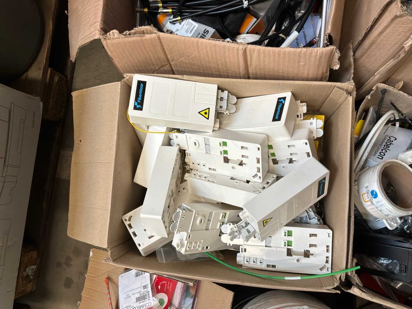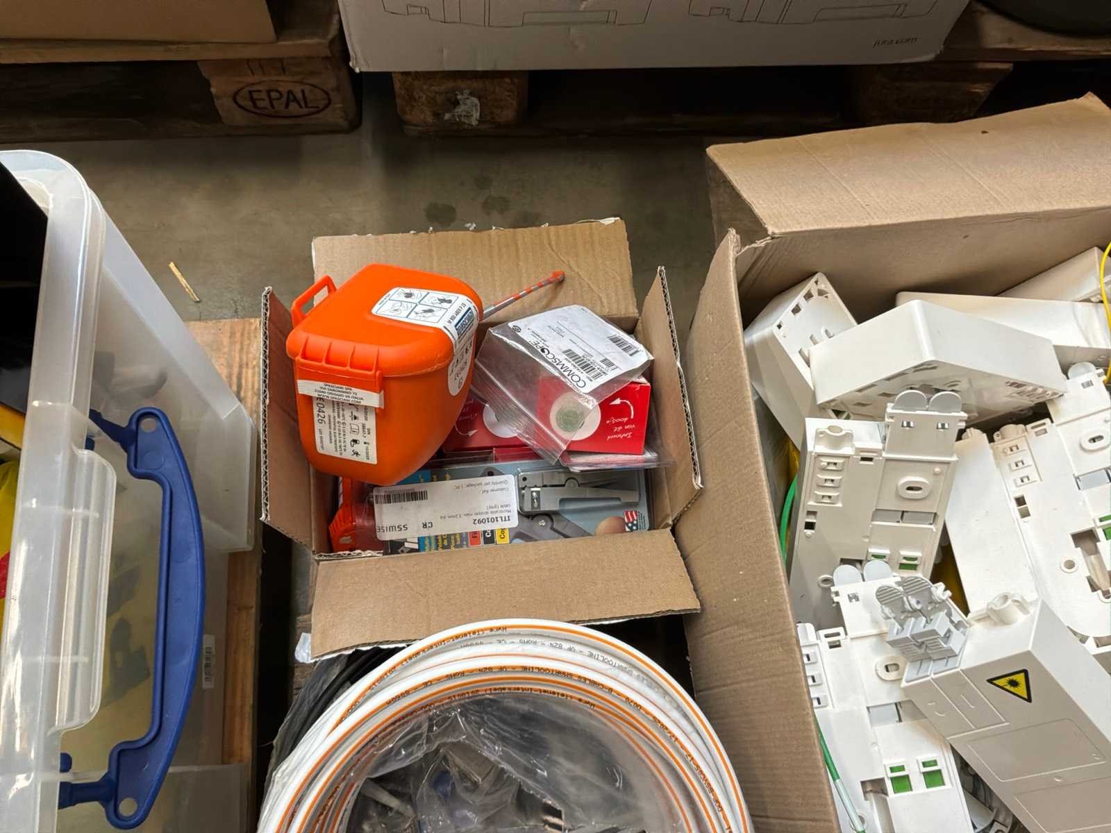 Diverse kabels en bekabelingsmaterialen verdeeld over 2 palletten, waaronder onder andere 4x reeds geopende doos CAT 5 UTP-Lan kabel, alsook mock-up bord (circa 123 x 150cm)