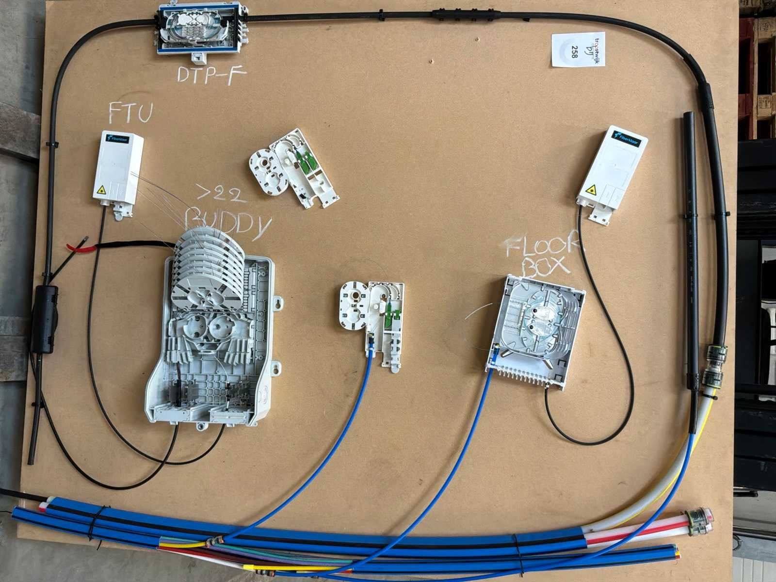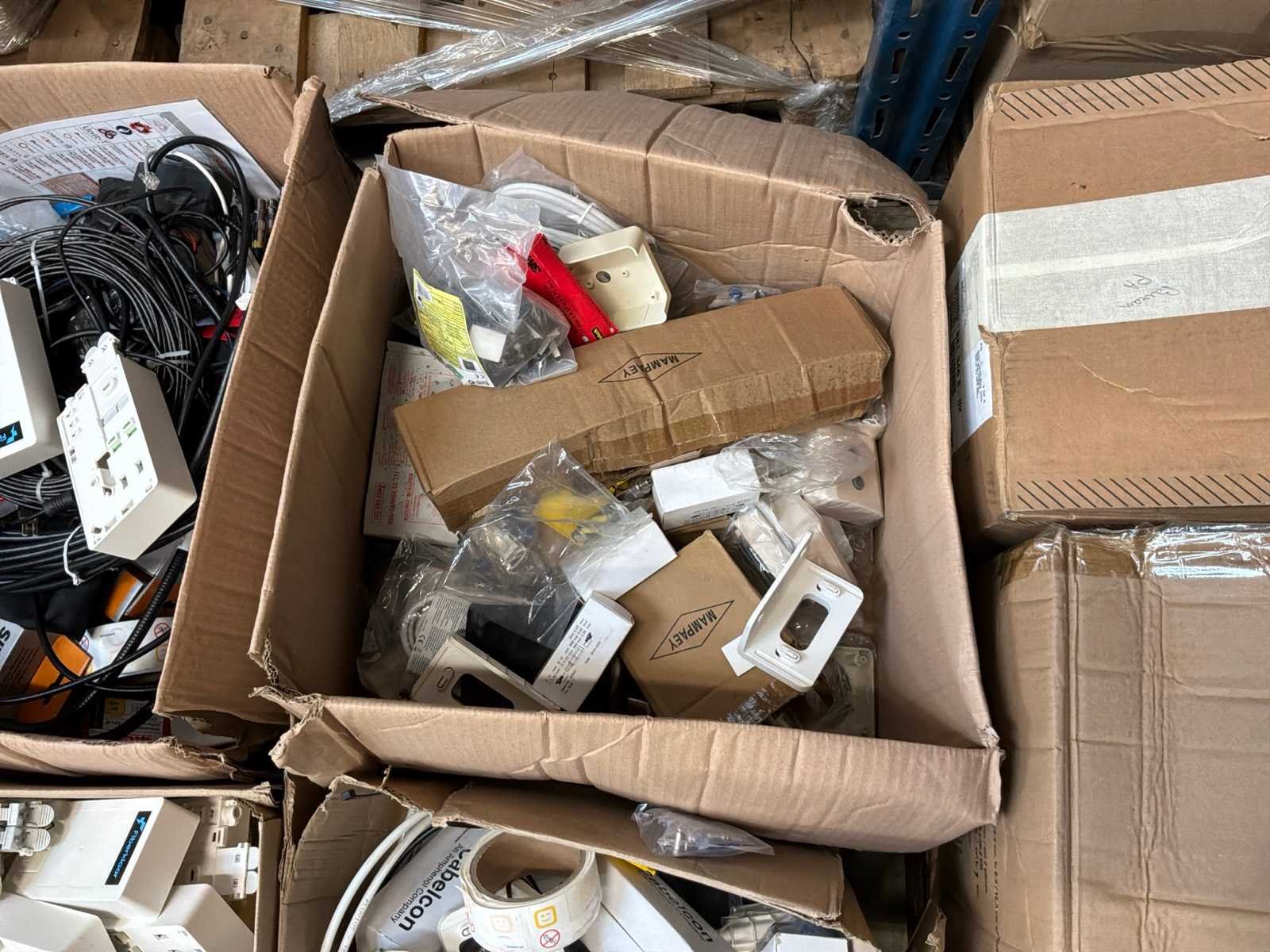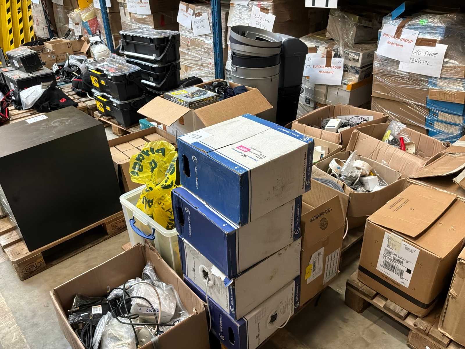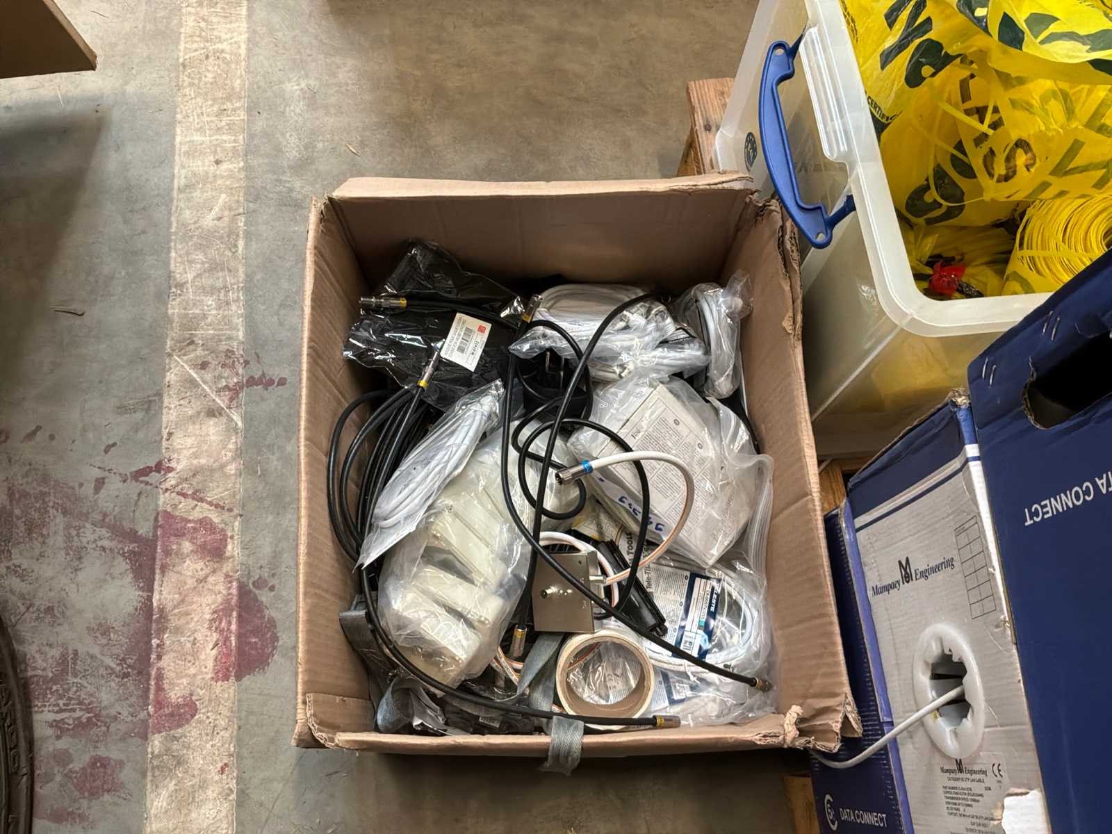 Diverse kabels en bekabelingsmaterialen verdeeld over 2 palletten, waaronder onder andere 4x reeds geopende doos CAT 5 UTP-Lan kabel, alsook mock-up bord (circa 123 x 150cm)