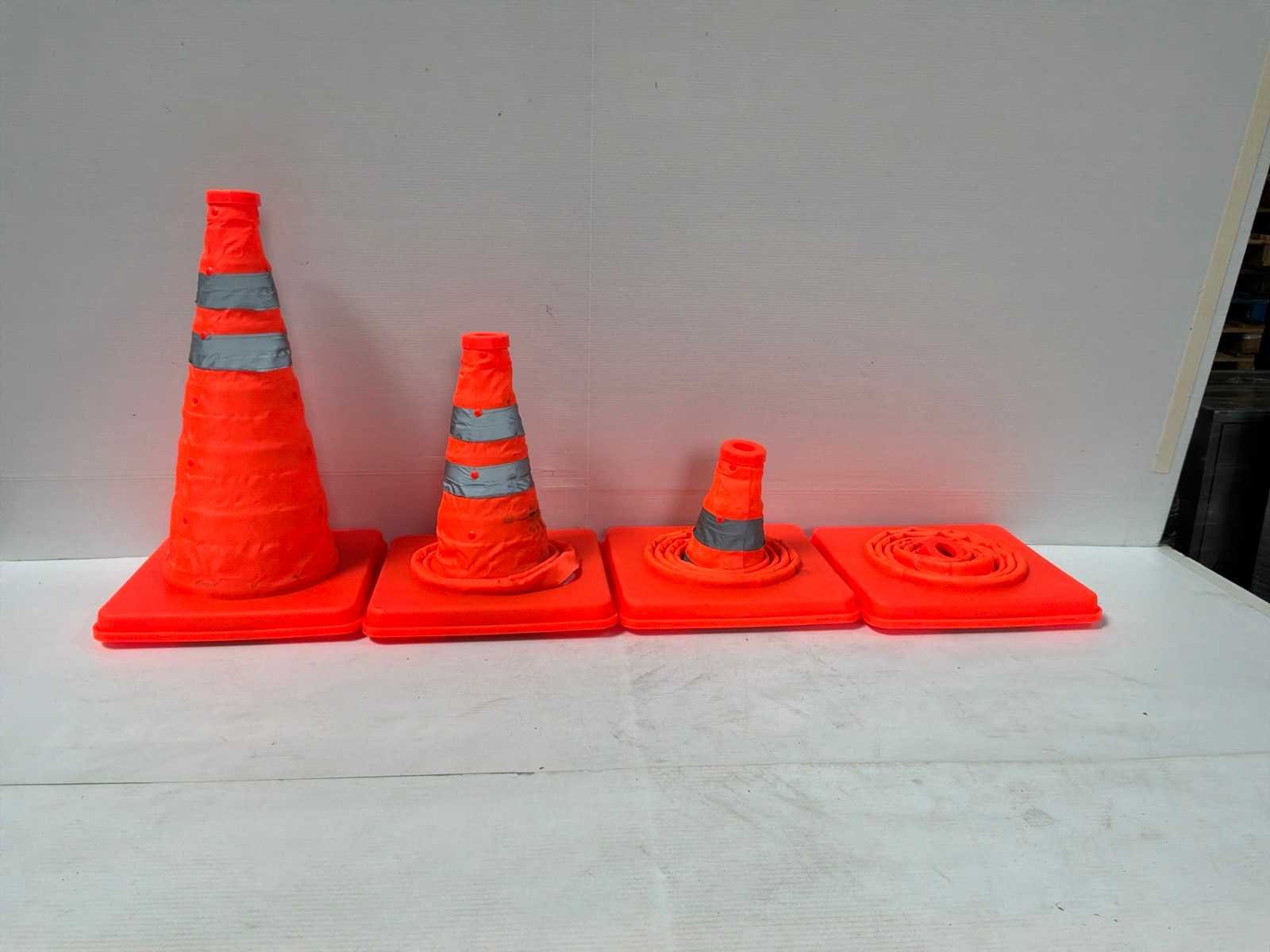 9x opvouwbare kegel met afmetingen: basisplaat 25 x 25cm en totale hoogte inclusief signalisatielicht 45cm. Waarvan 5 in originele draagtas met signalisatielicht en 4 zonder draagtas waarvan 2 met signalisatielicht. Lichte gebruiksschade —> zie foto’s 3x opvouwbare kegel met afmetingen: basisplaat 32 x 32cm en totale hoogte 73cm