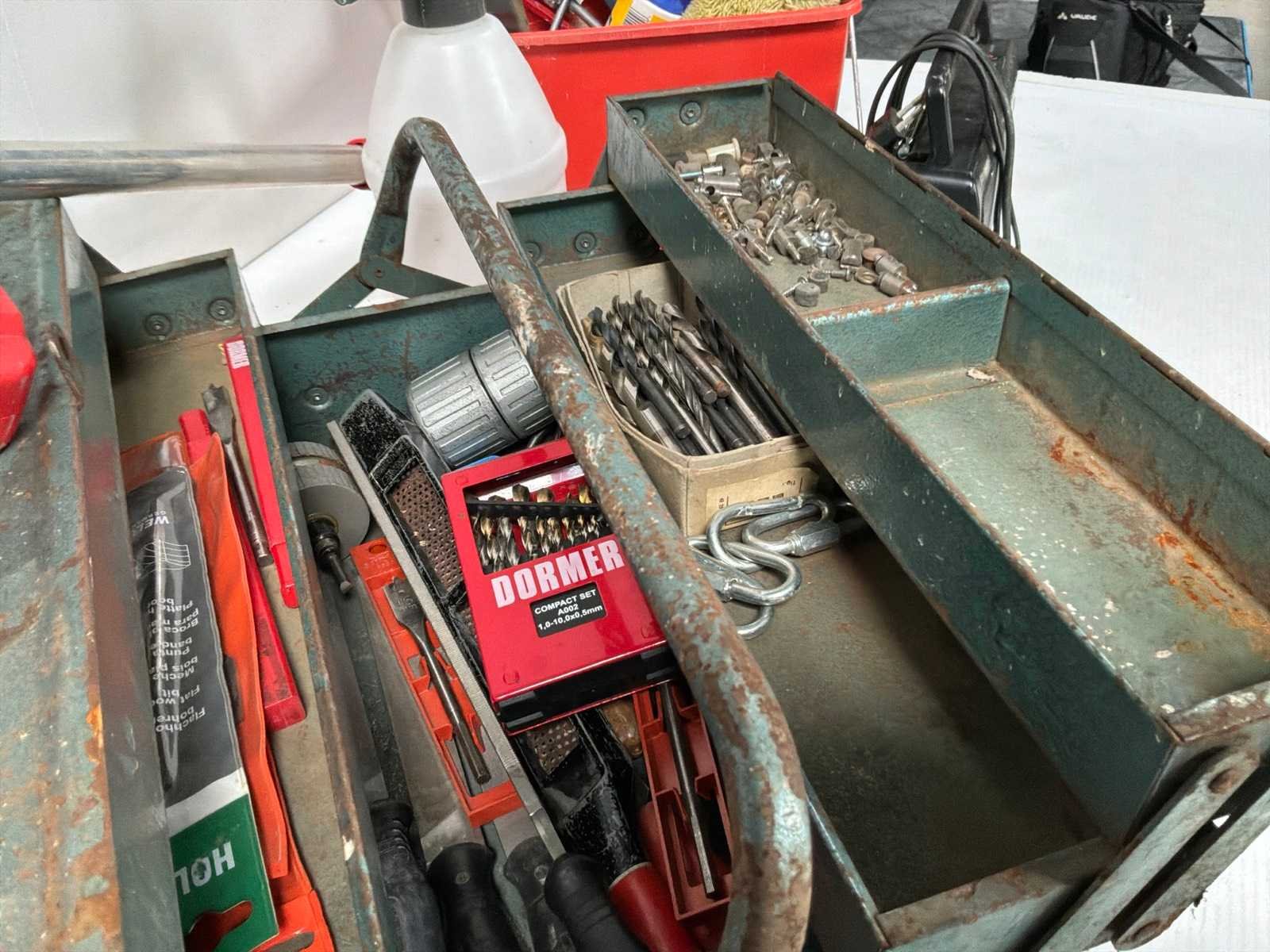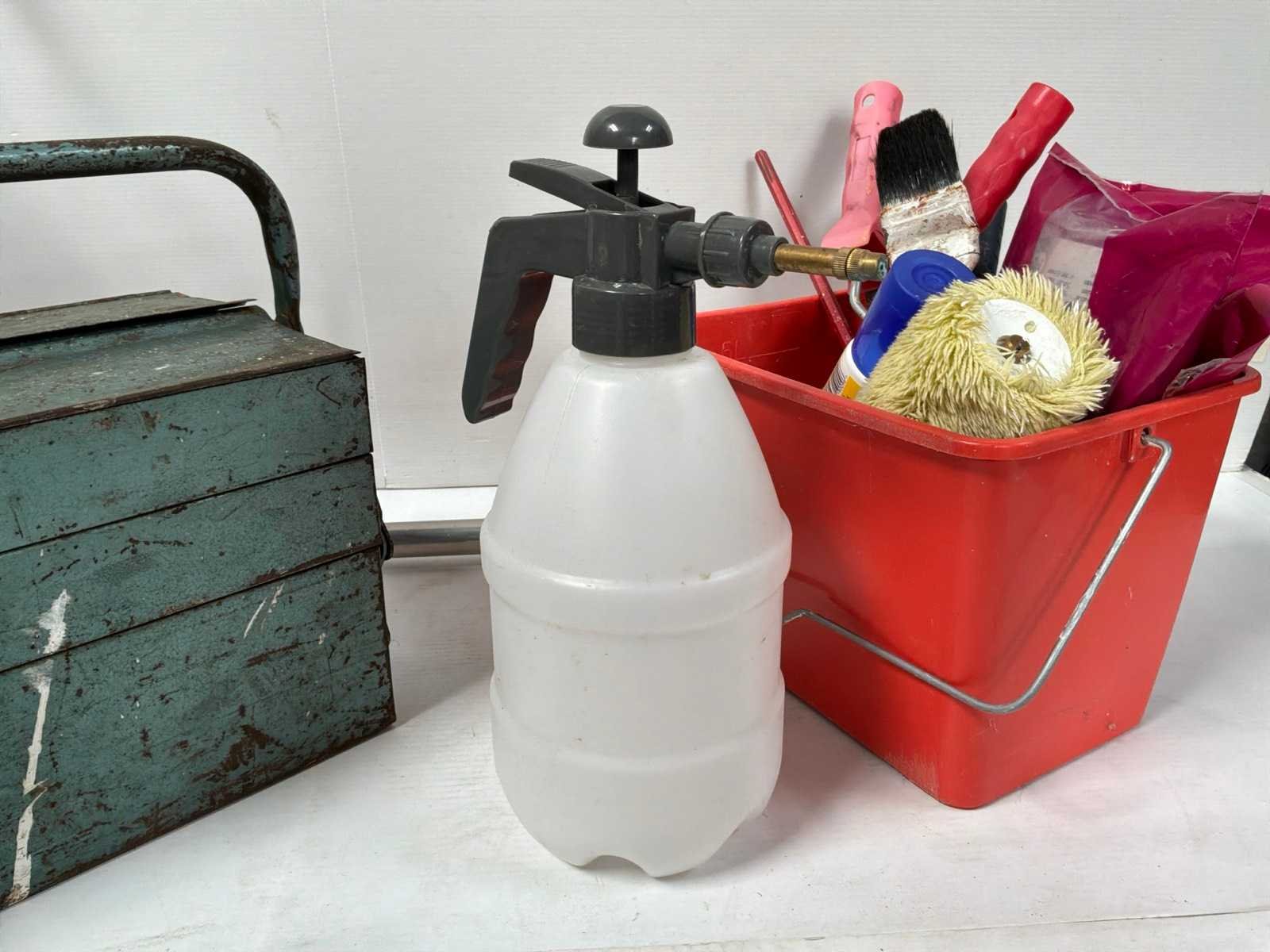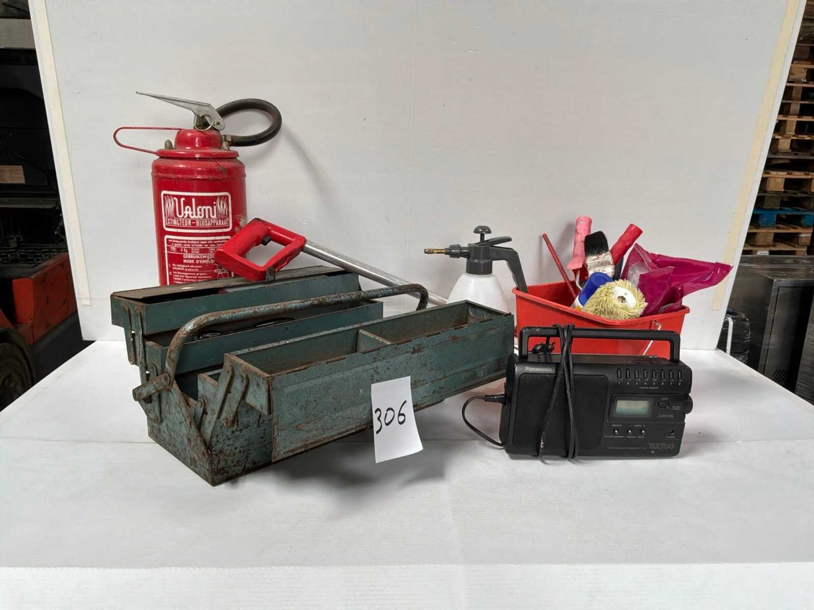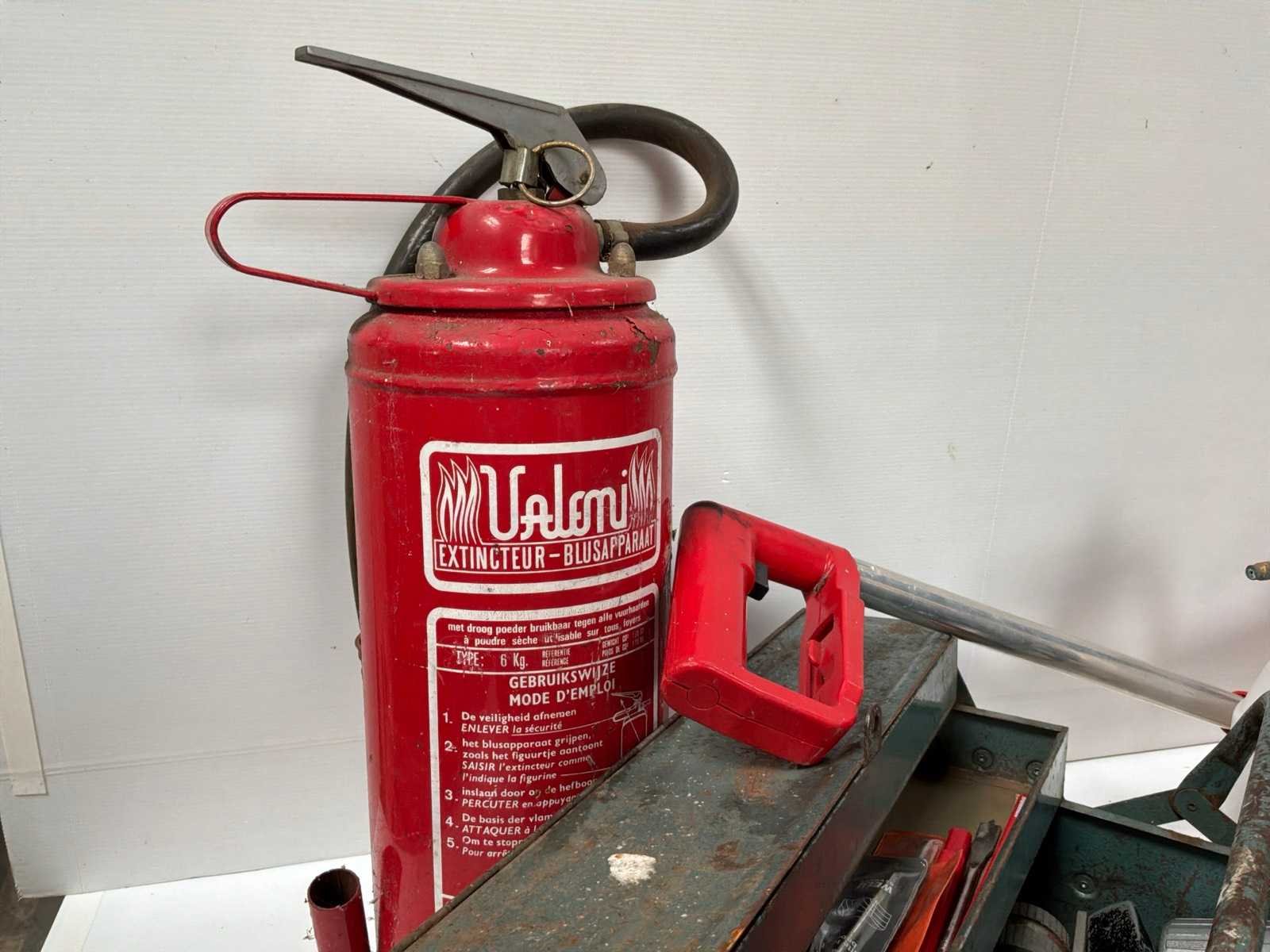 Waaronder onder meer 1x metalen gereedschapskist met inhoud, 1x brandblusser, 1x emmer met verfborstels en -rollen,…