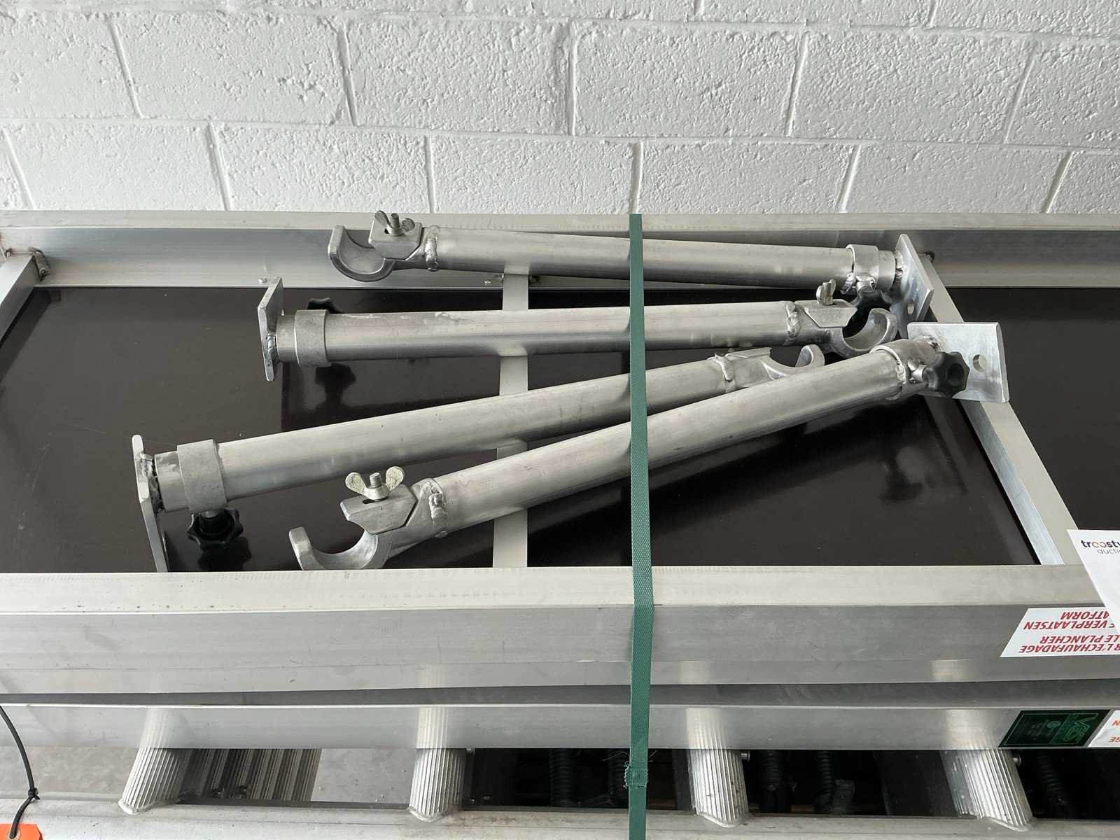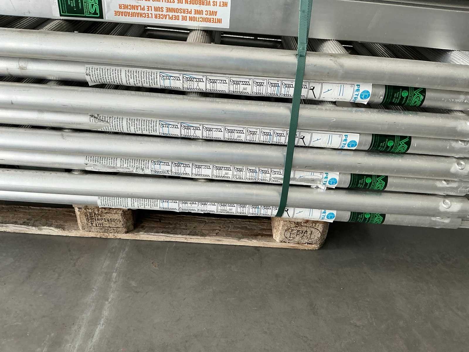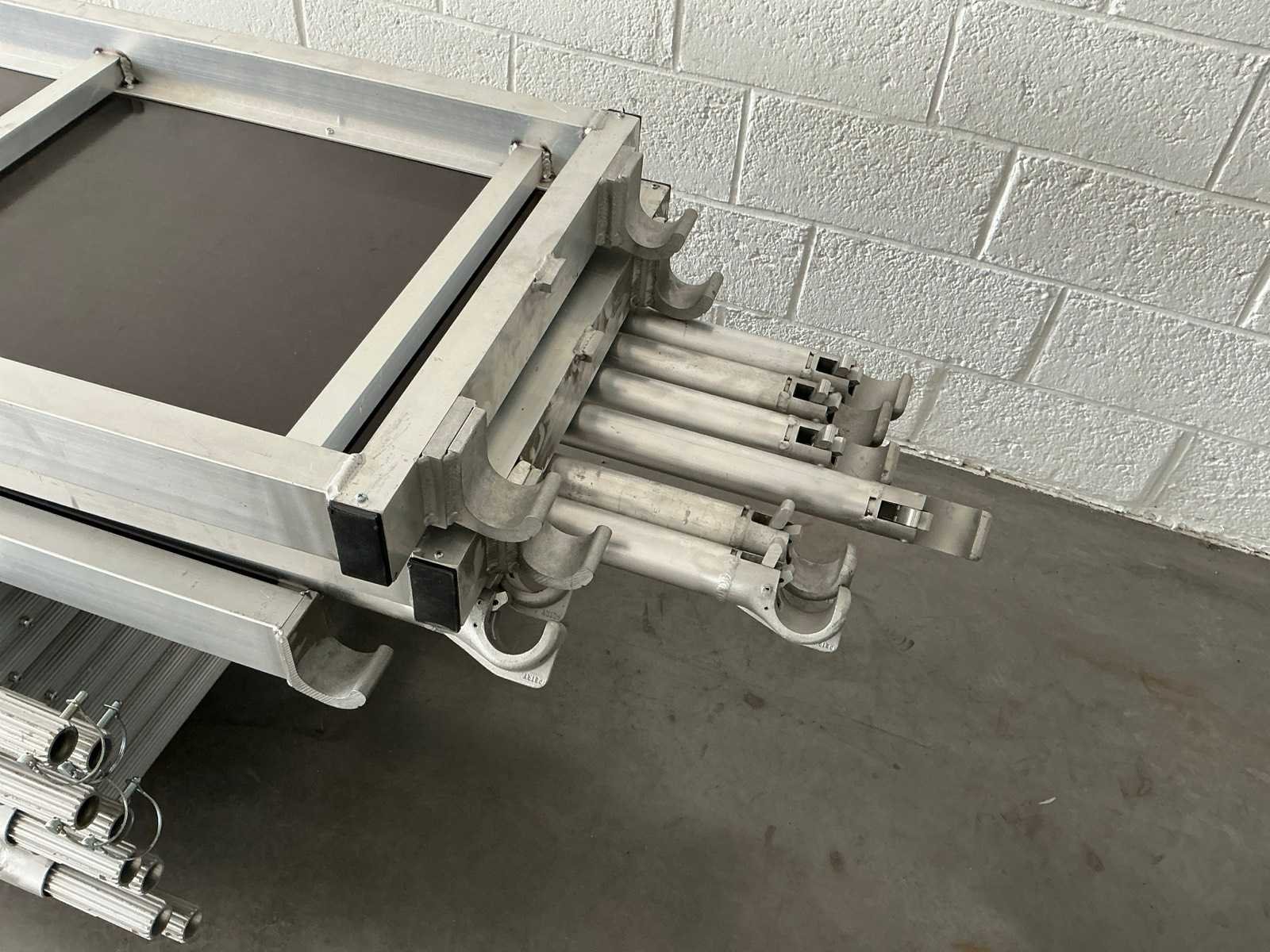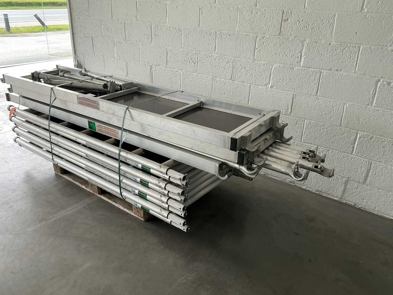 Gevelsteiger aluminium 90x750cm. Stahoogte: 3,25m. Werkhoogte: 5,25m. Bestaande uit: - 8 elementen 90 x 200cm. - 8 regelbare voet. - 6 diagonaal 250cm. - 6 horizontaal 250cm. - 8 borgpennen. - 2 platform met luik. - 4 muurklemmen. - Ongebruikt. - De eerste foto is louter ter illustratie. De werkelijke samenstelling en uitvoering van de kavels kunnen afwijken. Merk: Petry Aluminium: true