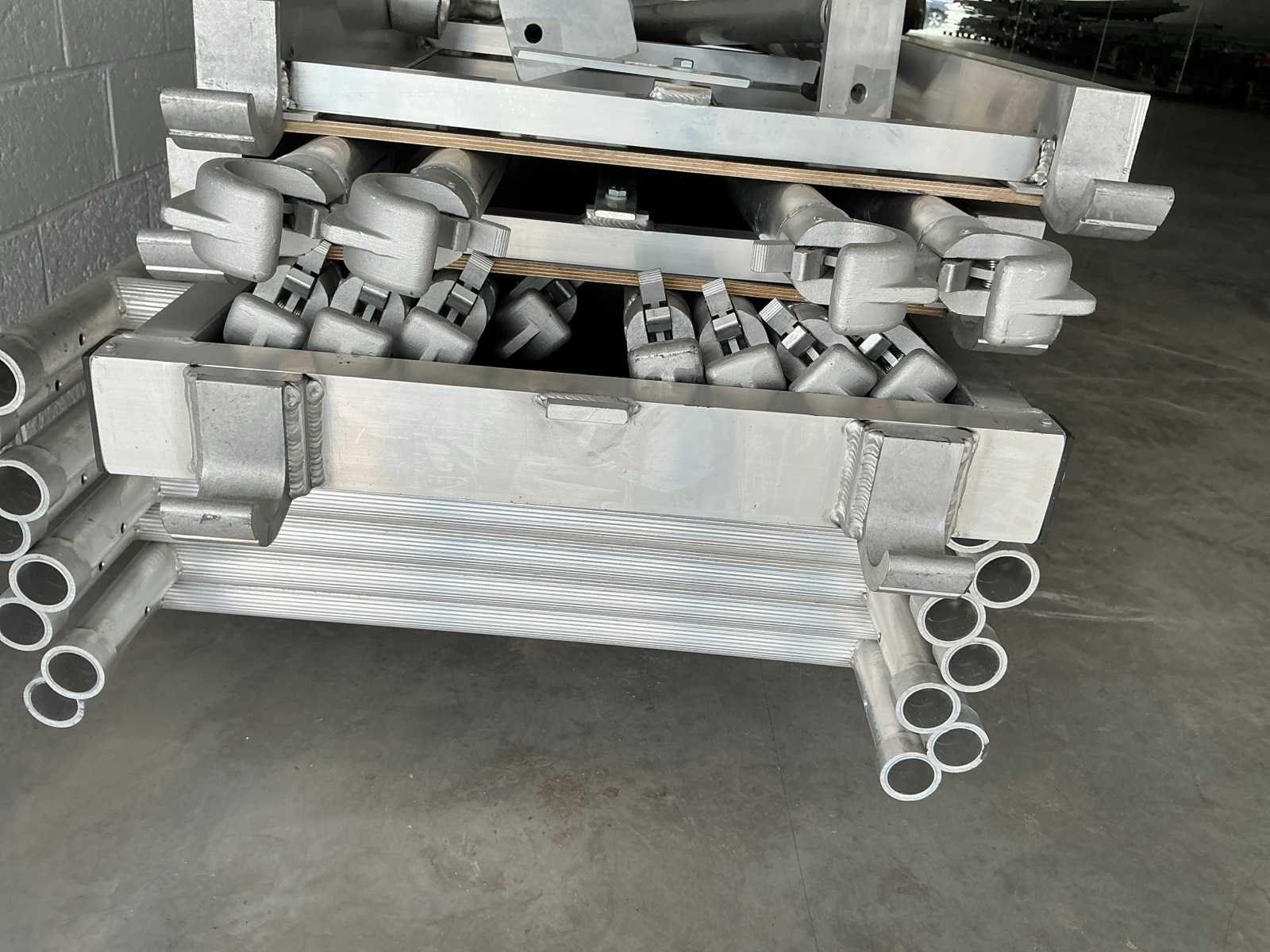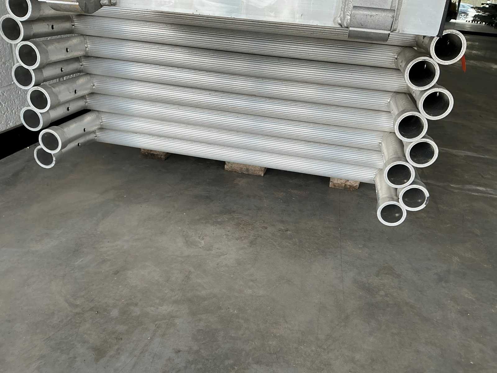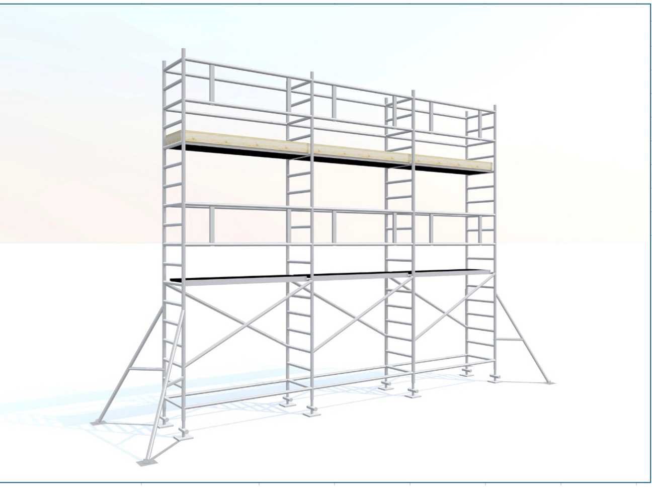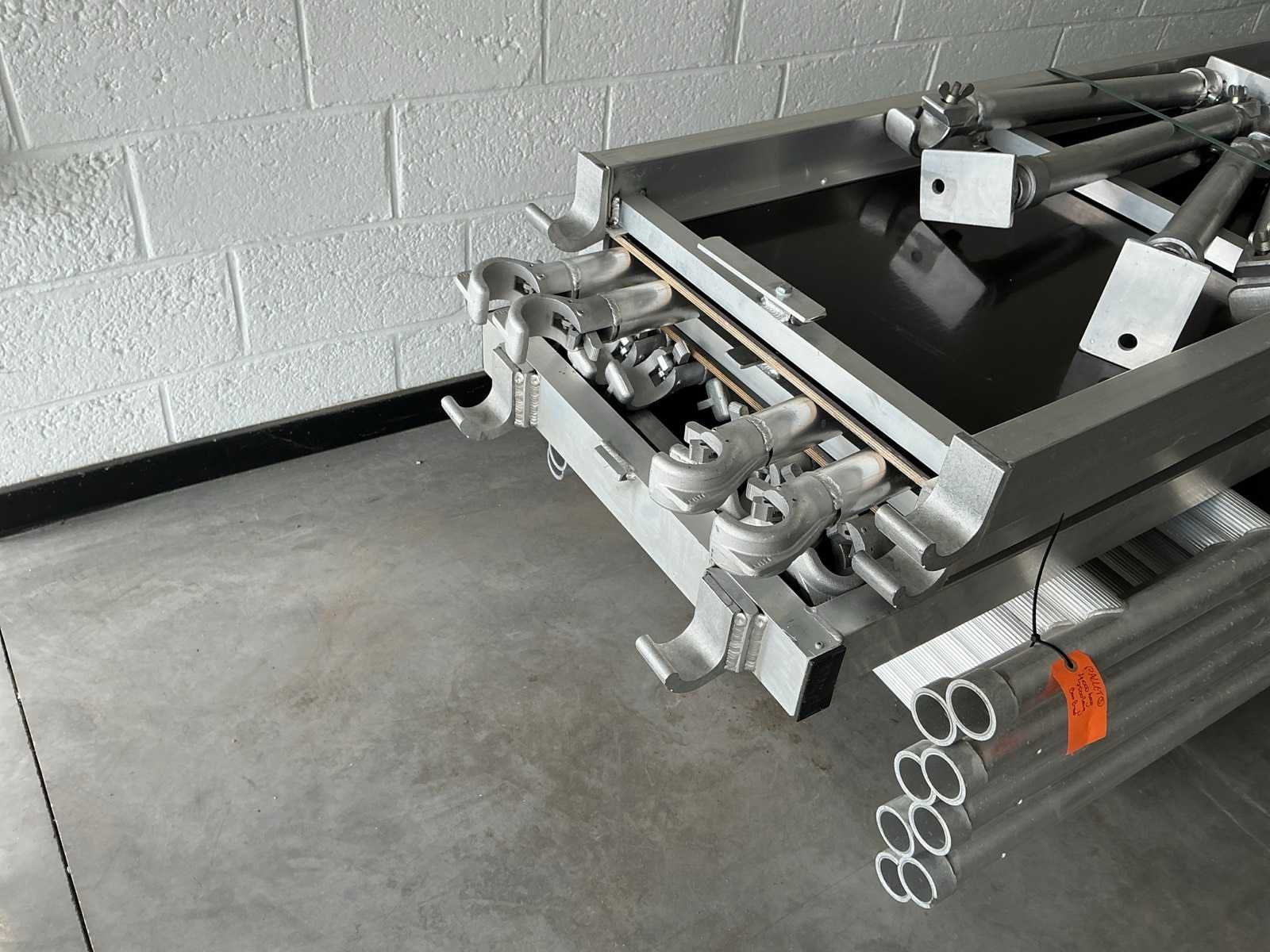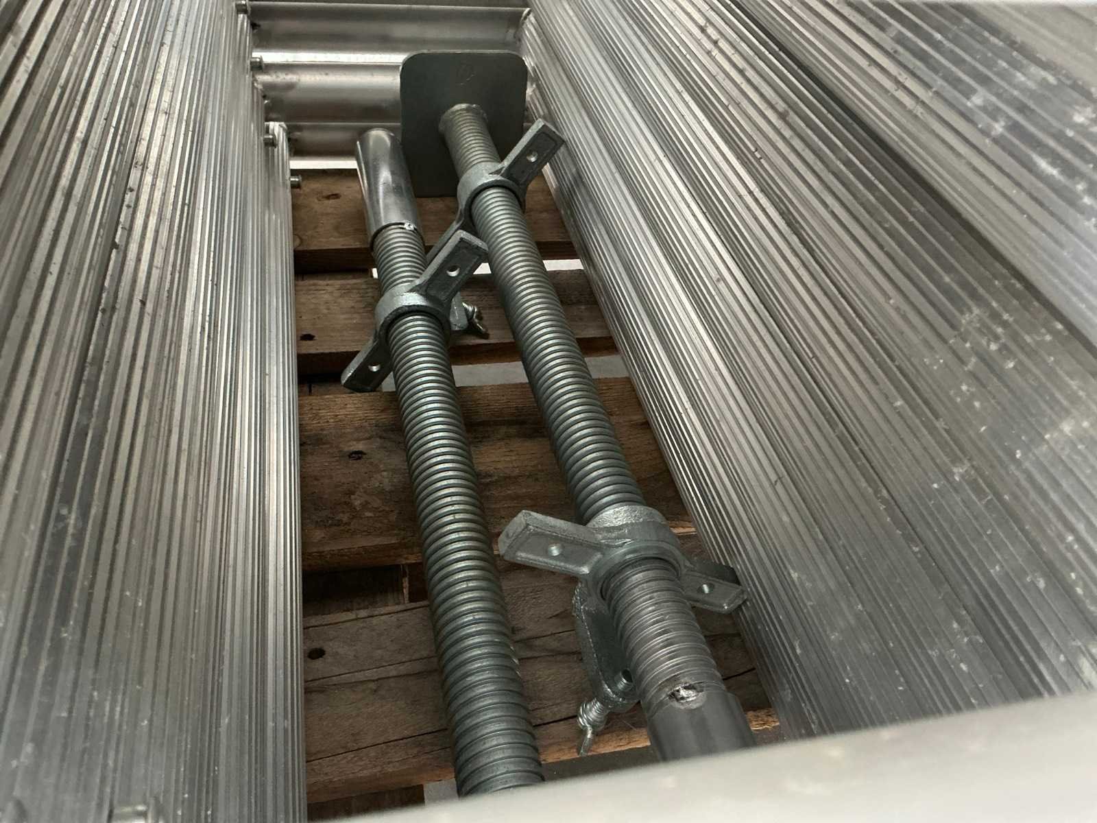 Gevelsteiger aluminium 90x750cm. Stahoogte: 3,25m. Werkhoogte: 5,25m. Bestaande uit: - 8 elementen 90 x 200cm. - 8 regelbare voet. - 6 diagonaal 250cm. - 6 horizontaal 250cm. - 8 borgpennen. - 2 platform met luik. - 4 muurklemmen. - Ongebruikt. - De eerste foto is louter ter illustratie. De werkelijke samenstelling en uitvoering van de kavels kunnen afwijken. Merk: Petry Aluminium: true
