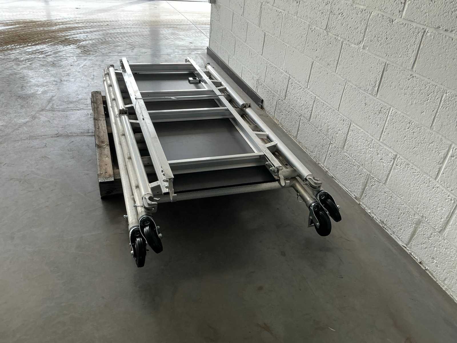Plooisteiger afmeting 75x190cm. - Stahoogte: 1meter. - Werkhoogte: 3meter. - Plooiunit met vloer, luik en 4 wielen. - ongebruikt. - De eerste foto is louter ter illustratie. De werkelijke samenstelling en uitvoering van de kavels kunnen afwijken.