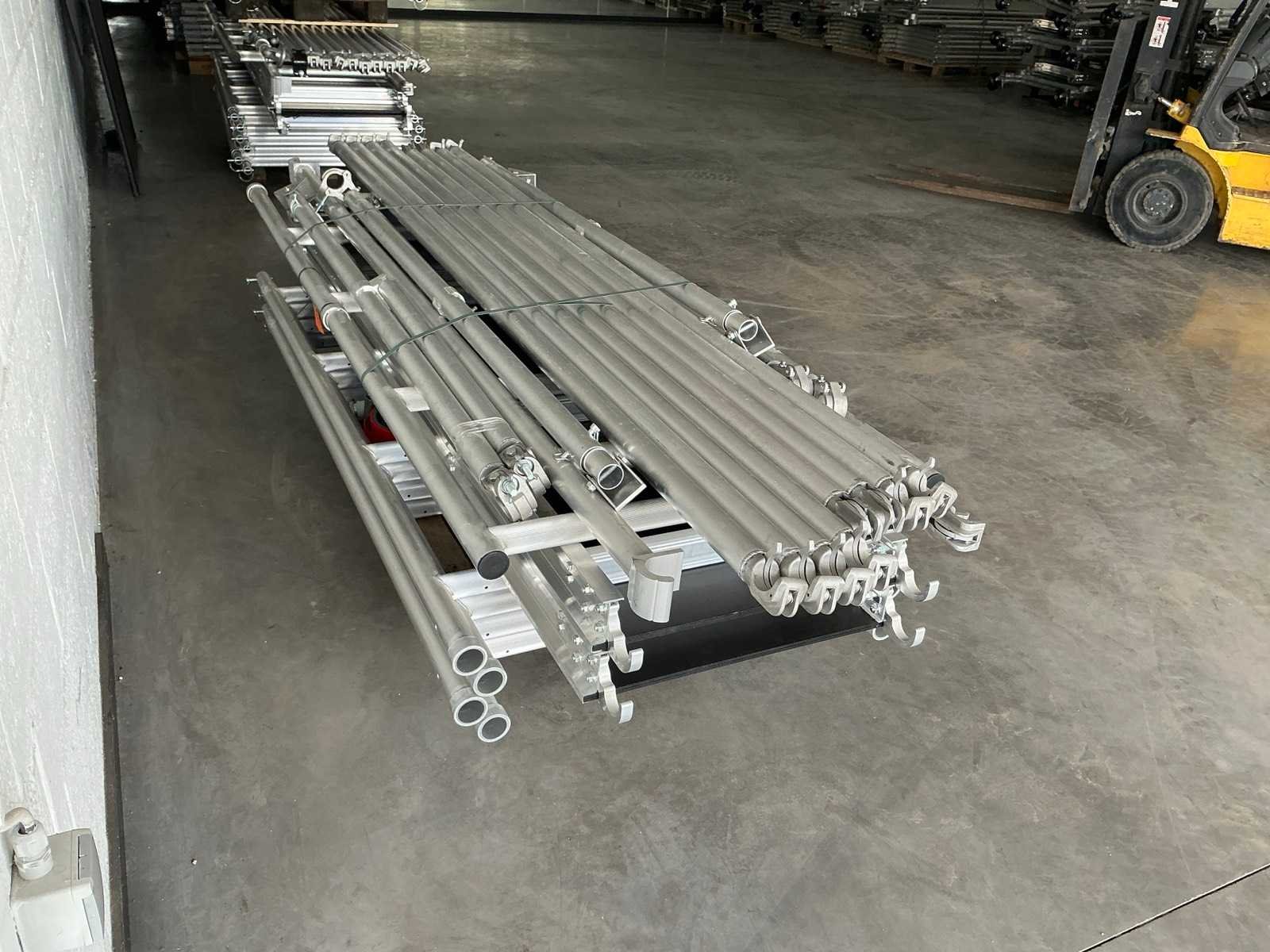 Afmeting 90x250cm. - Stahoogte: 4,25meter. - Werkhoogte: 6,25meter. Bestaande uit: - 4 elementen 90x200 cm. - 2 elementen 90 x 100cm. - 2 platform 2,5meter. - 1 dubbele leuning 2,5meter. - 4 regelbare wielen dia 200 met rem. - 8 borgpennen. - 4 kleine zijsteunen. - 4 diagonaal 2,5 meter. - 4 horizontaal 2,5meter. - ongebruikt. - De eerste foto is louter ter illustratie. De werkelijke samenstelling en uitvoering van de kavels kunnen afwijken.