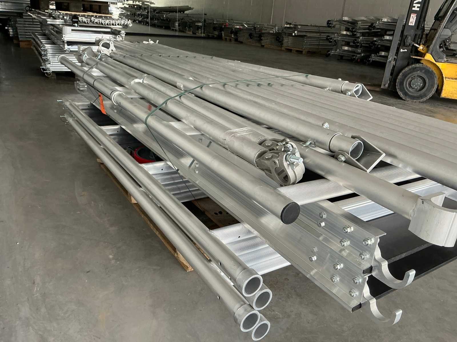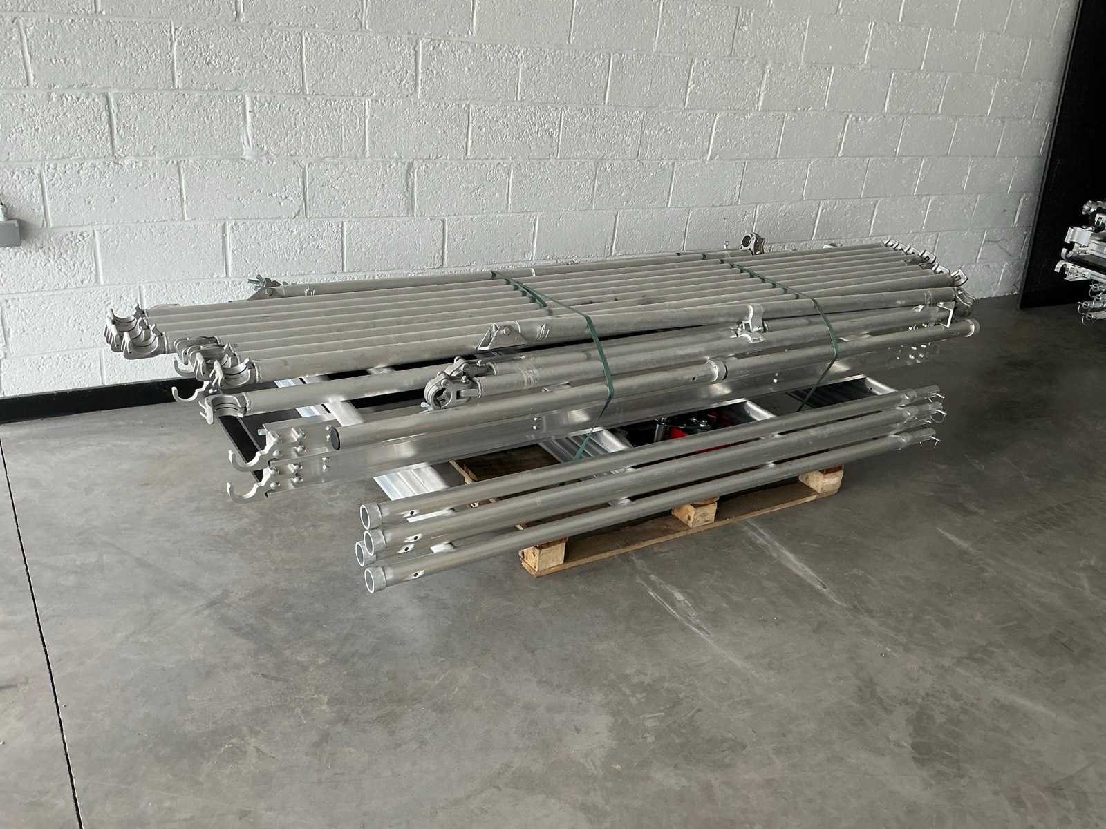 Afmeting 90x250cm. - Stahoogte: 4,25meter. - Werkhoogte: 6,25meter. Bestaande uit: - 4 elementen 90x200 cm. - 2 elementen 90 x 100cm. - 2 platform 2,5meter. - 1 dubbele leuning 2,5meter. - 4 regelbare wielen dia 200 met rem. - 8 borgpennen. - 4 kleine zijsteunen. - 4 diagonaal 2,5 meter. - 4 horizontaal 2,5meter. - ongebruikt. - De eerste foto is louter ter illustratie. De werkelijke samenstelling en uitvoering van de kavels kunnen afwijken.