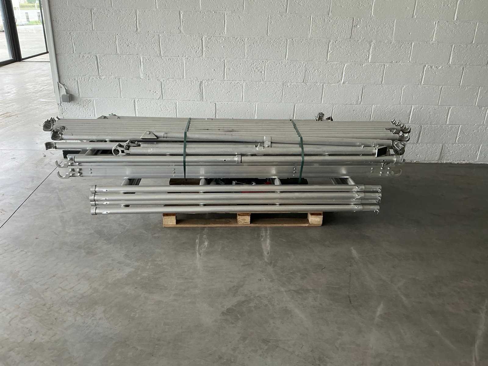 Afmeting 90x250cm. - Stahoogte: 4,25meter. - Werkhoogte: 6,25meter. Bestaande uit: - 4 elementen 90x200 cm. - 2 elementen 90 x 100cm. - 2 platform 2,5meter. - 1 dubbele leuning 2,5meter. - 4 regelbare wielen dia 200 met rem. - 8 borgpennen. - 4 kleine zijsteunen. - 4 diagonaal 2,5 meter. - 4 horizontaal 2,5meter. - ongebruikt. - De eerste foto is louter ter illustratie. De werkelijke samenstelling en uitvoering van de kavels kunnen afwijken.