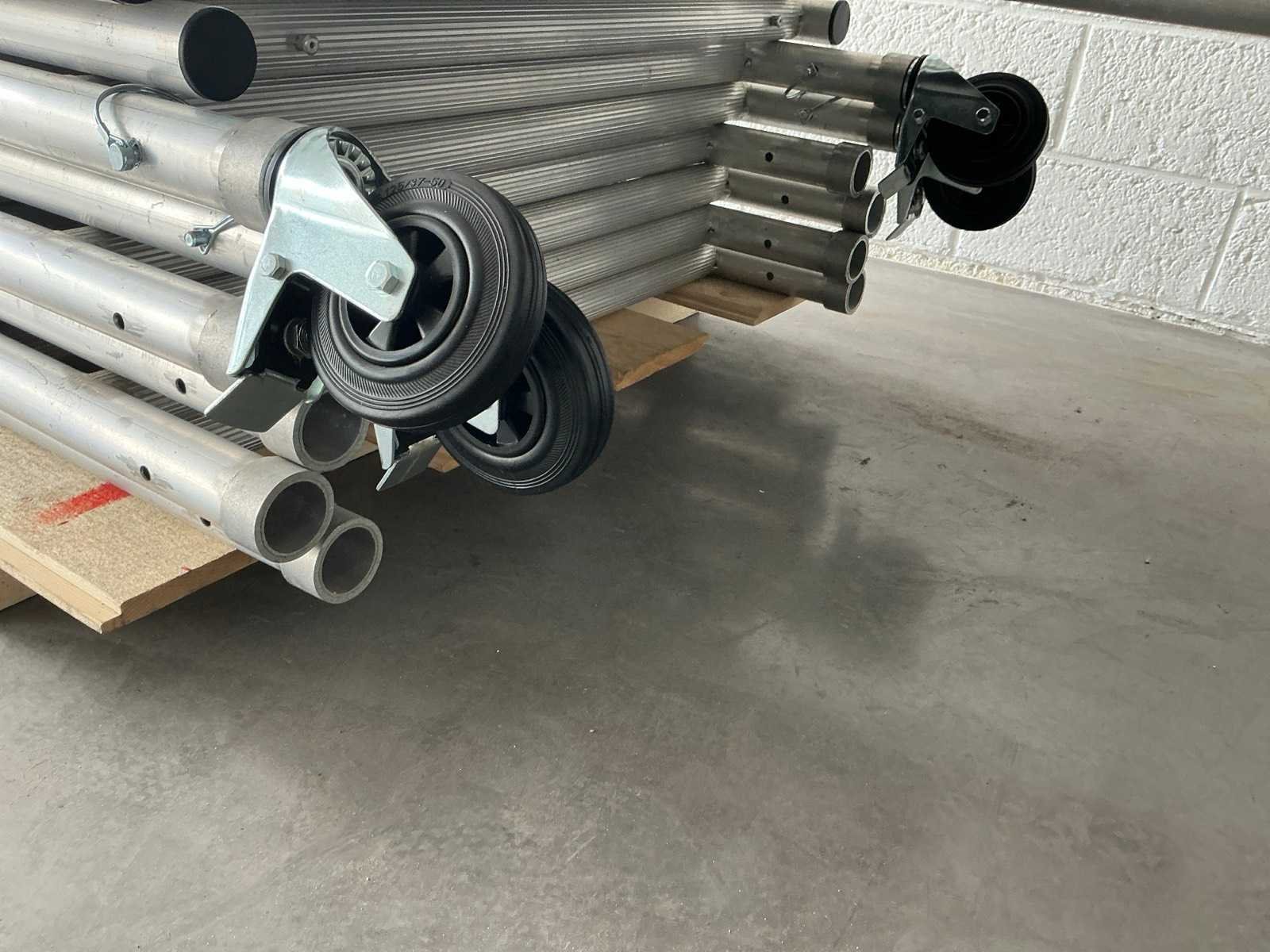 Vouwsteiger afmeting 90x200cm. - Stahoogte: 2,25meter. - Werkhoogte: 4,25meter. Bestaande uit: - 6 elementen 90x110cm. - 2 elementen 90x110cm - 1 platform met luik. - 2 zijsteunen. - 1 vouwelement 2meter lang. - 2 horizontaal 2meter lang. - 4 diagonaal. - 12 borgpennen. - 4 geremde wielen dia 125mm. - ongebruikt. - De eerste foto is louter ter illustratie. De werkelijke samenstelling en uitvoering van de kavels kunnen afwijken.