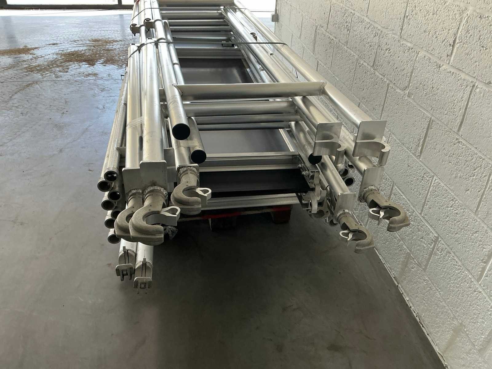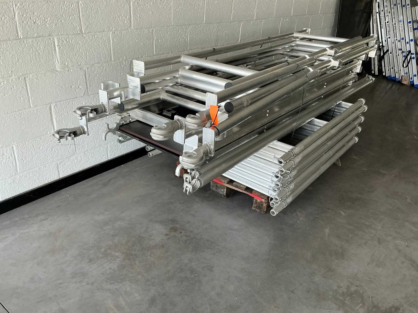 Afmeting 115x250cm. - Stahoogte: 4,25meter. - Werkhoogte: 6,25meter. Bestaande uit: - 8 elementen 1150mm breed. - 4 zware regelbare wielen dia 200mm met rem. - 2 platform met luik 2,5m. - 5 voorloopleuning 2,5meter. - 2 diagonaal 2,5meter. - 2 zijsteunen. - 12 borgpennen. - De eerste foto is louter ter illustratie. De werkelijke samenstelling en uitvoering van de kavels kunnen afwijken. - ongebruikt.