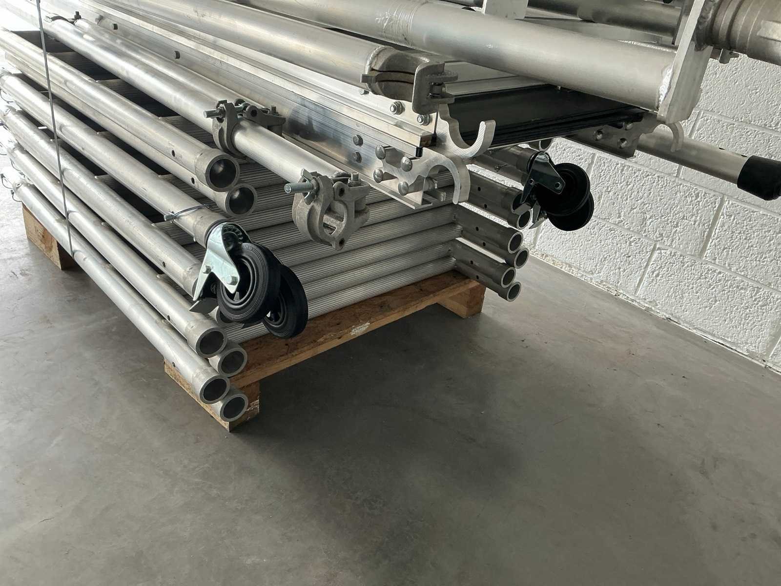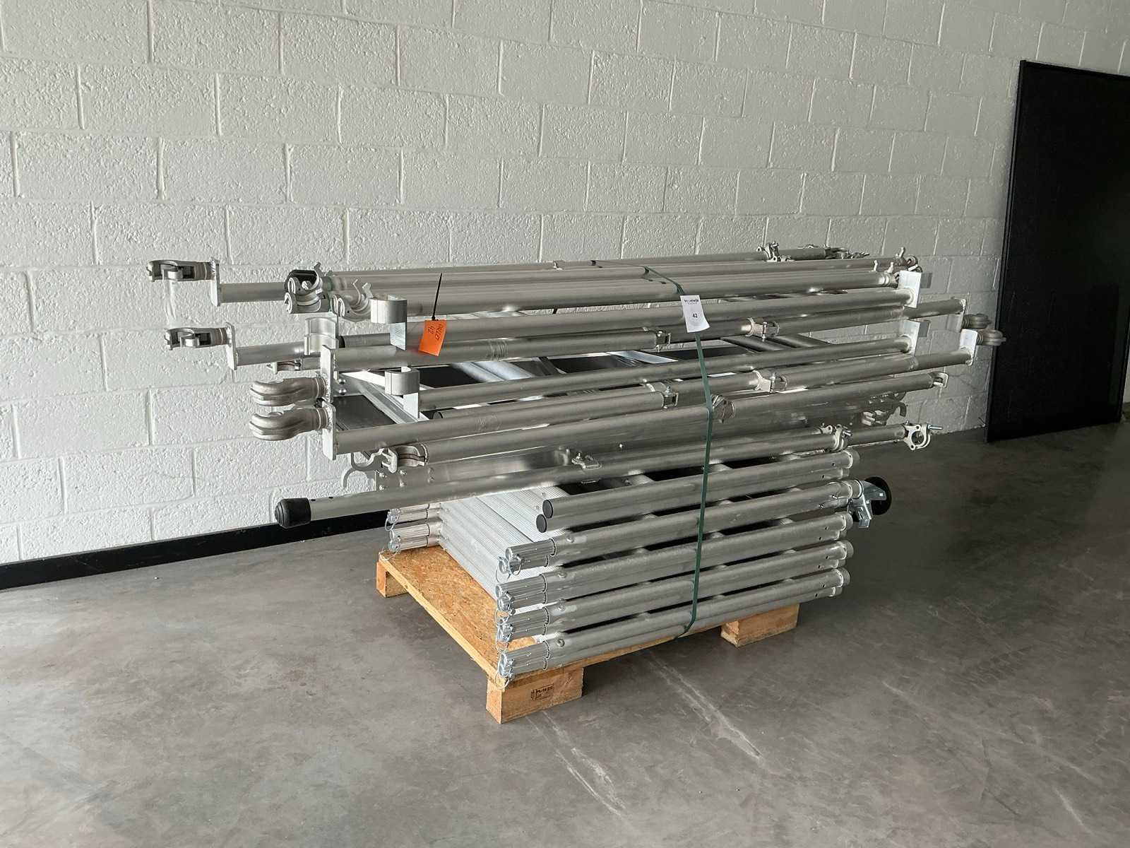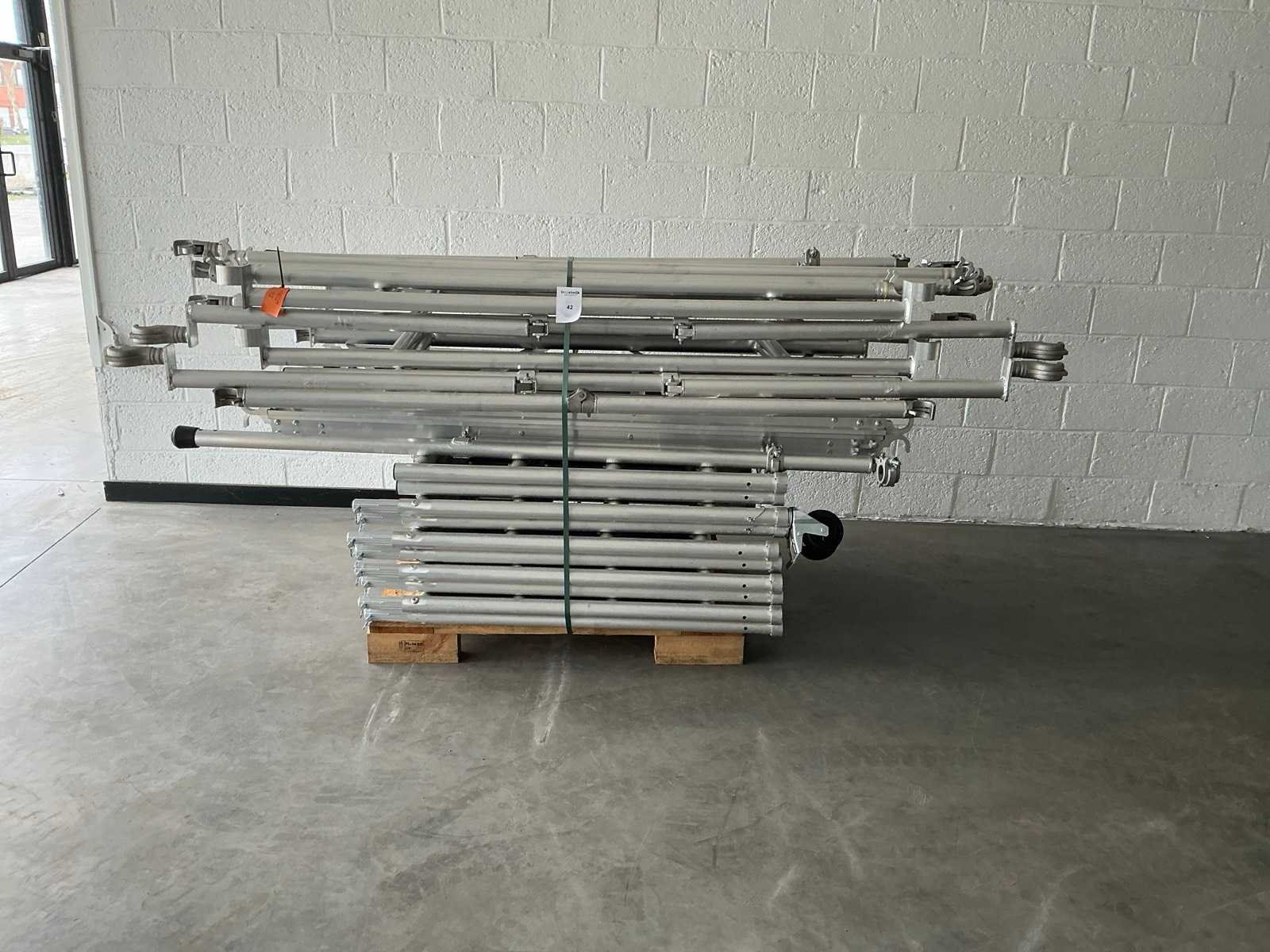 90x200cm. - Stahoogte: 4,25meter. - Werkhoogte: 6,25 werkhoogte. Bestaande uit: - 10 elementen 0,9 x 1m plooi. - 4 wielen dia 125mm. - 1 plooielement 2meter. - 4 voorloopleuning 2meter. - 4 diagonaal 2meter. - 2 borgpennen. - 2 horizontaal 2meter. - 4 zijsteunen. - ongebruikt. - De eerste foto is louter ter illustratie. De werkelijke samenstelling en uitvoering van de kavels kunnen afwijken.
