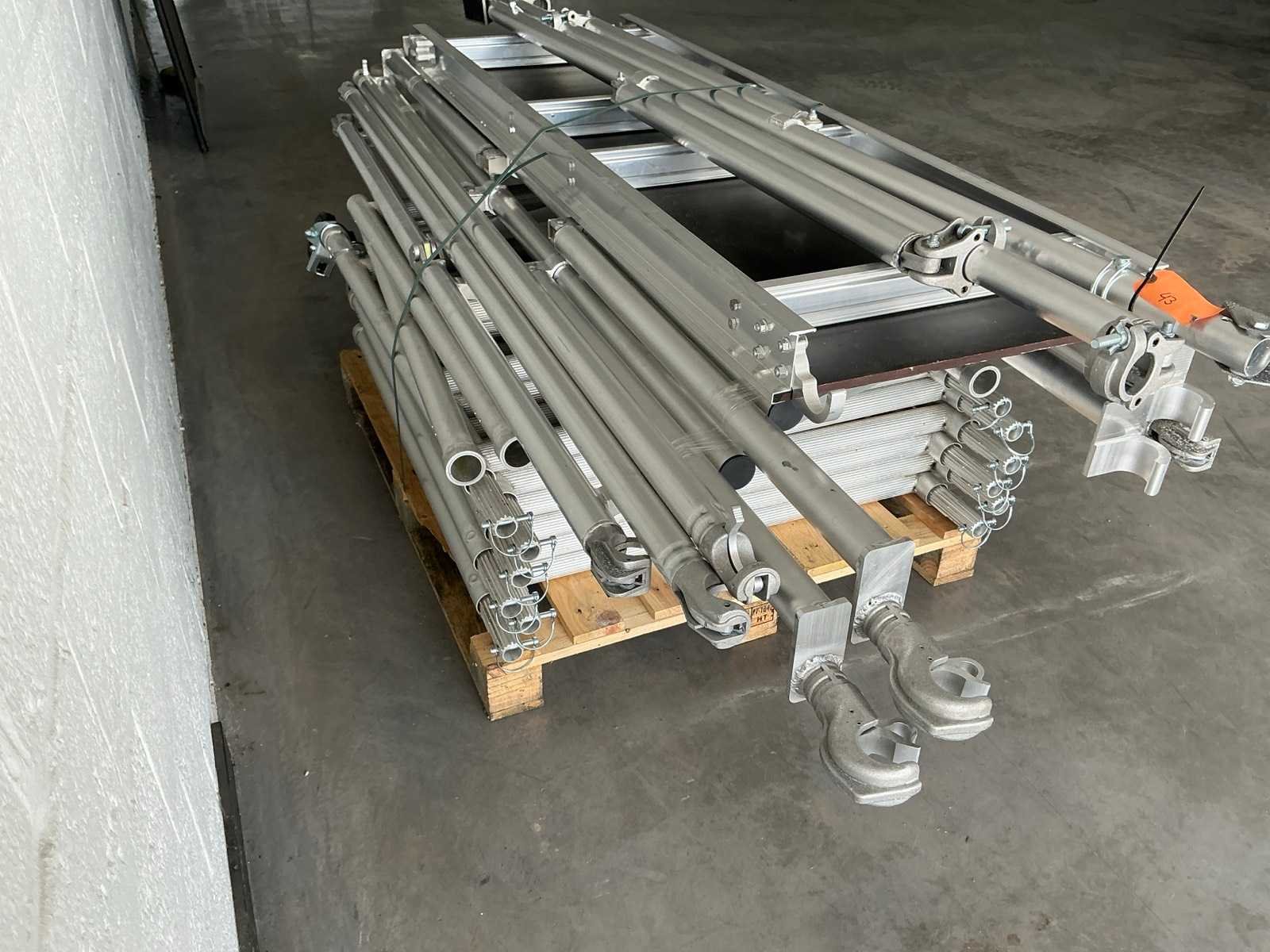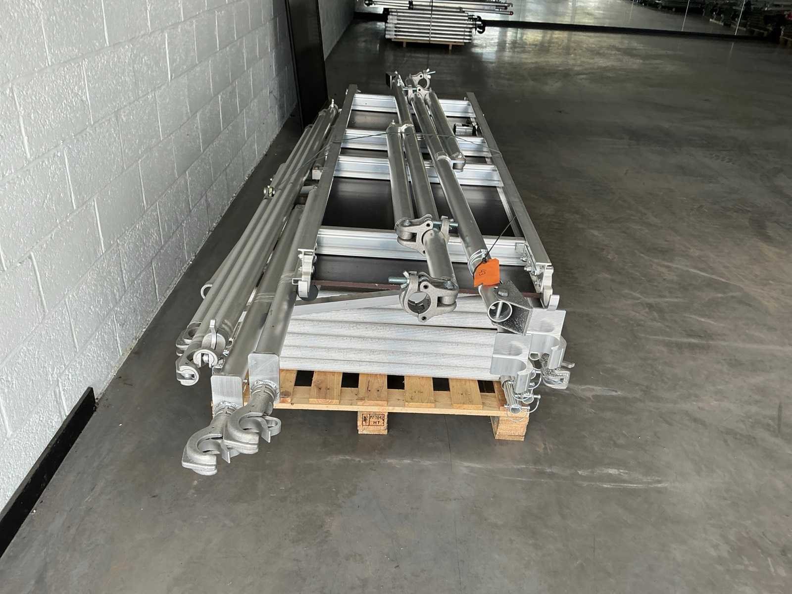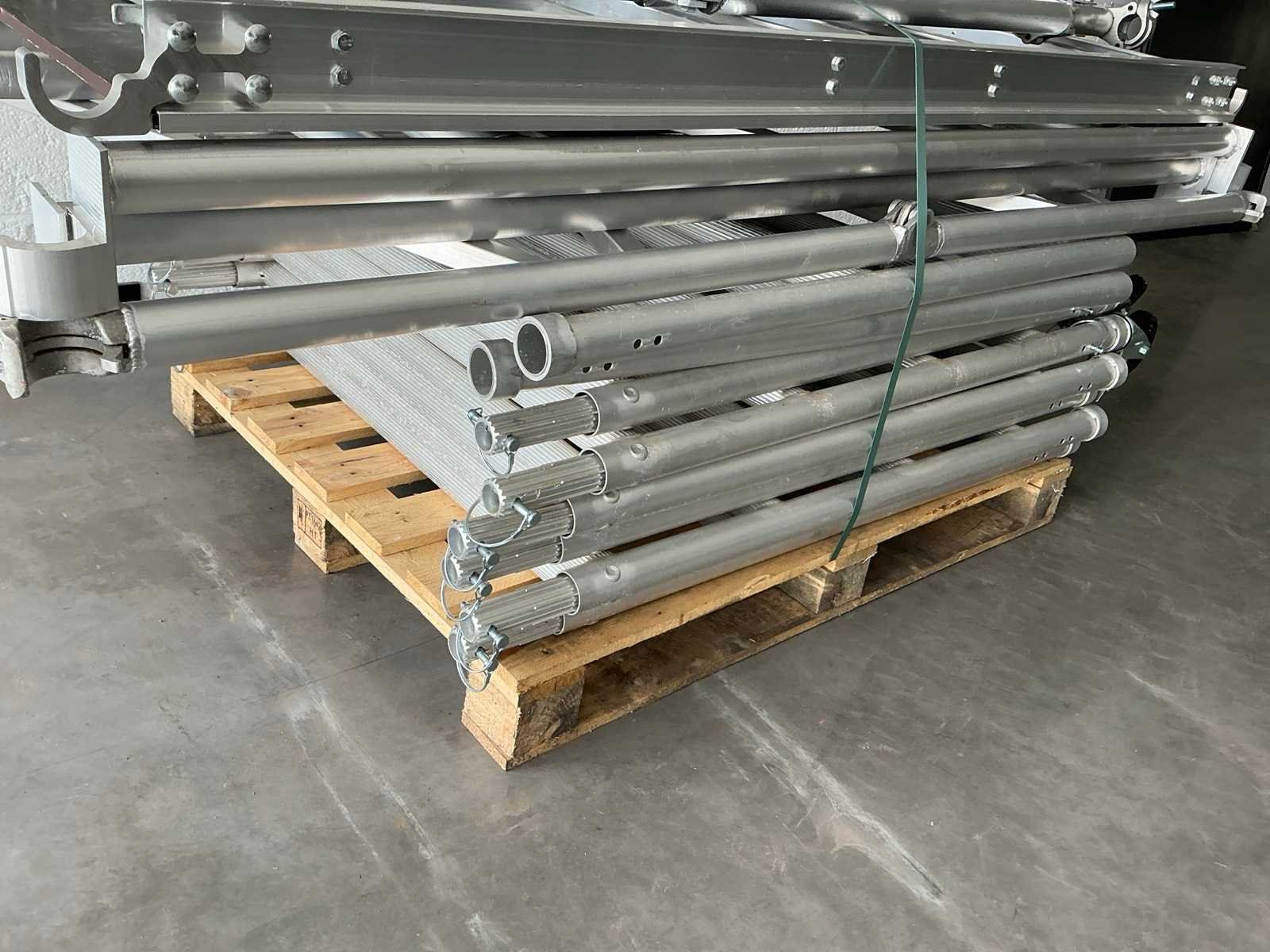 Plooisteiger afmeting 95x200cm. - Stahoogte: 3,25meter. - Werkhoogte: 5,25meter. Bestaande uit: - 6 elementen 0,95 x 1meter. - 2 elementen 0,95 x 1meter. - 4 wielen dia 125mm. - 16 borgpennen. - 2 heupleuning 2meter. - 1 platform met luik 2meter. - 2 diagonaal 2meter. - 2 zijsteunen. - 1 plooielement 2meter. - ongebruikt. - De eerste foto is louter ter illustratie. De werkelijke samenstelling en uitvoering van de kavels kunnen afwijken.