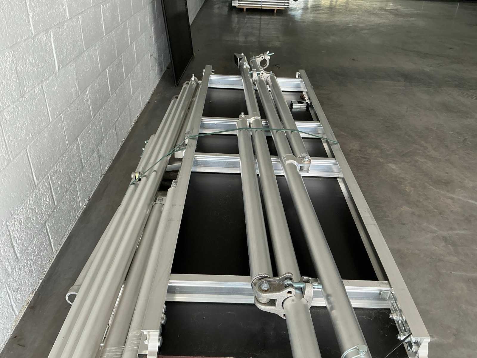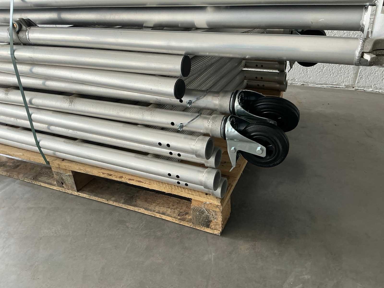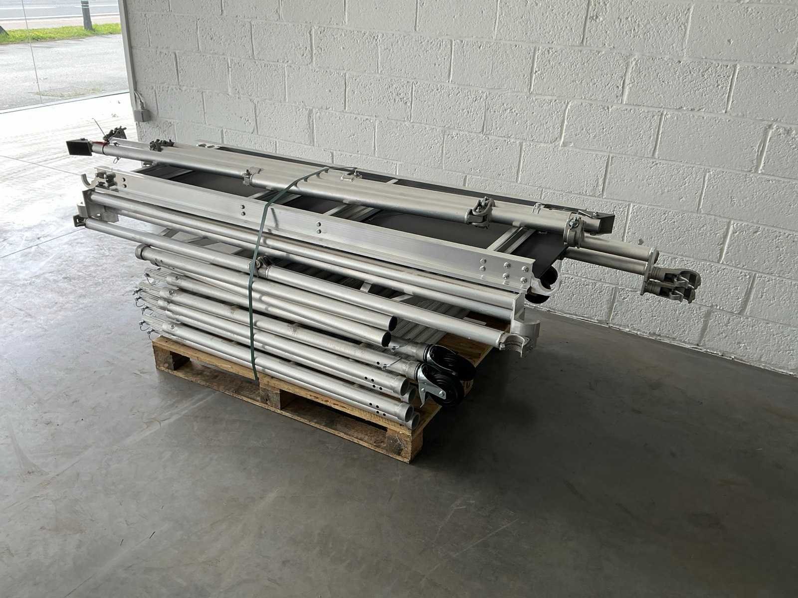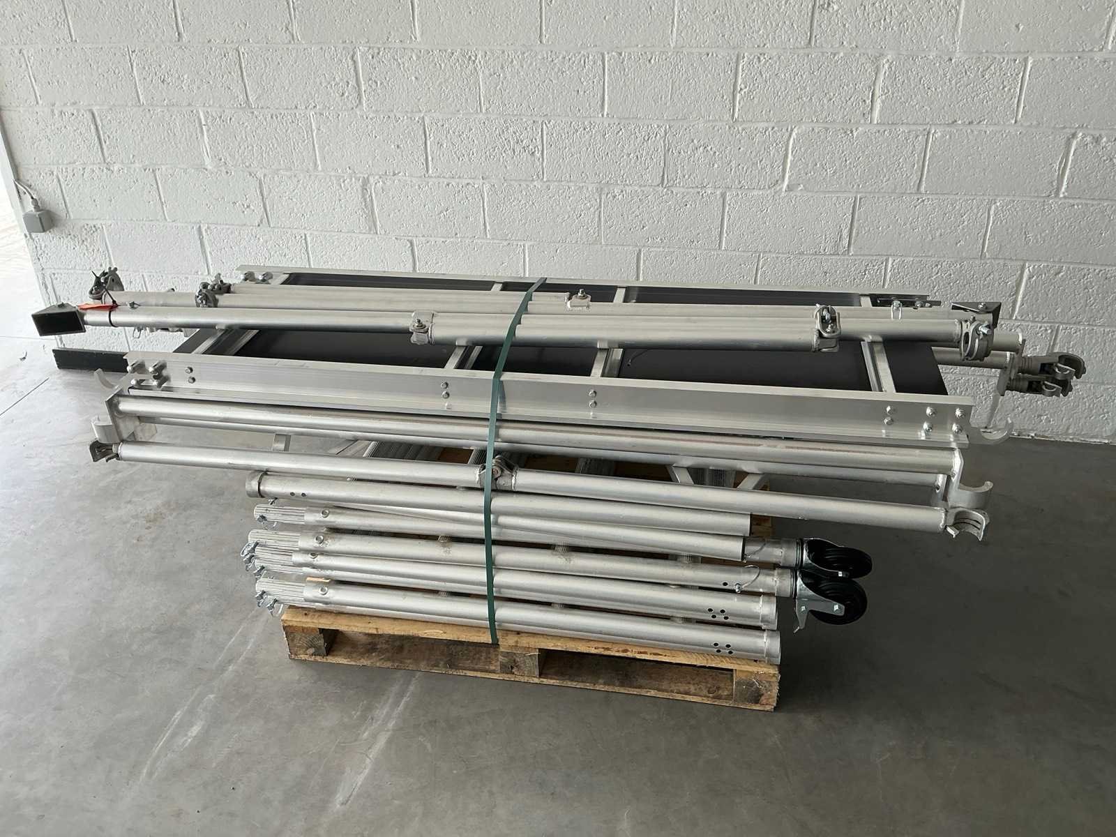 Plooisteiger afmeting 95x200cm. - Stahoogte: 3,25meter. - Werkhoogte: 5,25meter. Bestaande uit: - 6 elementen 0,95 x 1meter. - 2 elementen 0,95 x 1meter. - 4 wielen dia 125mm. - 16 borgpennen. - 2 heupleuning 2meter. - 1 platform met luik 2meter. - 2 diagonaal 2meter. - 2 zijsteunen. - 1 plooielement 2meter. - ongebruikt. - De eerste foto is louter ter illustratie. De werkelijke samenstelling en uitvoering van de kavels kunnen afwijken.