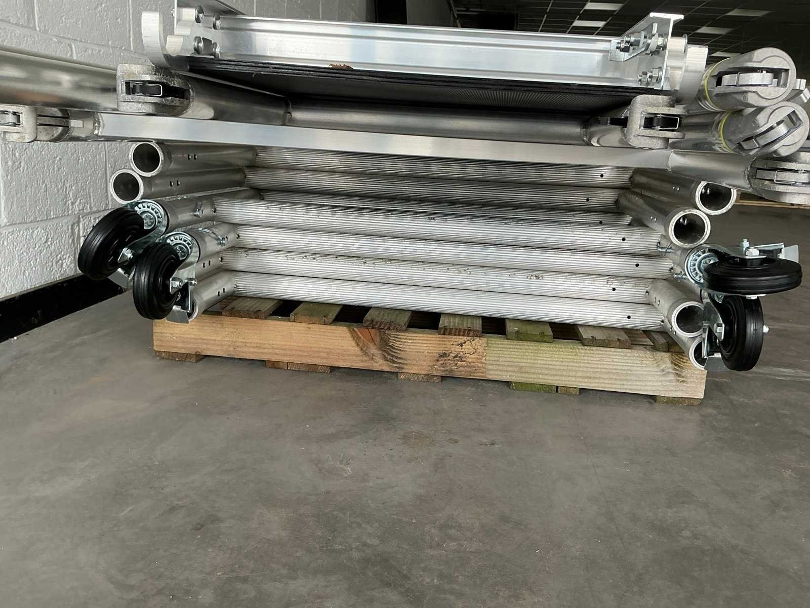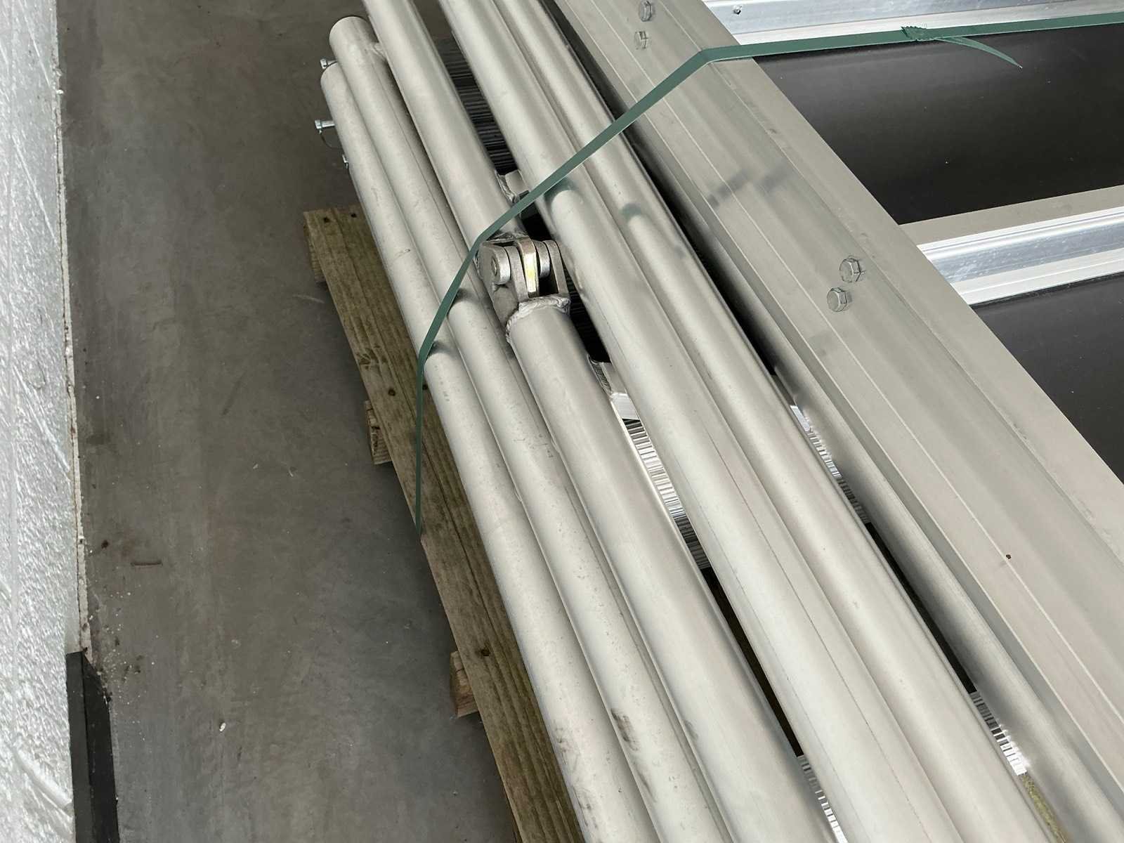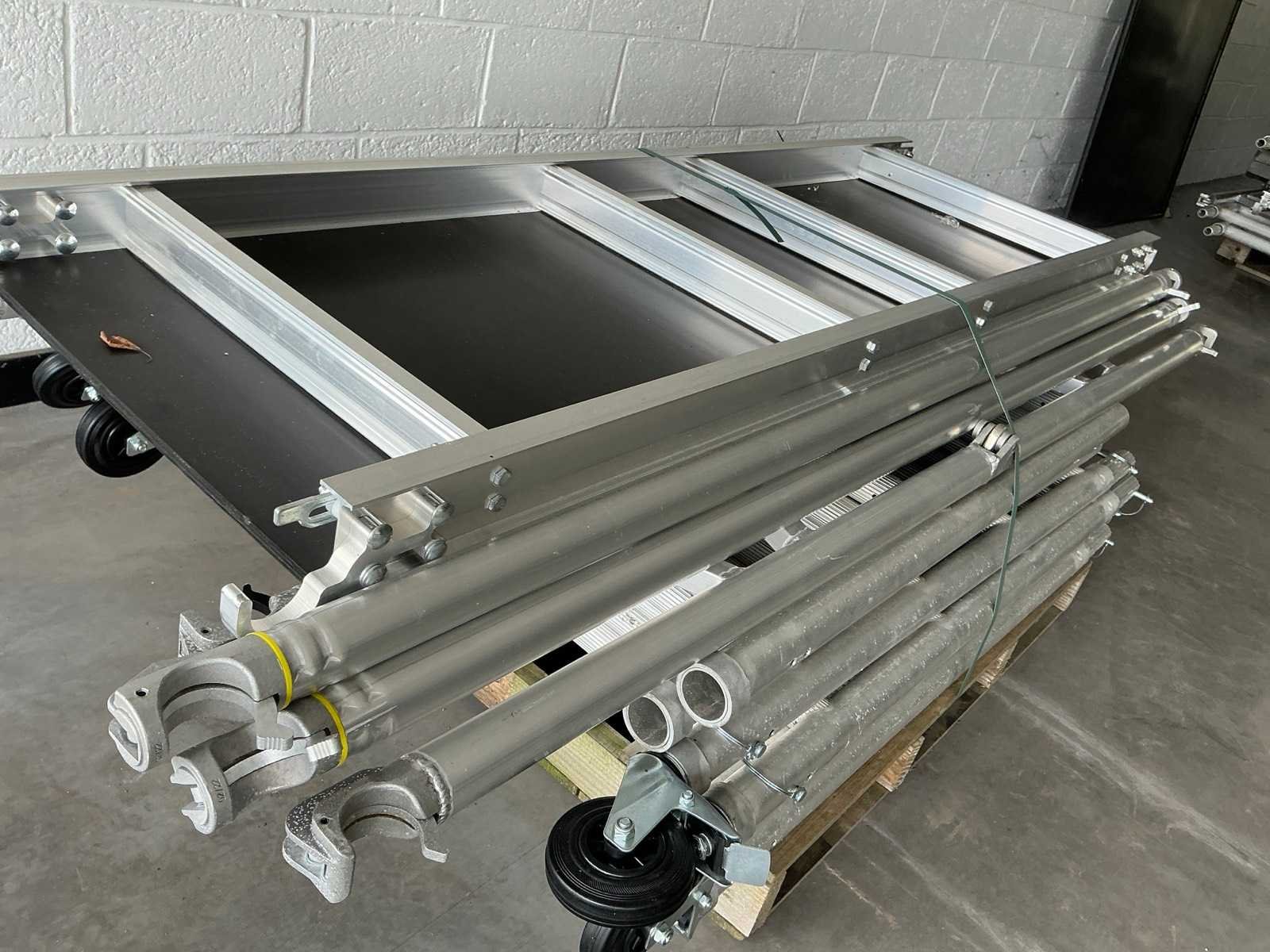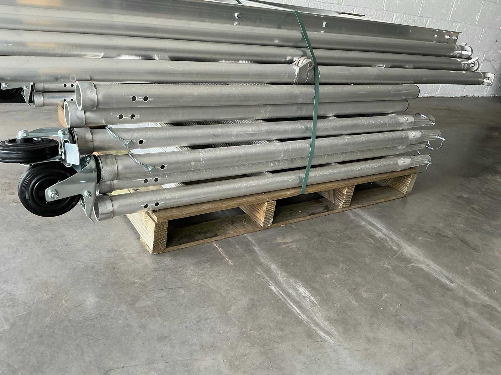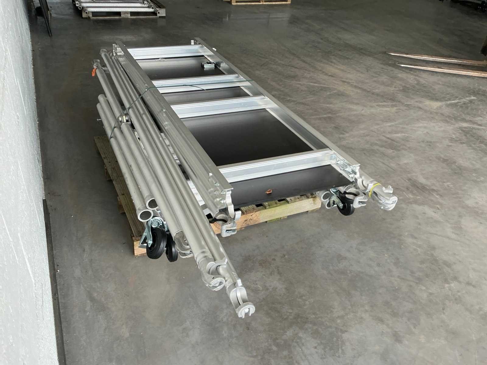 95 x 200cm. - Stahoogte: 2,25meter. - Werkhoogte: 4,25meter. Bestaande uit: - 6 element 0,95 x 1meter plooi. - 1 plooielement 2meter lang. - 2 diagonaal 2meter. - 2 horizontaal 2meter. - 1 dubbele leuning 2meter. - 12 borgpennen. - 1 platform met luik 2meter. - ongebruikt. - De eerste foto is louter ter illustratie. De werkelijke samenstelling en uitvoering van de kavels kunnen afwijken.