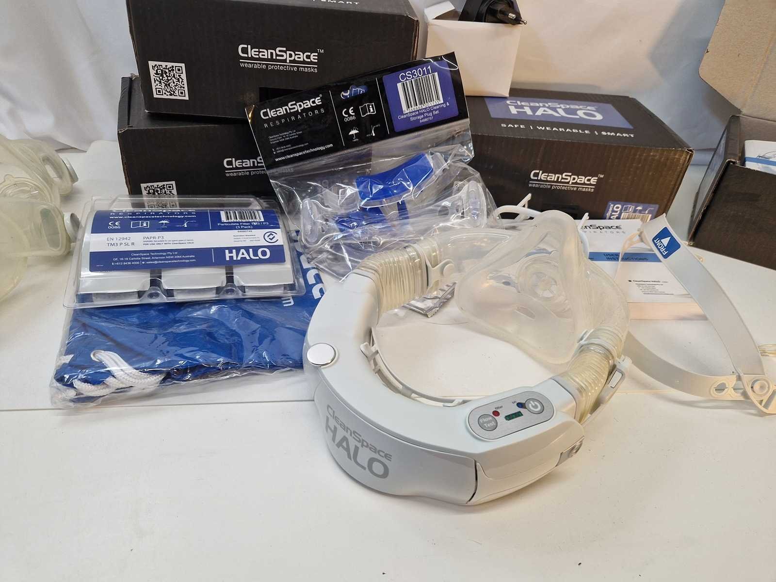 Lot de 3 masques respiratoires Halo Cleanspace CS3000. Nouveaux, dans leur boites avec tout les accessoires et filtres supplémentaires, masque visage inclus (déballés pour iventaire) Merk: Halo Model: Cleanspace CS3000