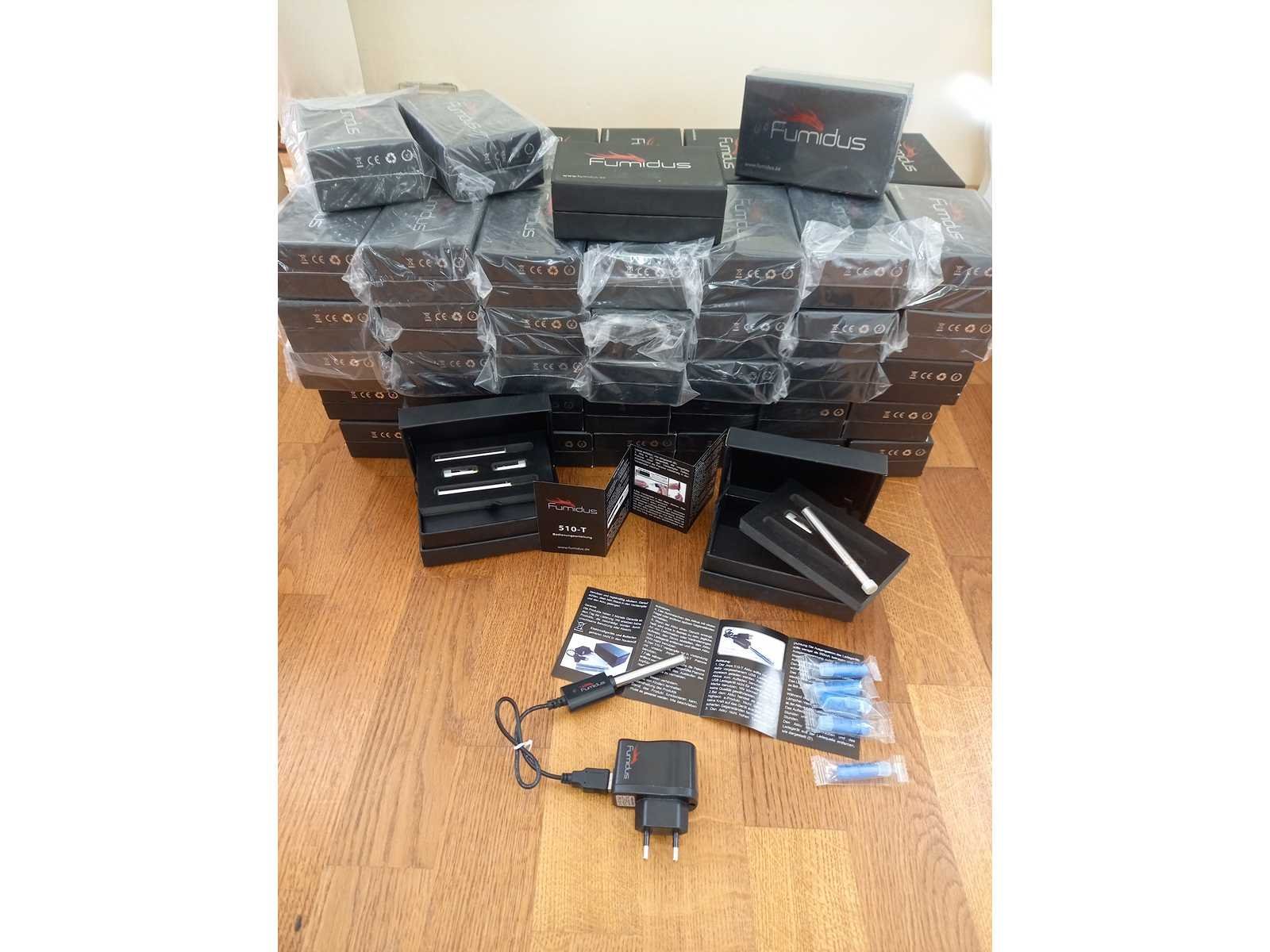 Stock de 75 kits de cigarettes électroniques de la marque Fumidus. 2 cigarettes électroniques par boîte, avec chargeur et accessoires.