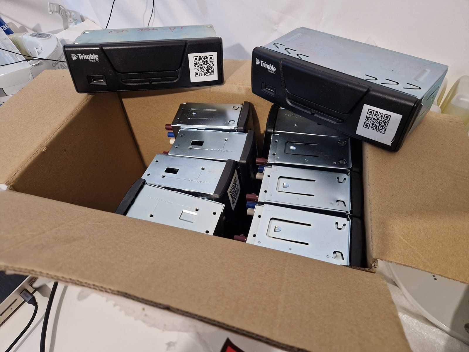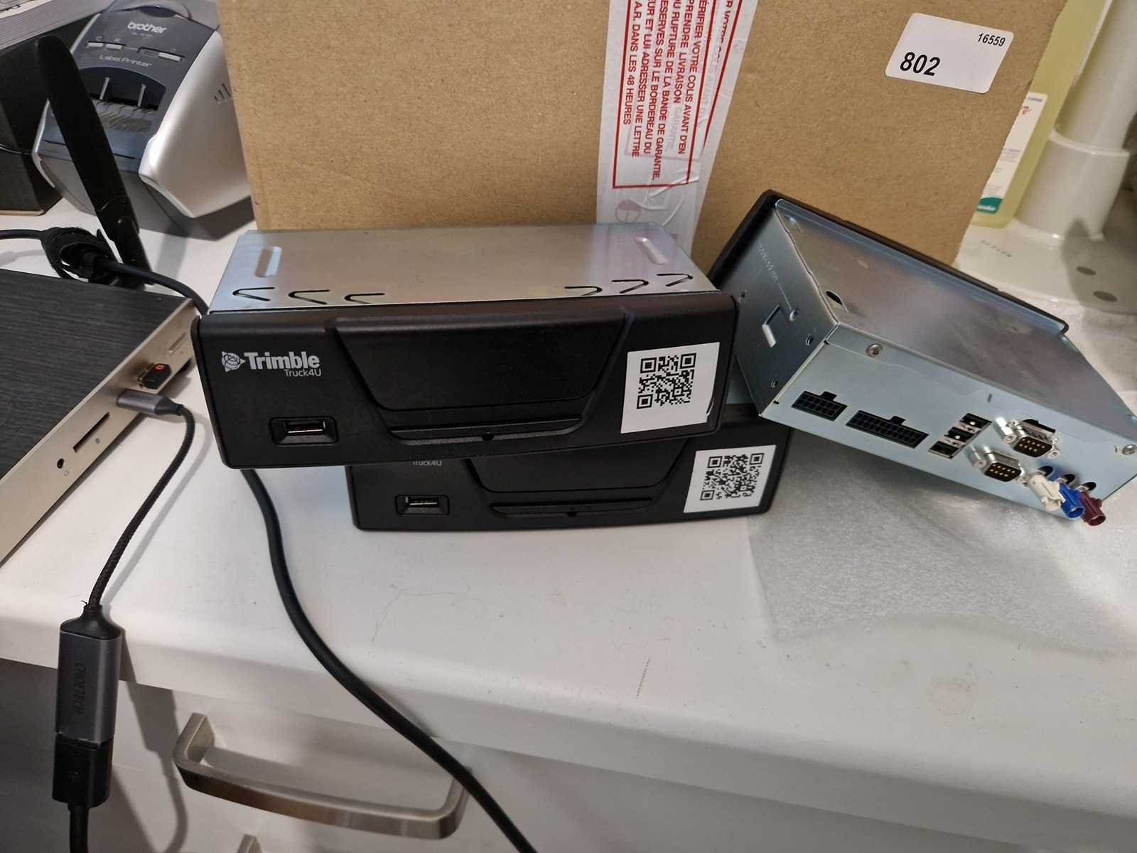 Lot de 10 ordinateurs de bord de la marque Trimble Truck4U. Conçu pour le secteur du transport et de la logistique, cet équipement au format DIN (standard autoradio) sert à la gestion de flotte en temps réel, il permet le téléchargement à distance des données du tachygraphe et de la carte conducteur. Suivi de flotte : Intègre des fonctions de géolocalisation et de suivi des heures de conduite et de repos en temps réel. Analyse de données : Collecte les données FMS du véhicule (consommation de carburant, régime moteur, etc.) et effectue des analyses du style de conduite. Connectivité : Il peut servir de point d'accès Wi-Fi dans le camion et transmettre les données au bureau via une connexion mobile. Ce module peut être utilisé seul ou combiné avec un écran tactile en cabine. Merk: Trimble Type: Truck4U