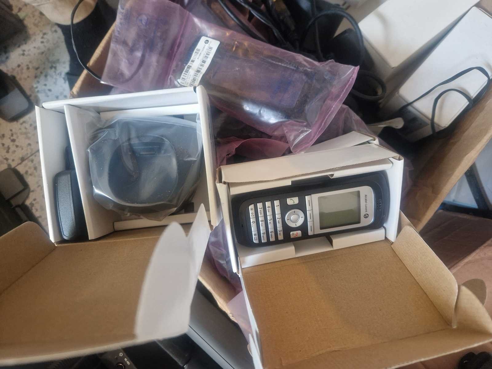 Lot de combinés Alcatel-Lucent OmniTouch 8118, téléphone sans fil professionnel fonctionnant via le réseau WLAN (Wi-Fi). Neufs et occasion avec batteries, chargeurs ,docking stations et housses de protection. Merk: Alcatel-Lucent Type: OmniTouch 8118