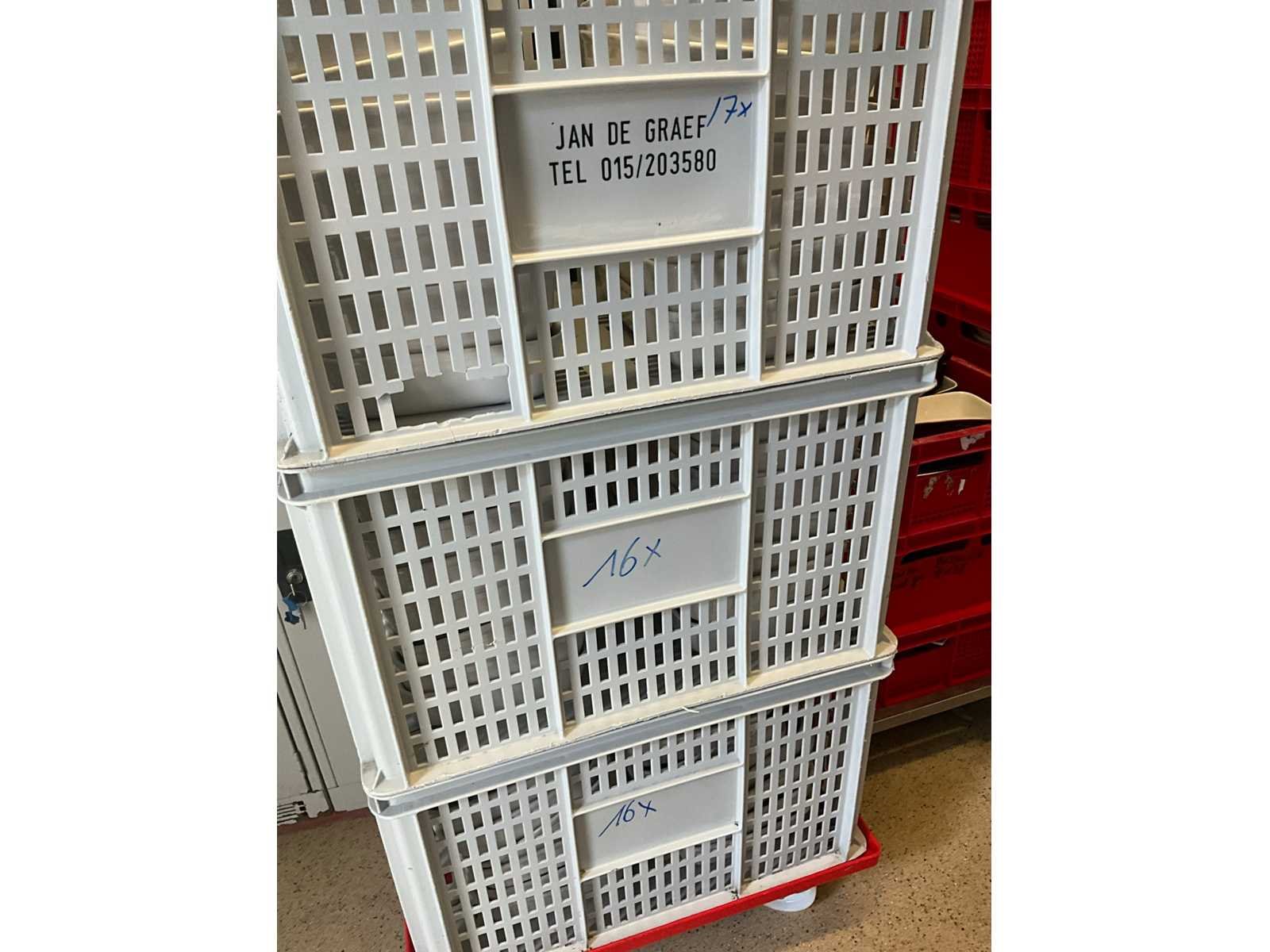 Liggende in 19 kunststof opbergbakken, compleet met 4 kunststof transportwagens